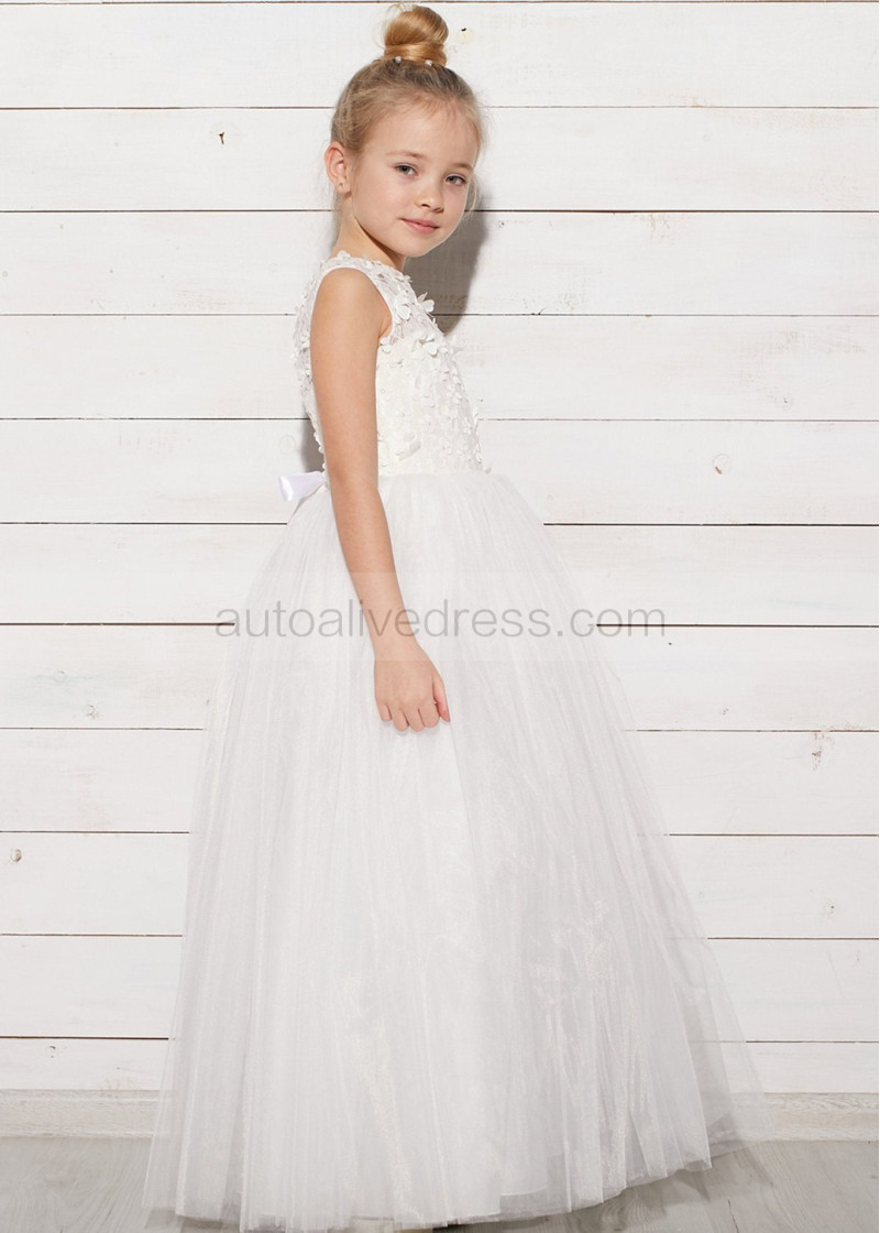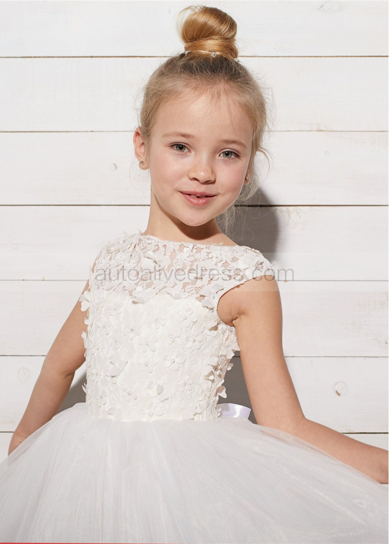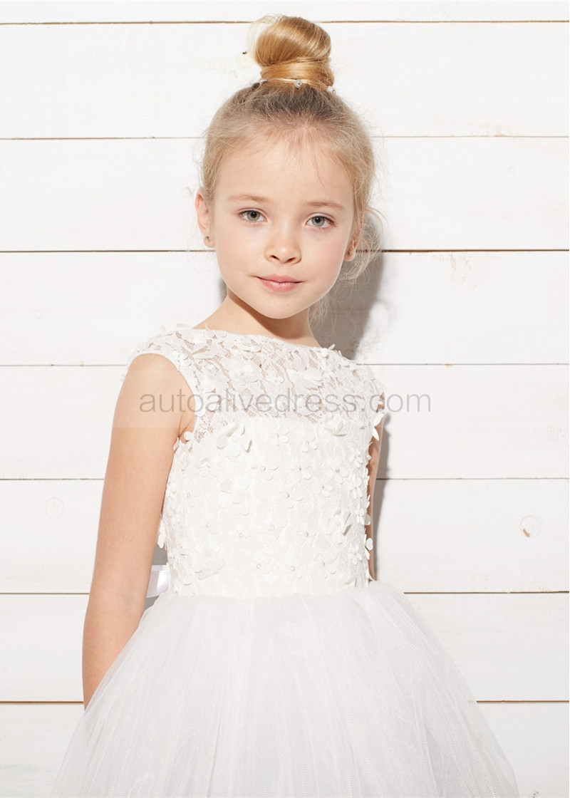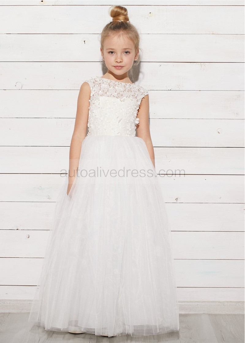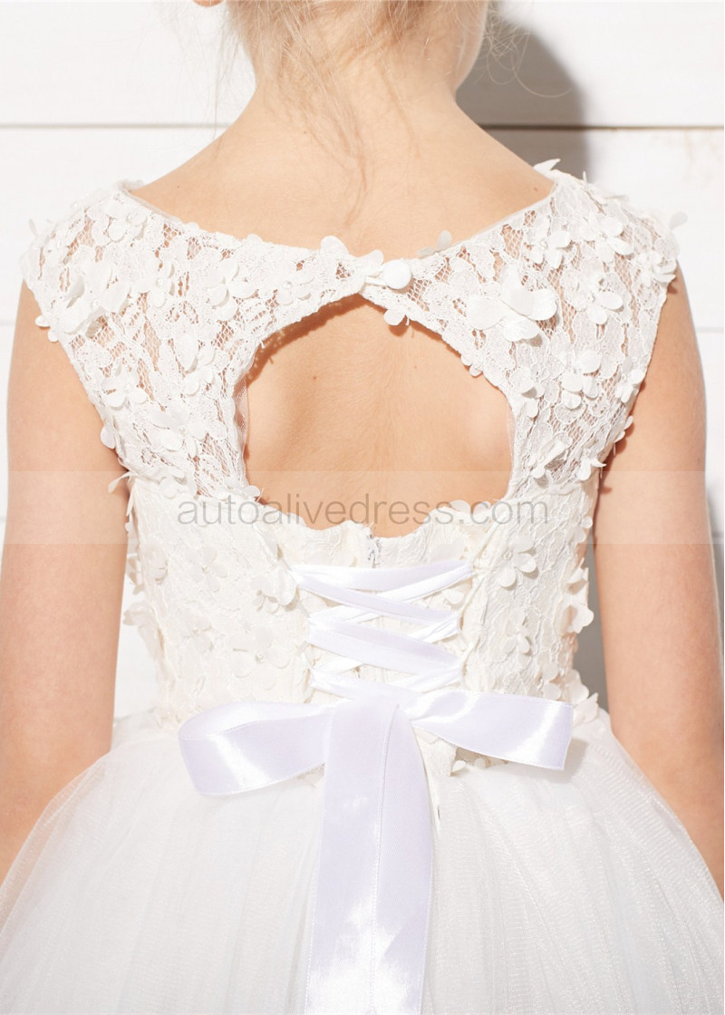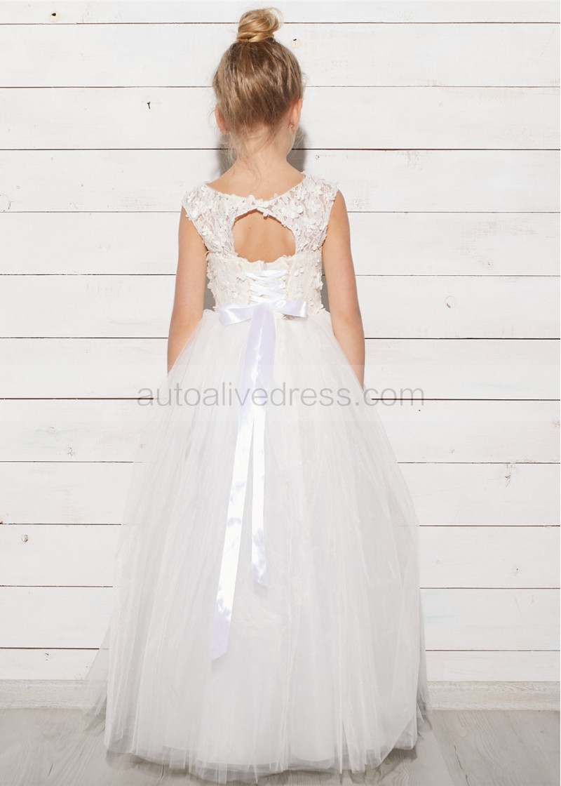 Ivory Lace Tulle 3D Flowers Keyhole Corset Back Flower Girl Dress