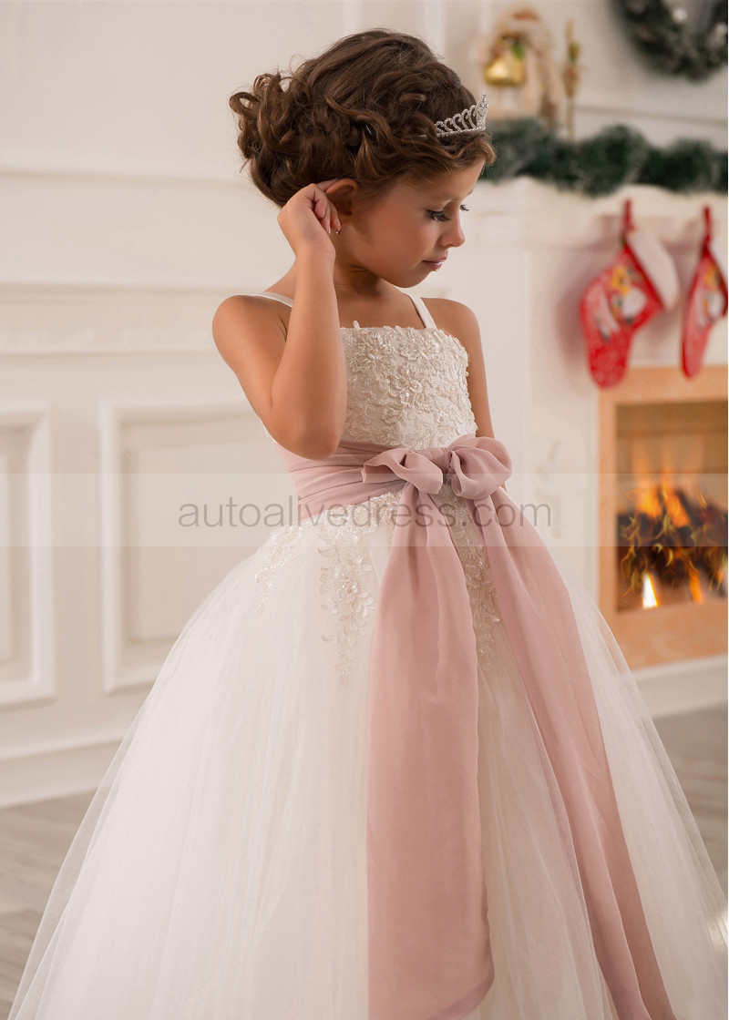 Ivory Lace Tulle Beaded Flower Girl Dress With Mauve Sash