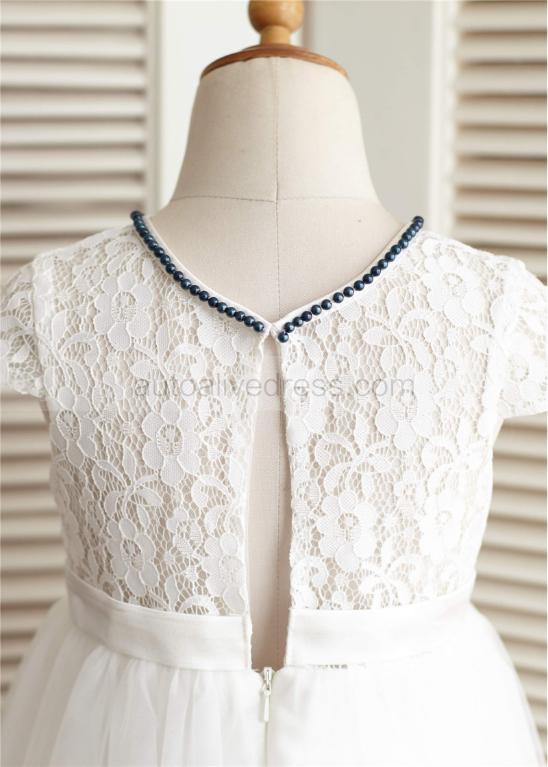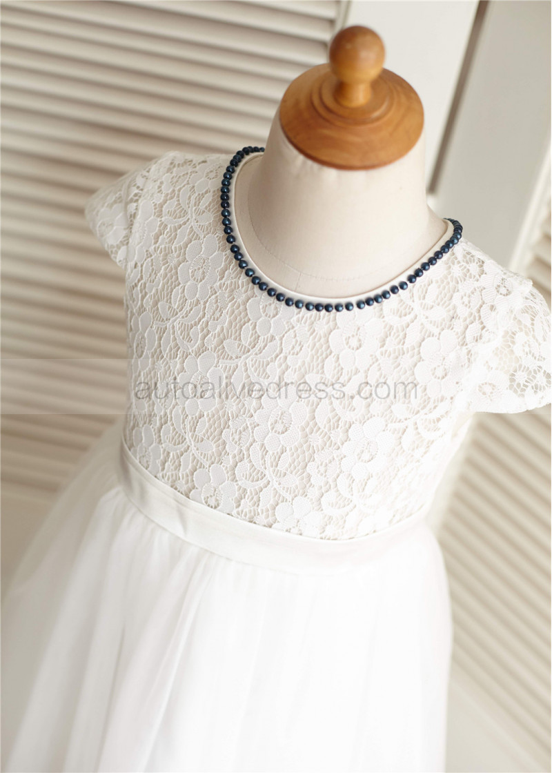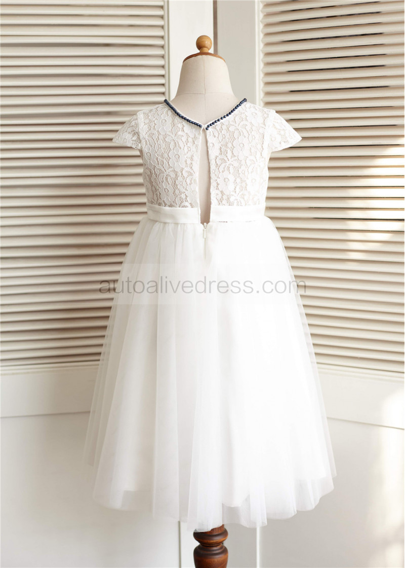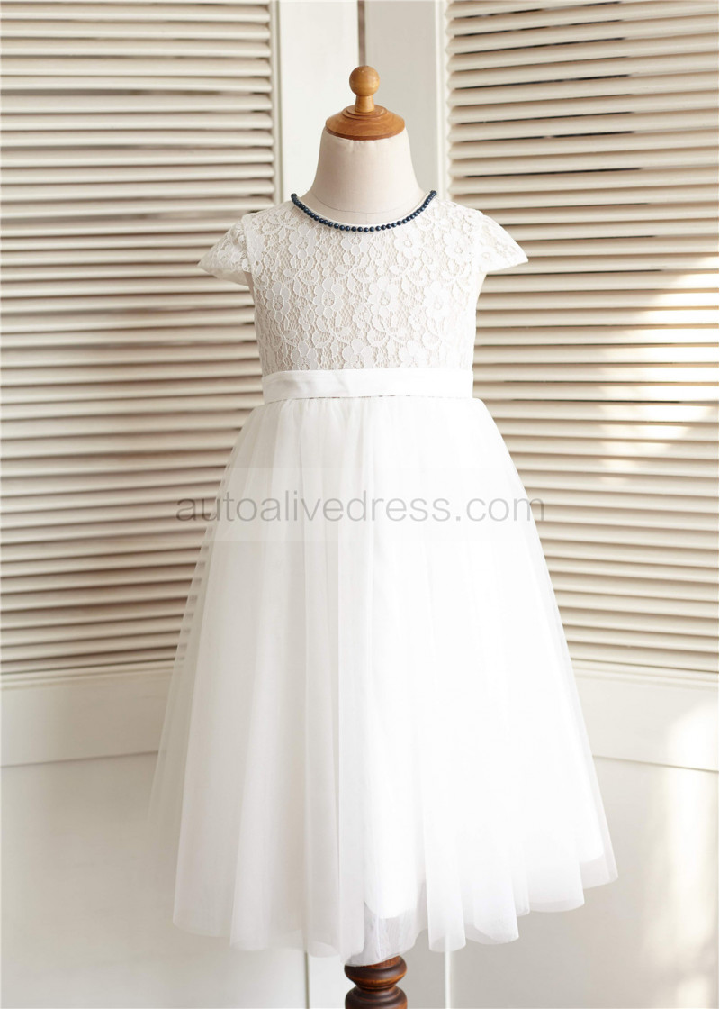 Ivory Lace Tulle Beaded Neckline Knee Length Flower Girl Dress