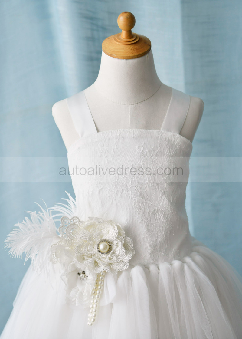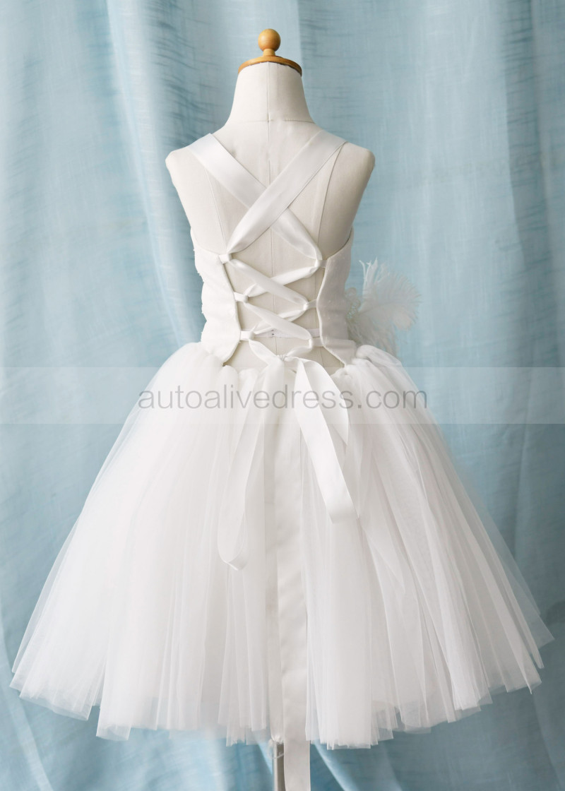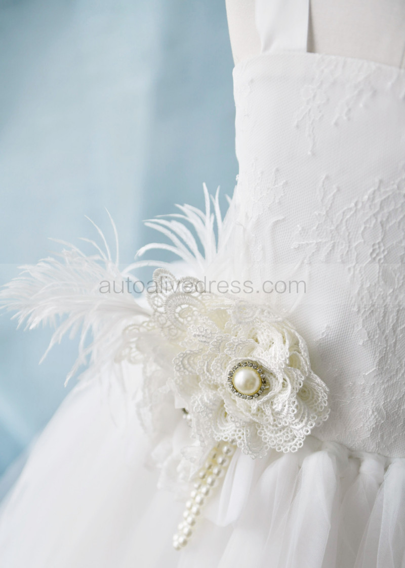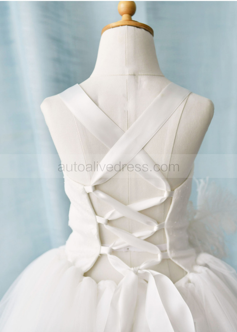 Ivory Lace Tulle Cross Back With Feather Flower Girl Dress