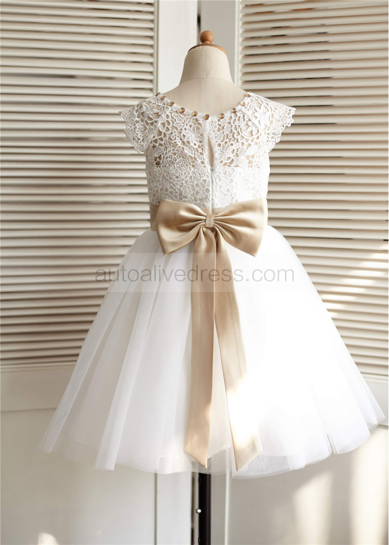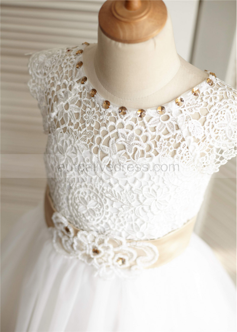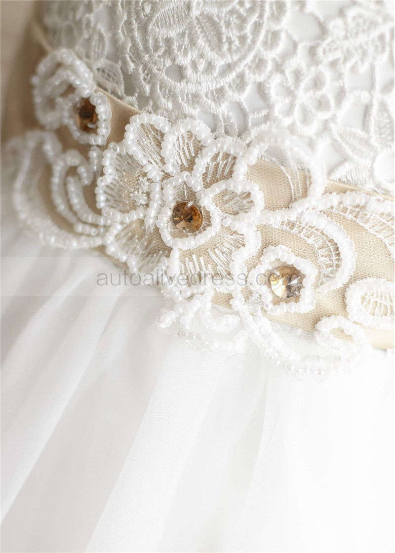 Ivory Lace Tulle Beaded Sash Knee Length Flower Girl Dress