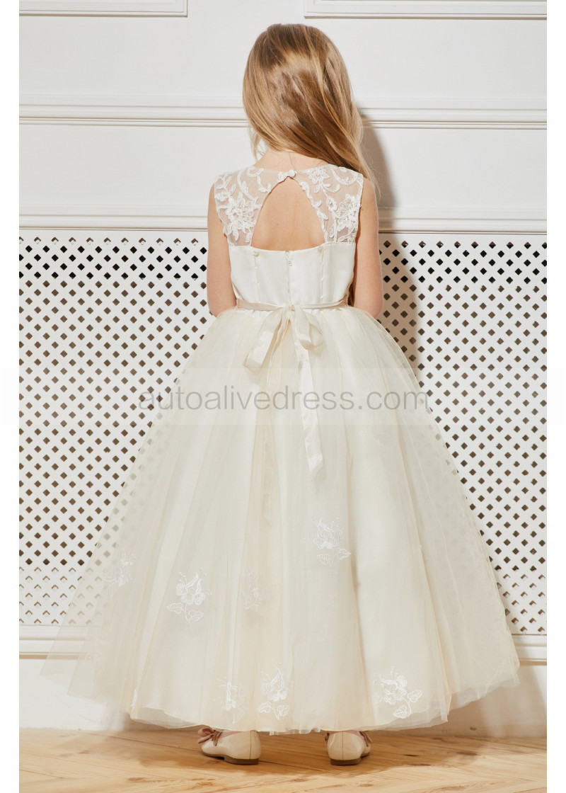 Ivory Lace Tulle Keyhole Back Ankle Length Flower Girl Dress
