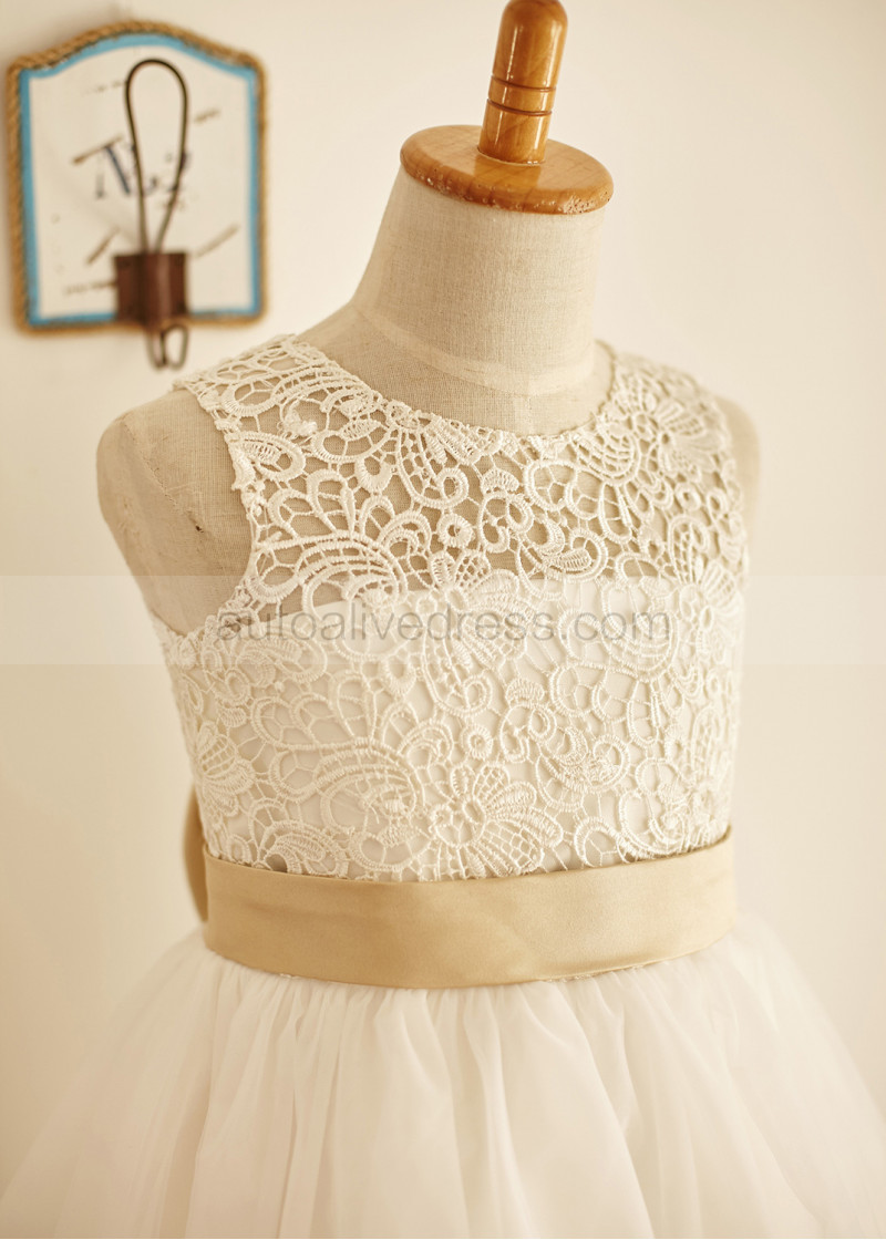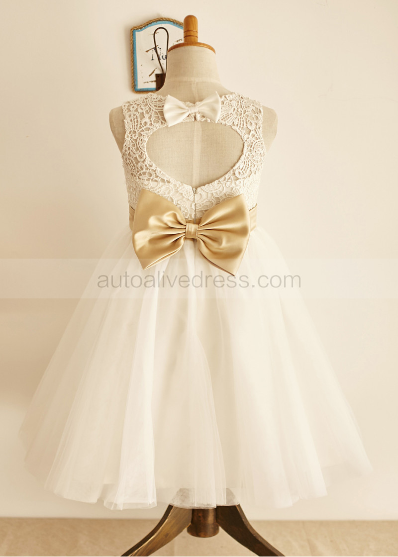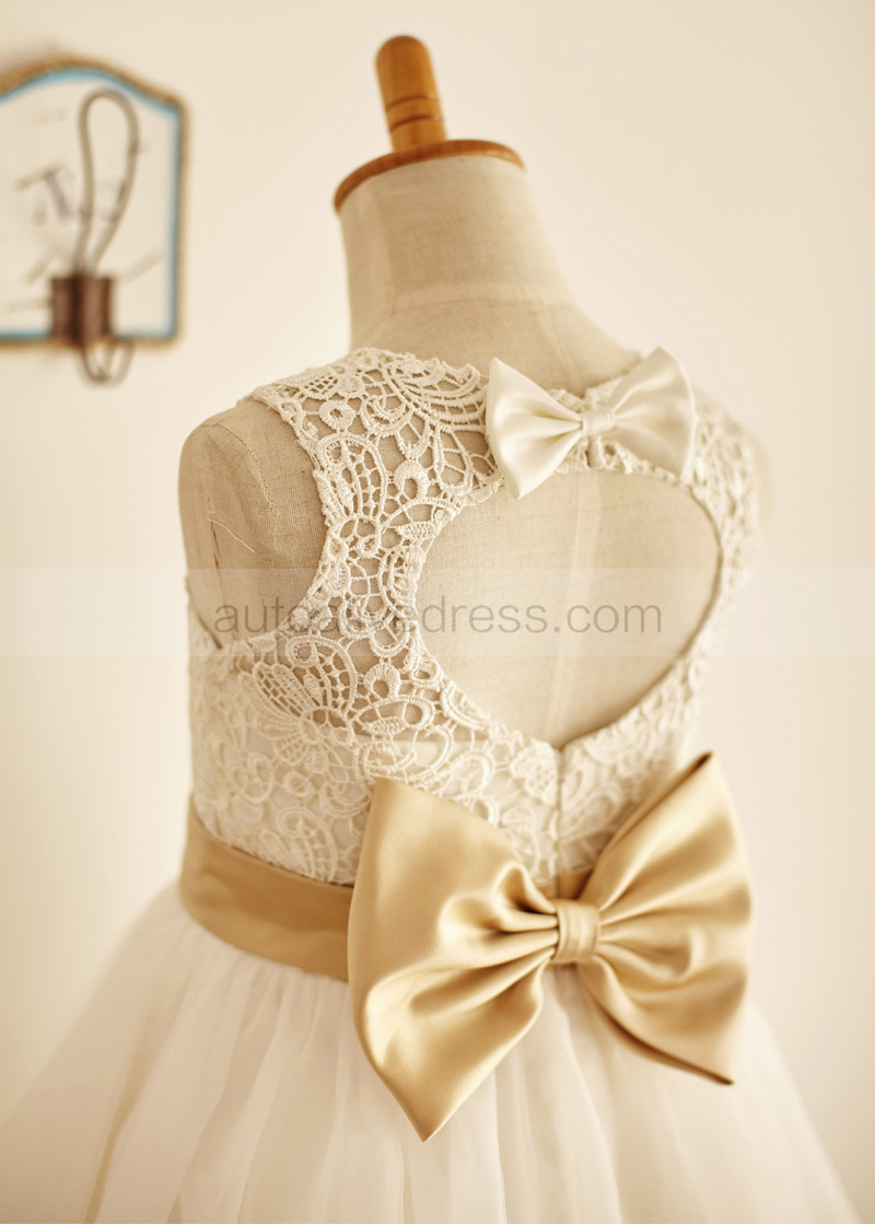 Ivory Lace Tulle Keyhole Back Flower Girl Dress With Bows