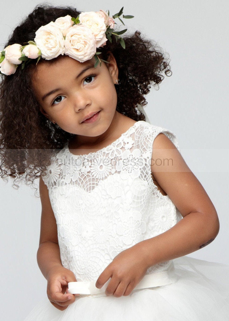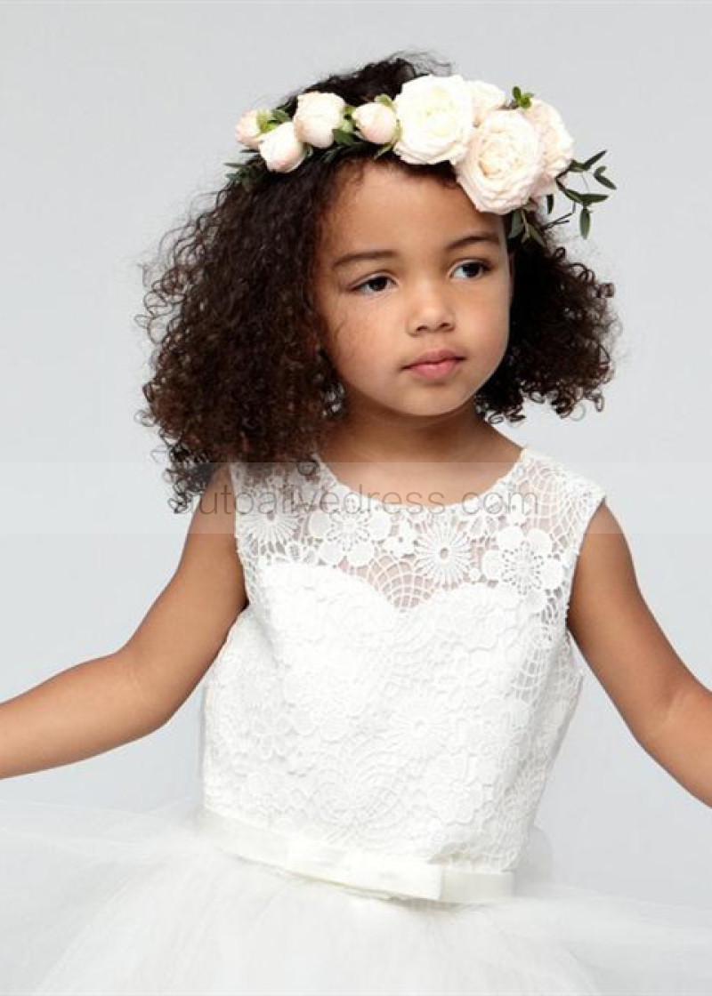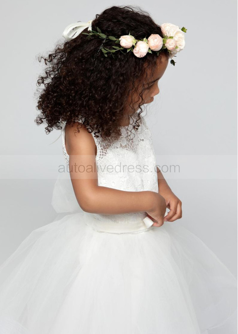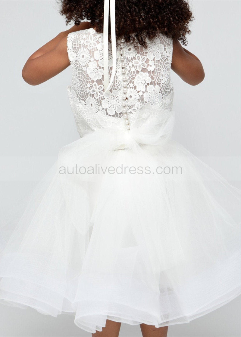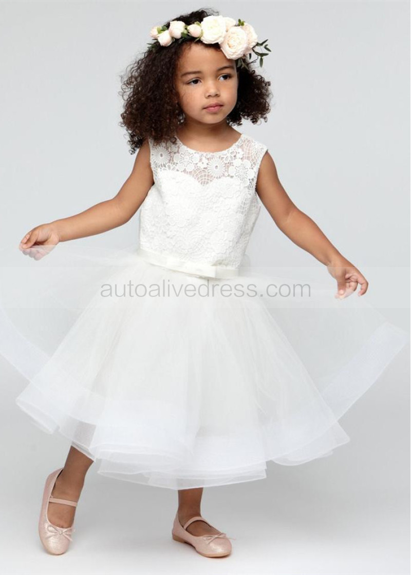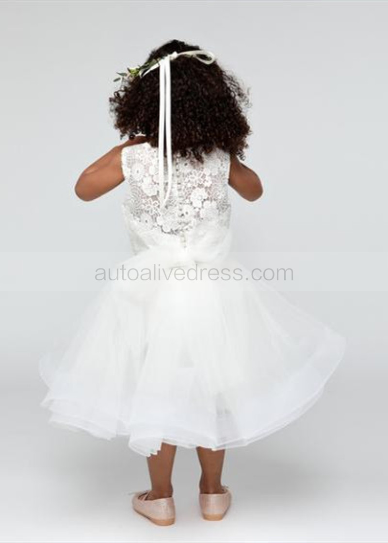Ivory Lace Tulle Pearl Buttons Back Tea Length Flower Girl Dress