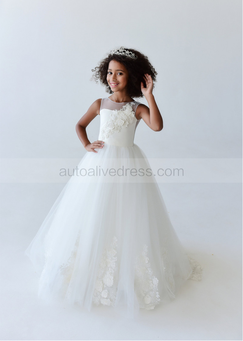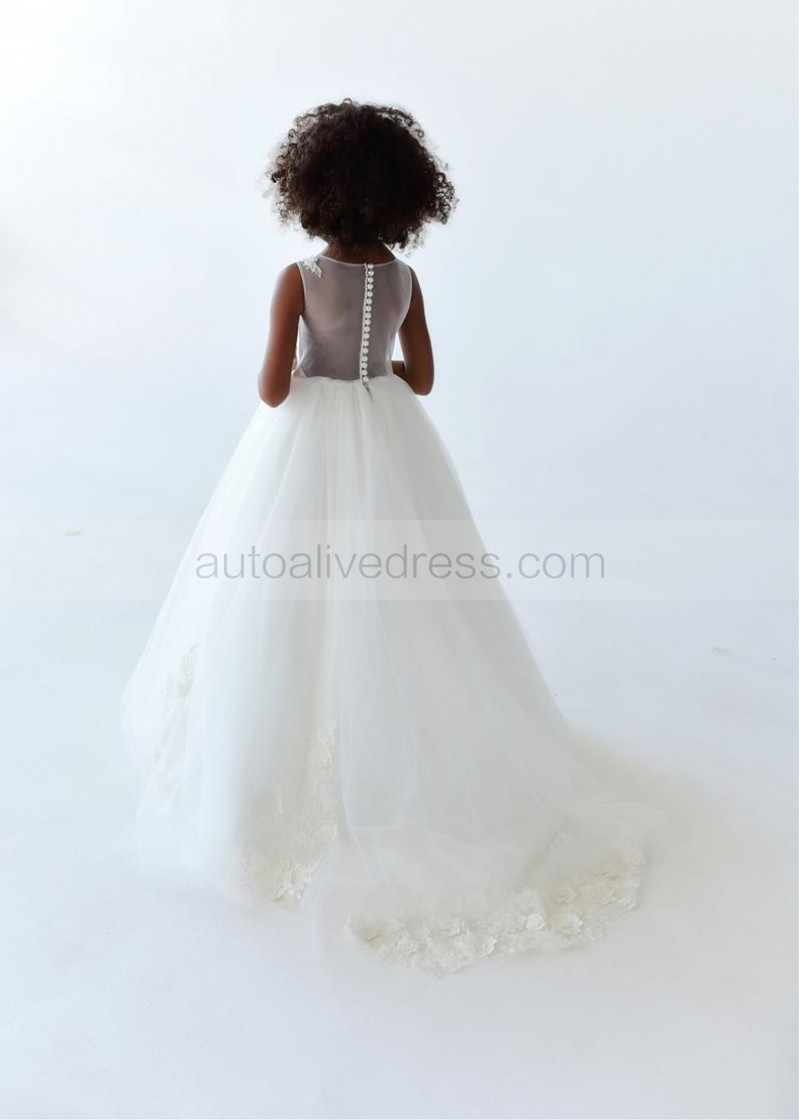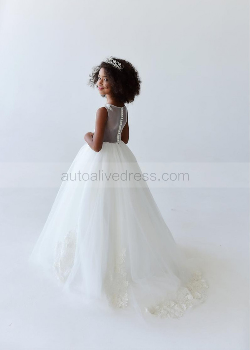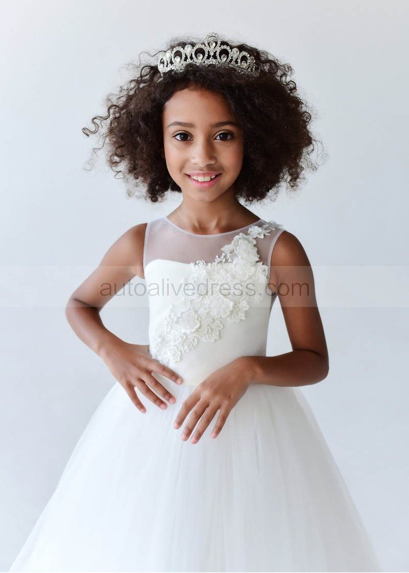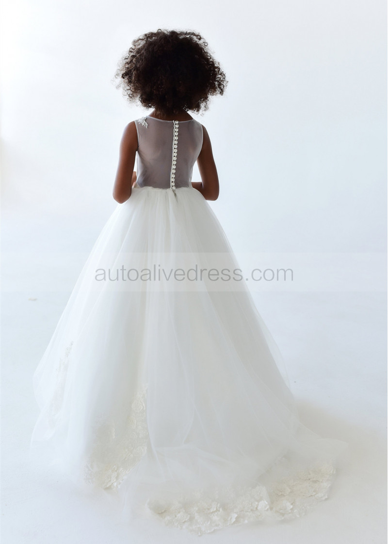 Ivory Lace Tulle Sheer Back Floor Length Flower Girl Dress