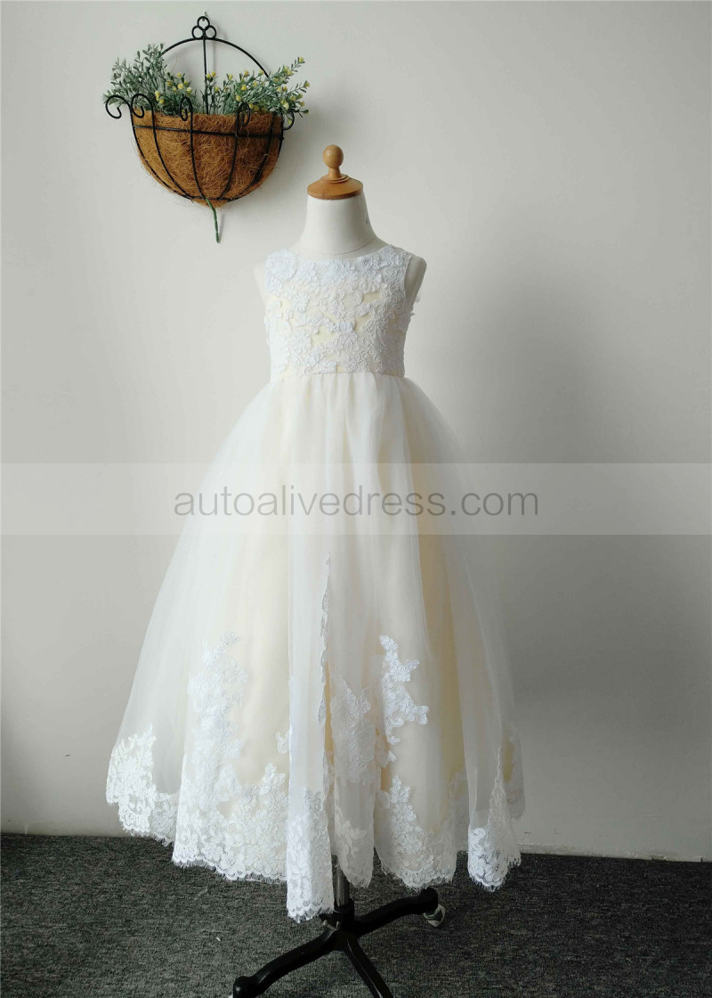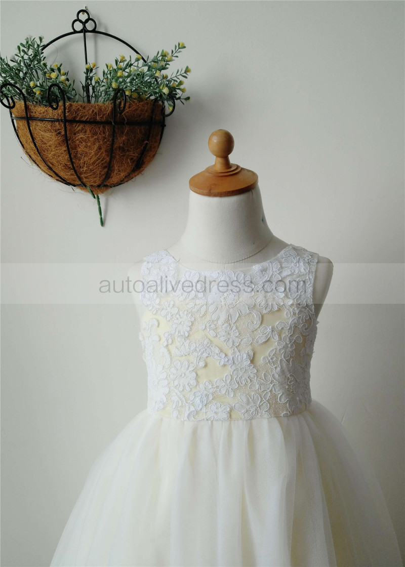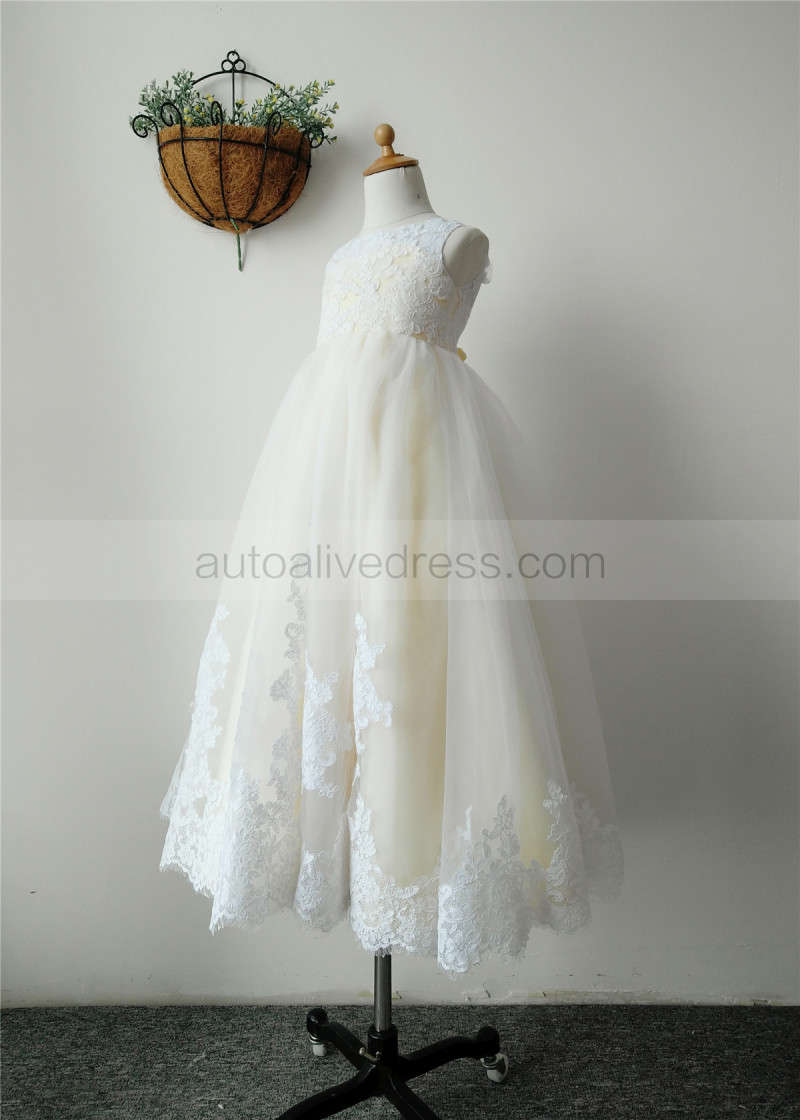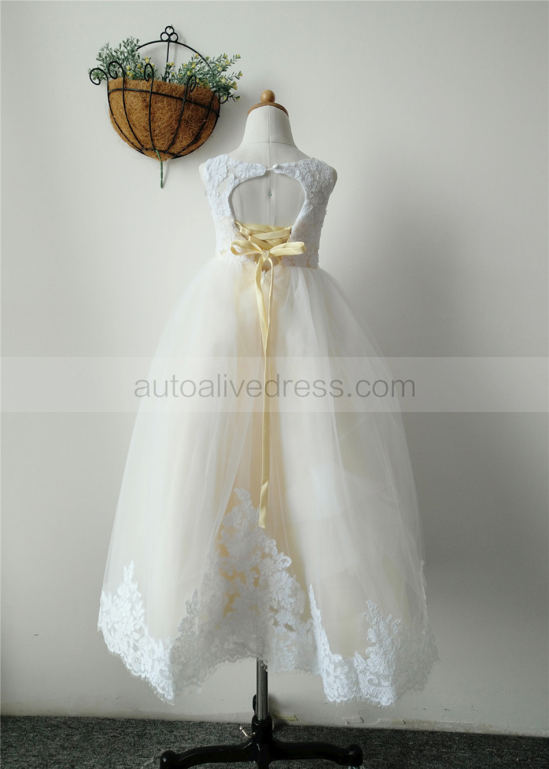 Ivory Lace Tulle With Yellow Lining Floor Length Flower Girl Dress