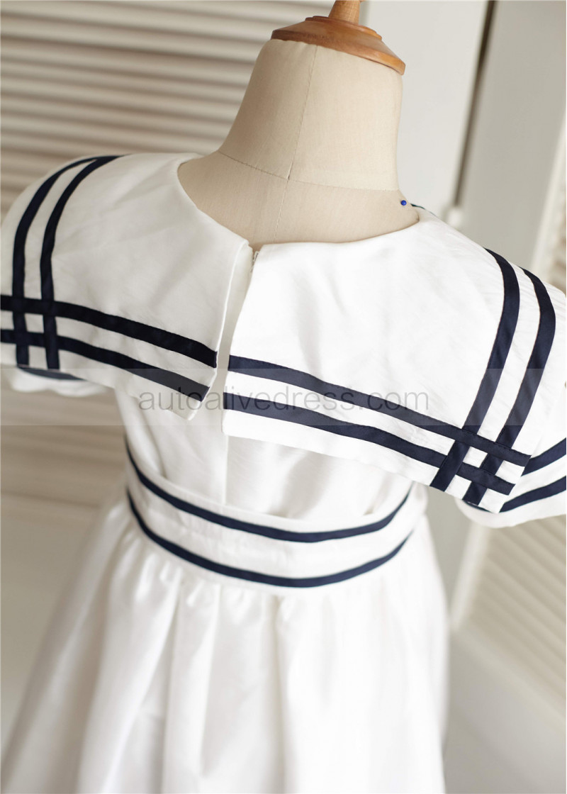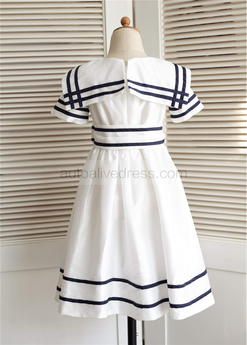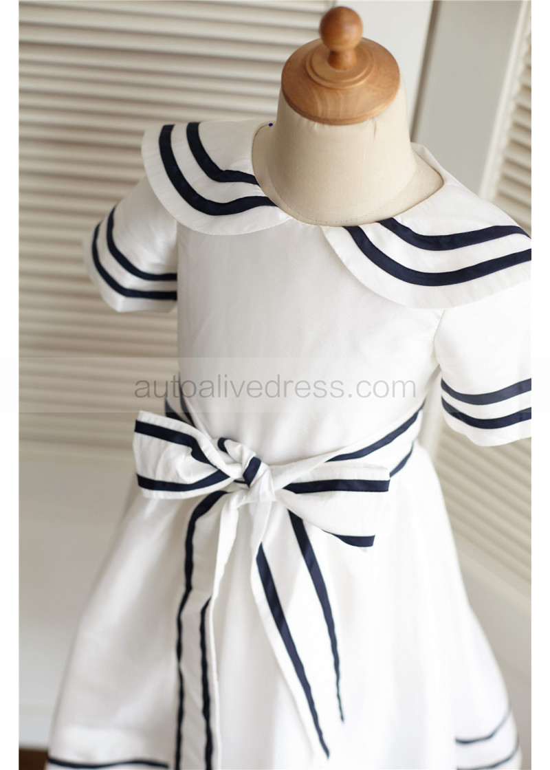 Ivory Navy Blue Stripe Taffeta Knee Length Flower Girl Dress