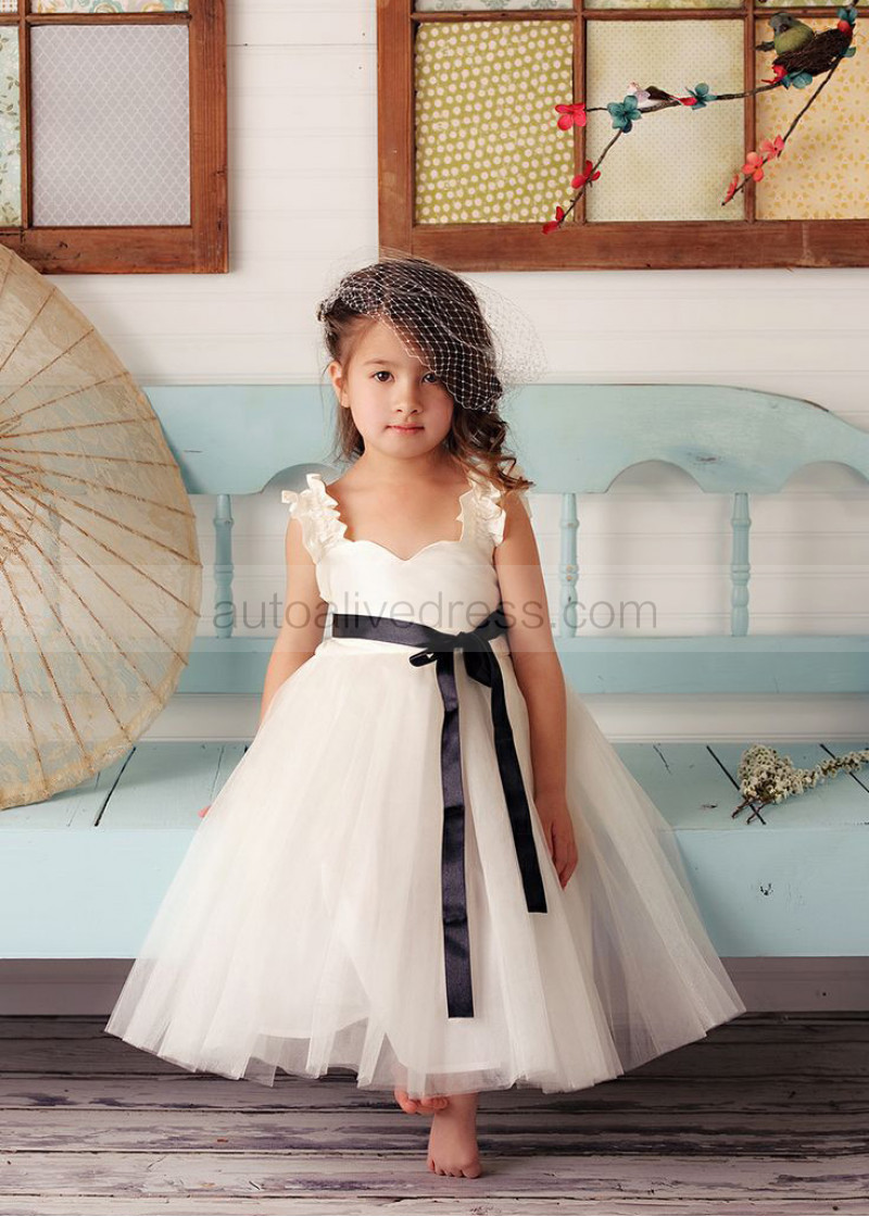 Ivory Satin Champagne Tulle Ruffle Straps Flower Girl Dress