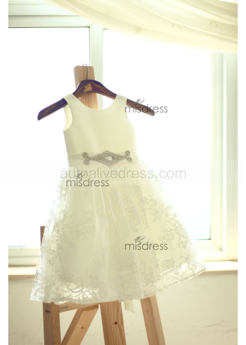 Ivory Satin Lace On-trend Flower Girl Dress With Beaded Sash
