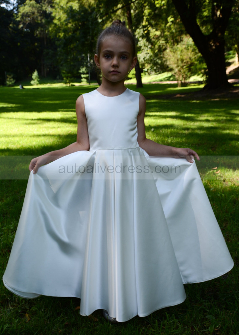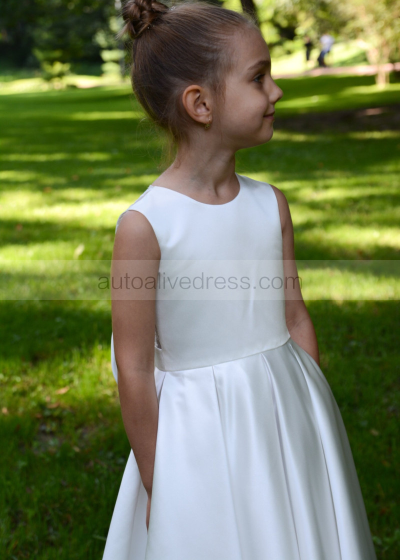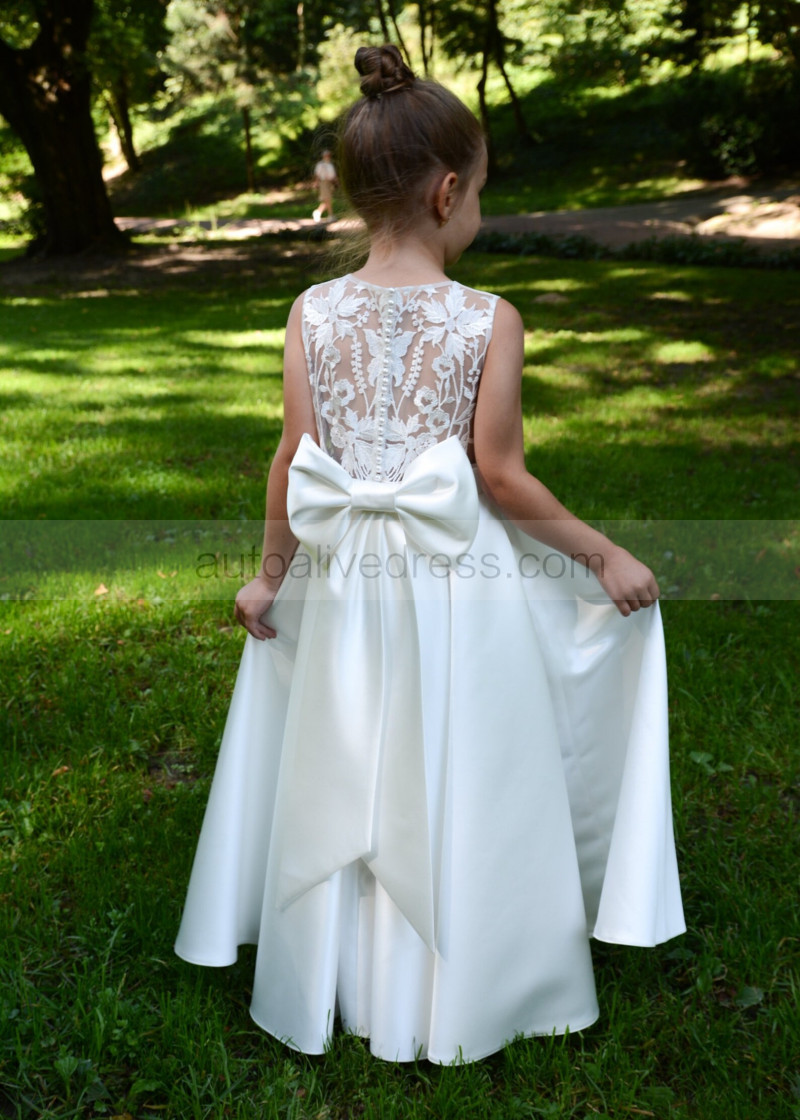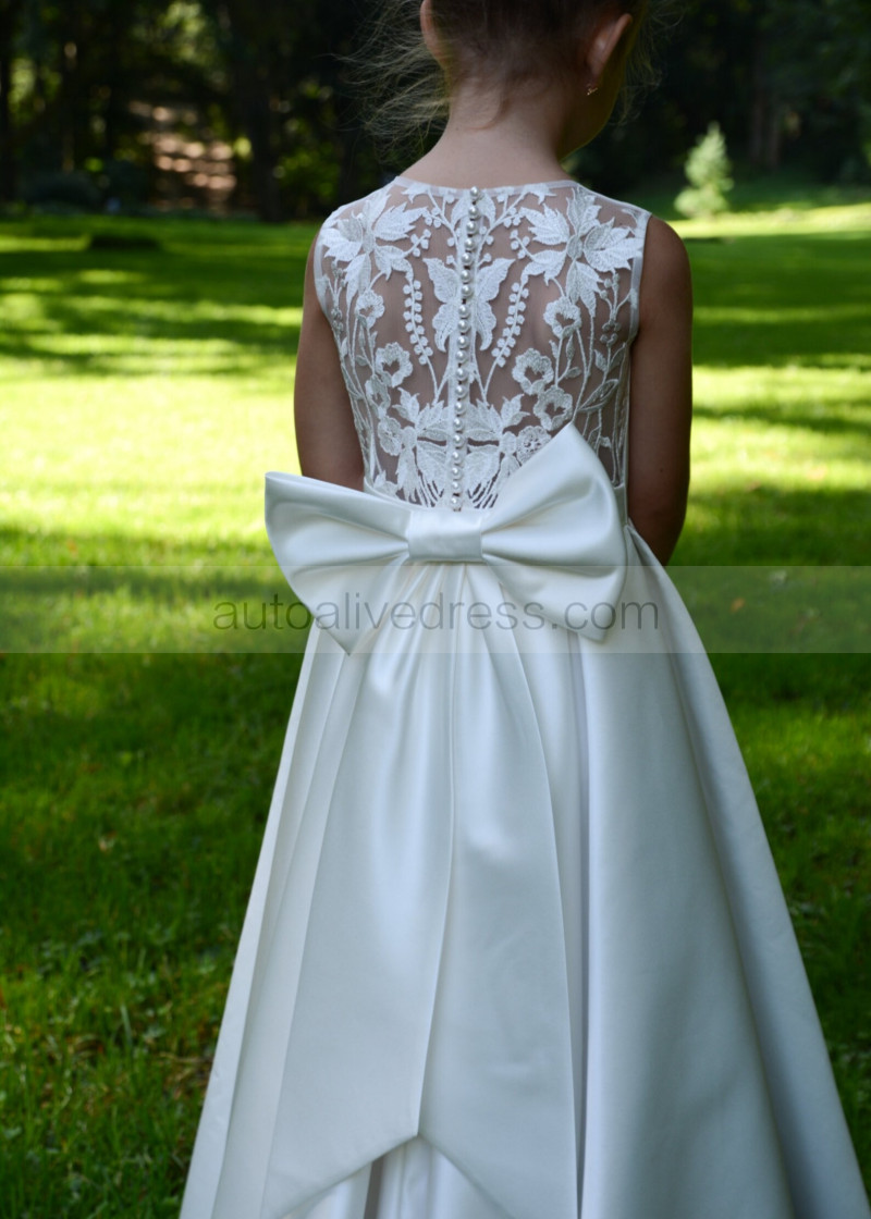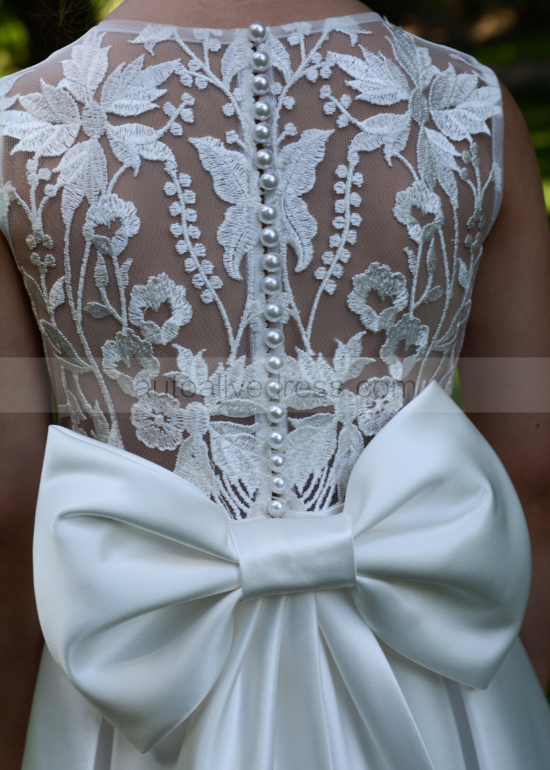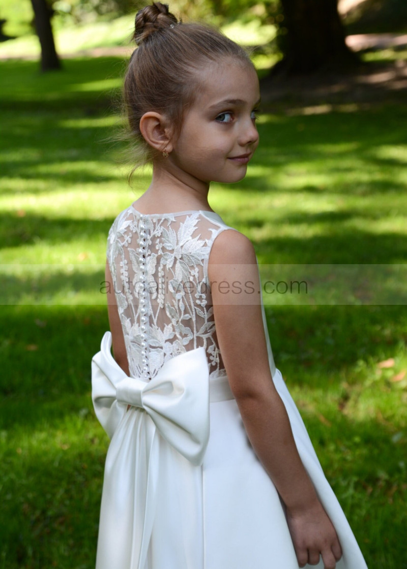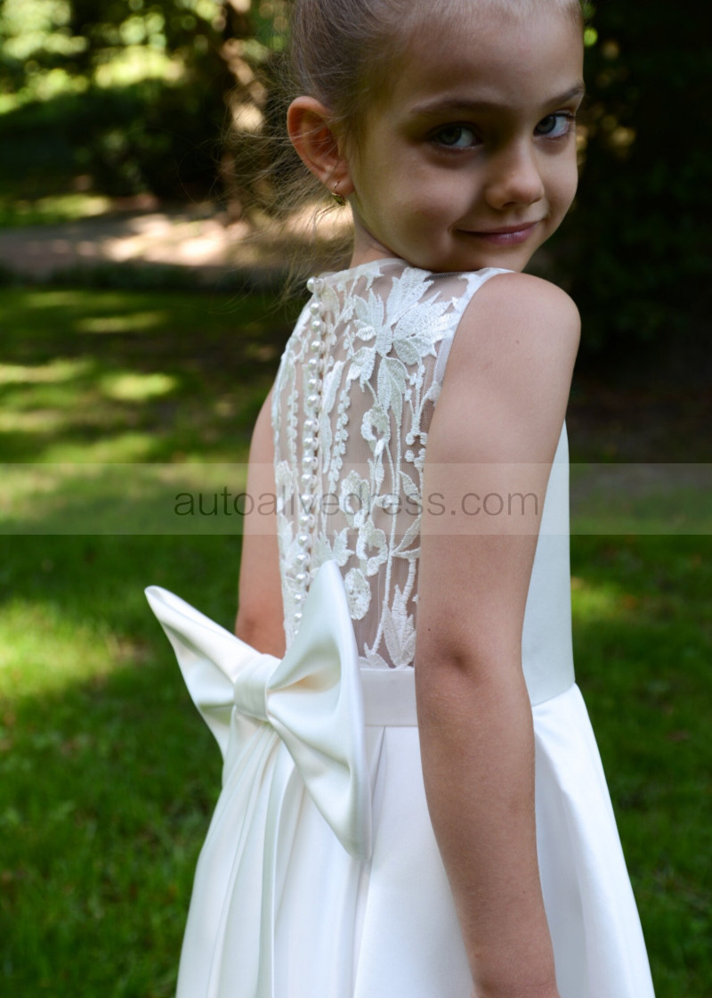 Ivory Satin Lace Pearl Buttons Back Classic Flower Girl Dress