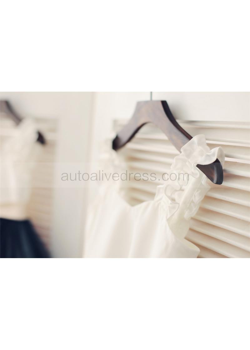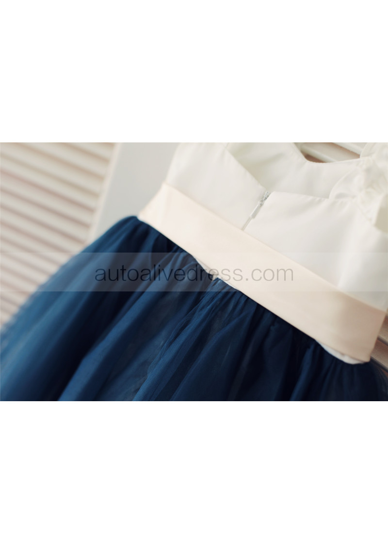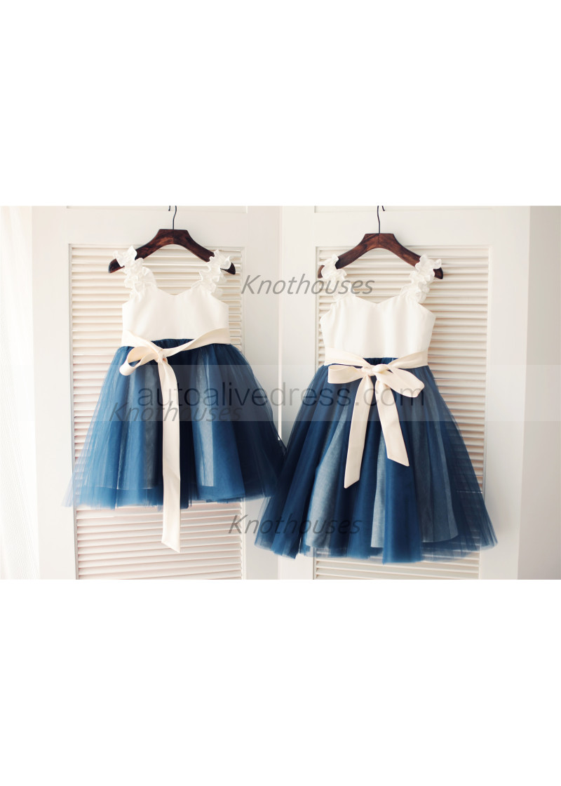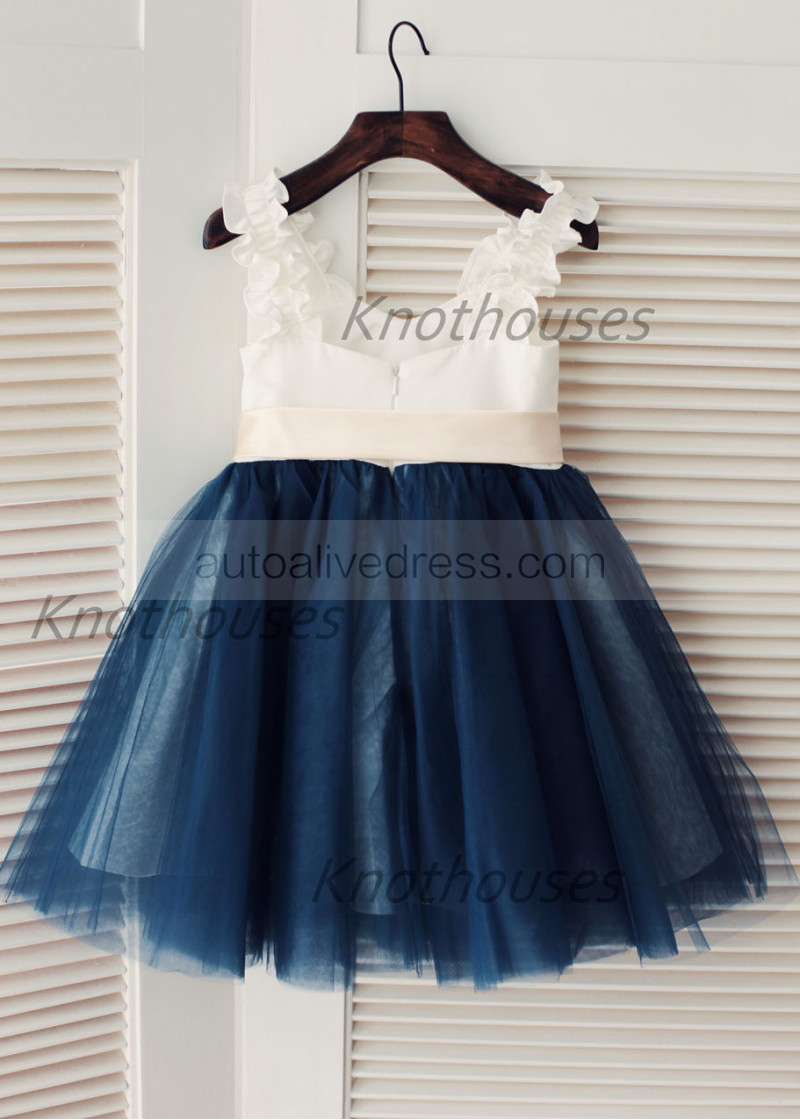 Ivory Satin Navy Blue Tulle Ruffle Straps Flower Girl Dress