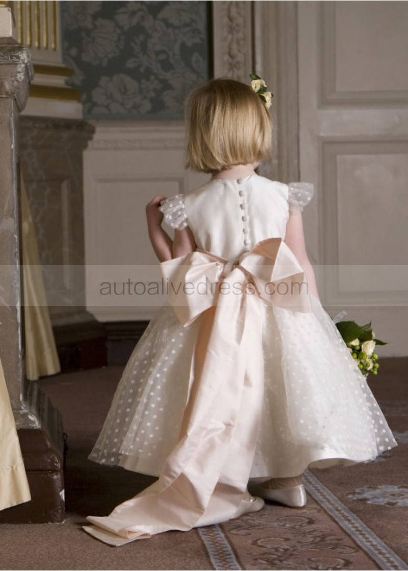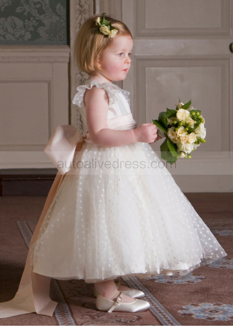 Ivory Satin Polka Dots Tulle Knee Length Flower Girl Dress