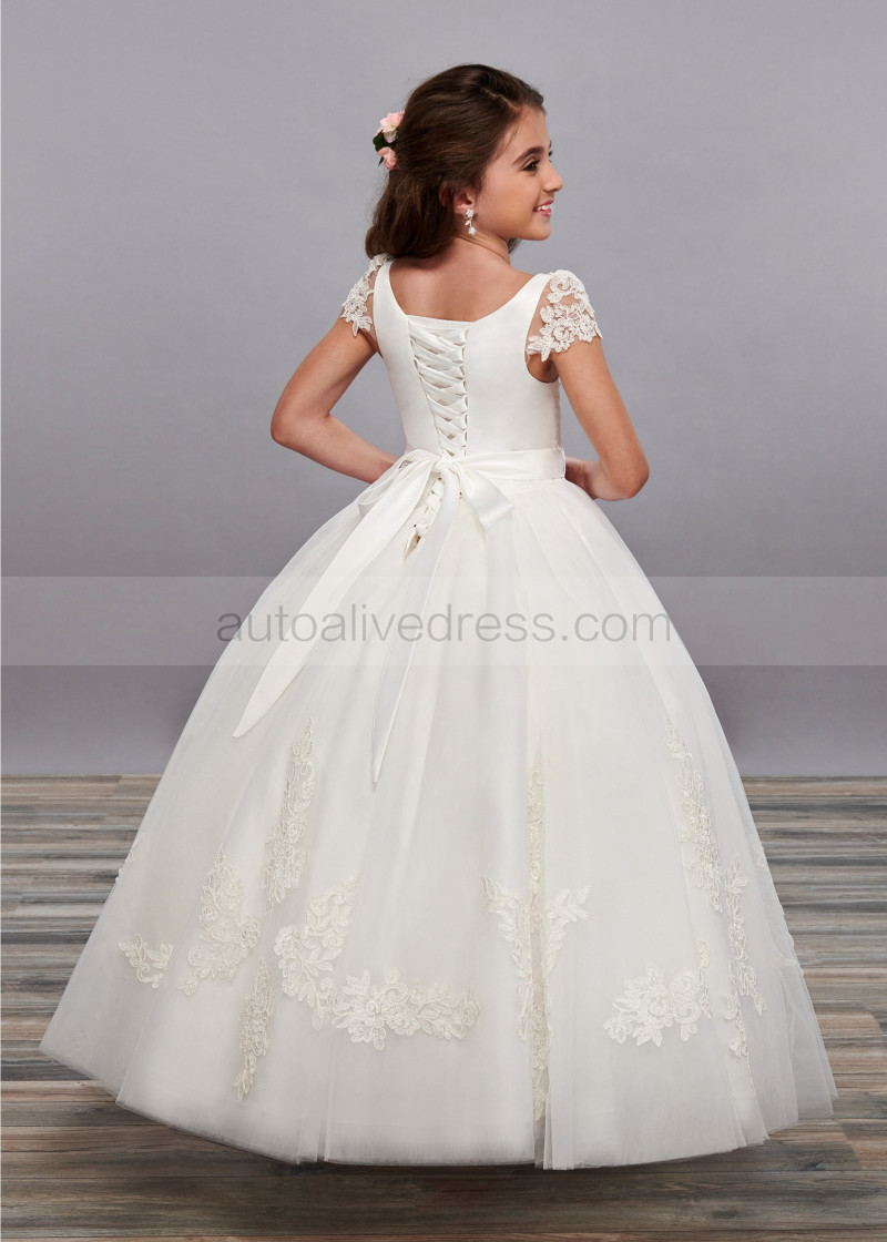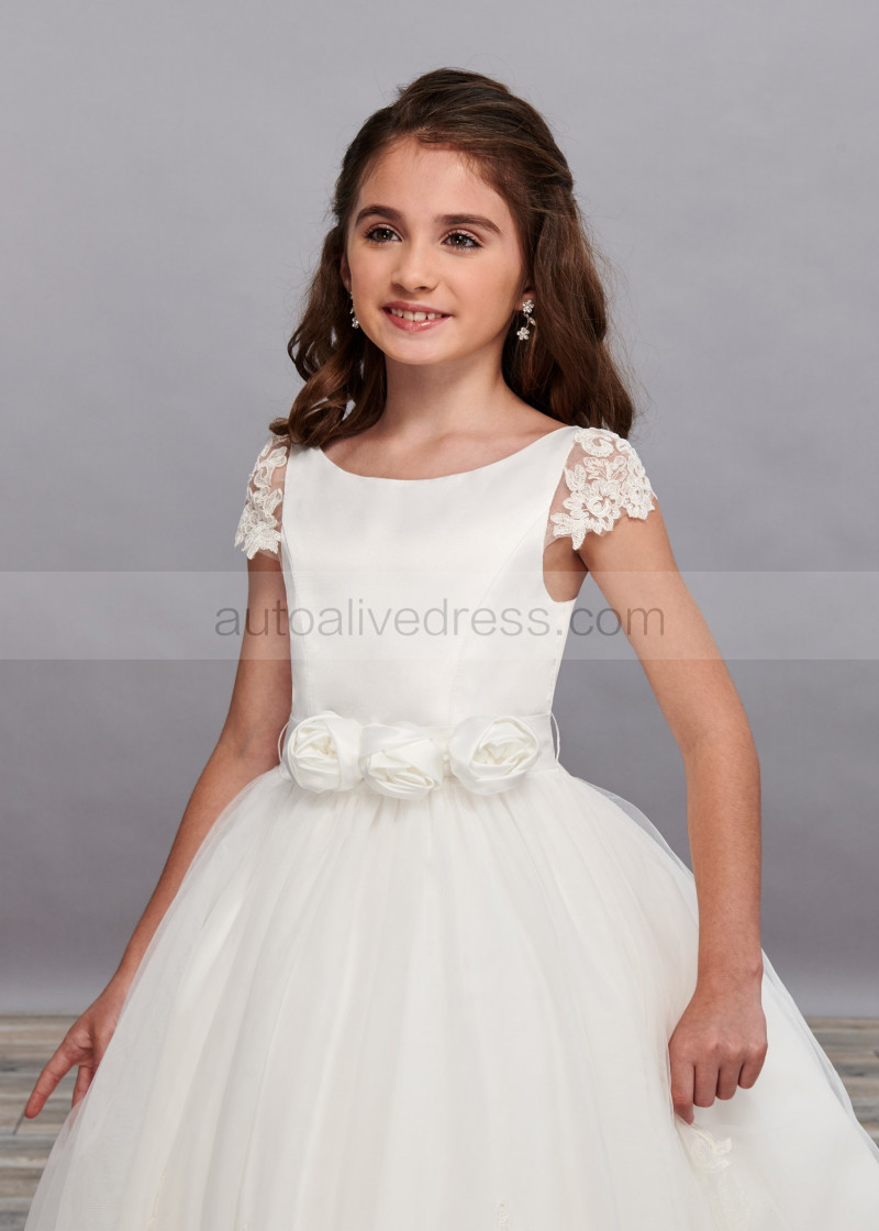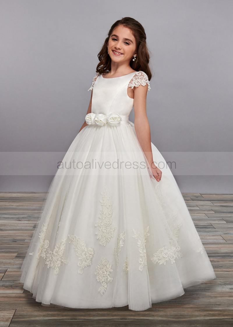 Ivory Satin Tulle Flower Girl Dress With Floral Belt