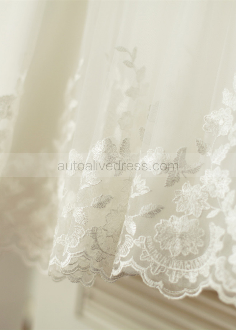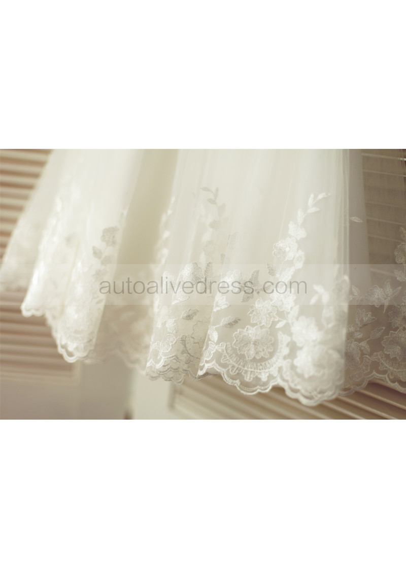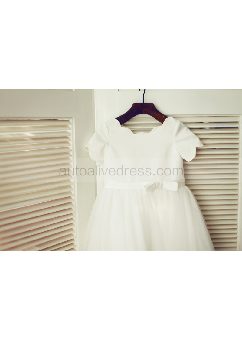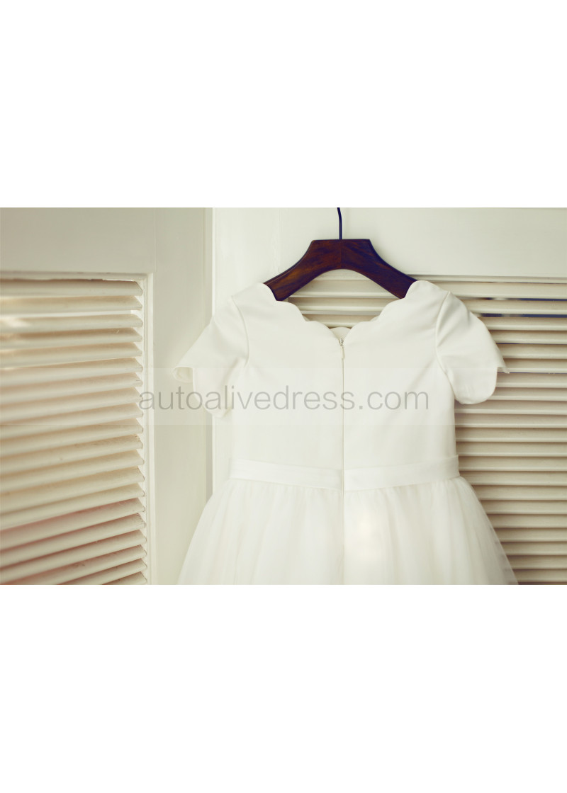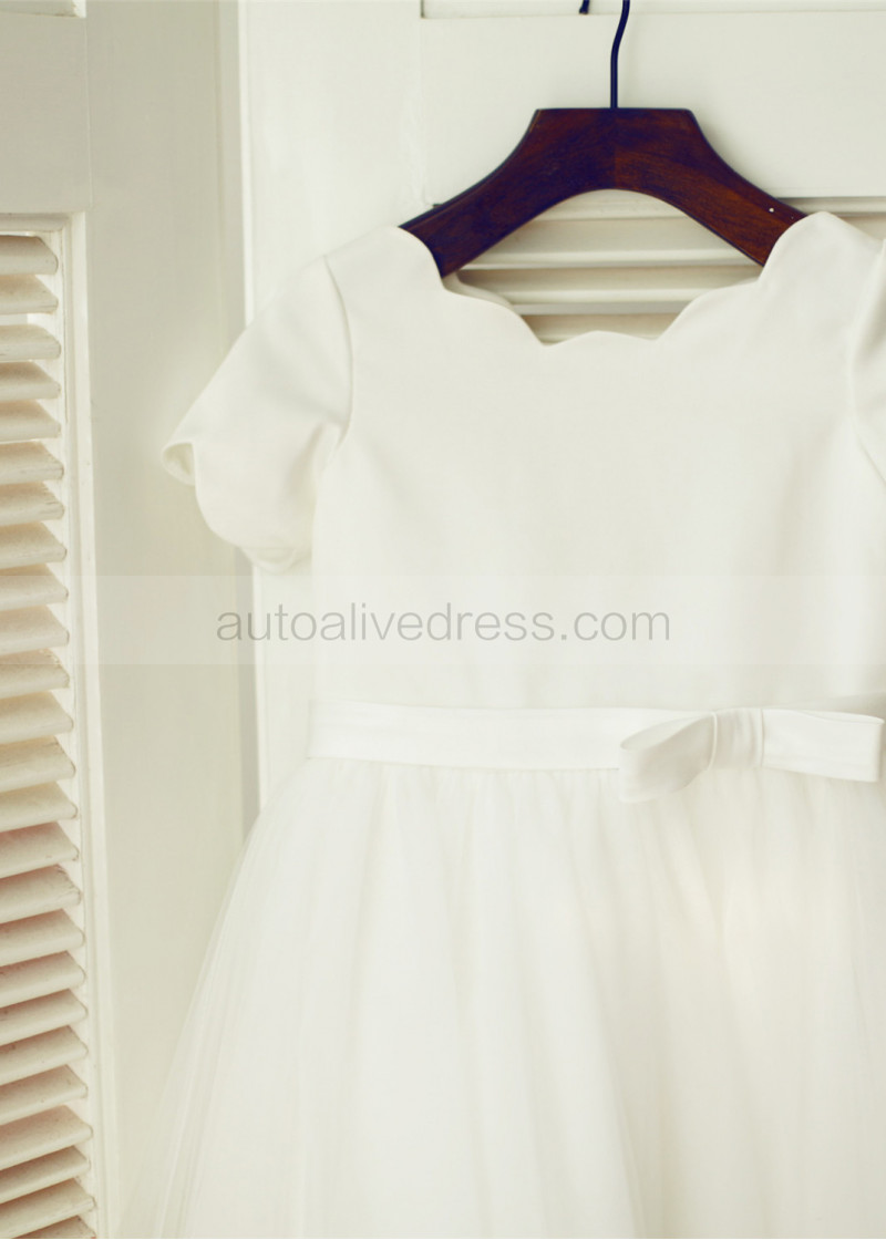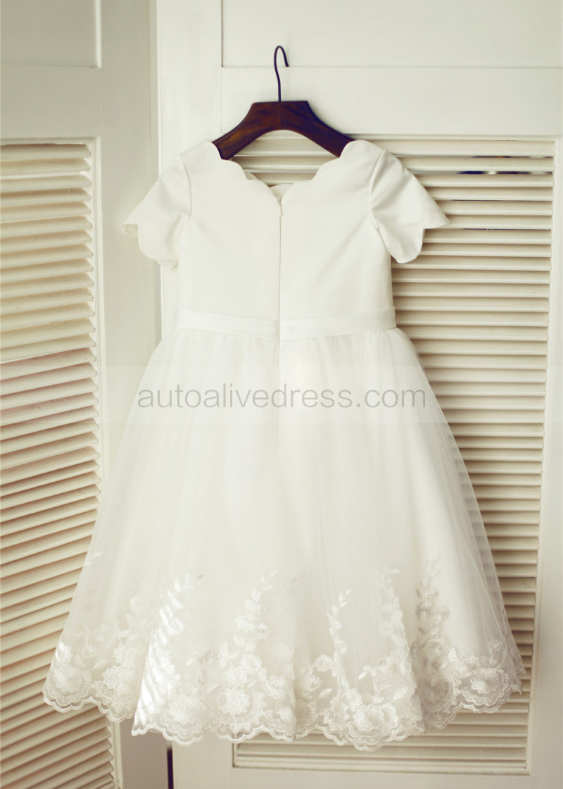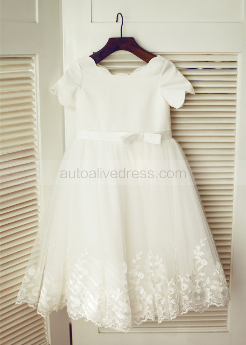 Ivory Satin Tulle Lace Scalloped Neckline Knee Length Flower Girl Dress