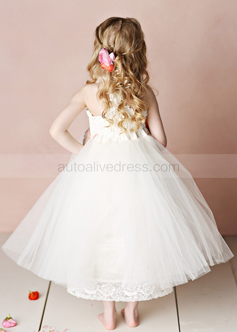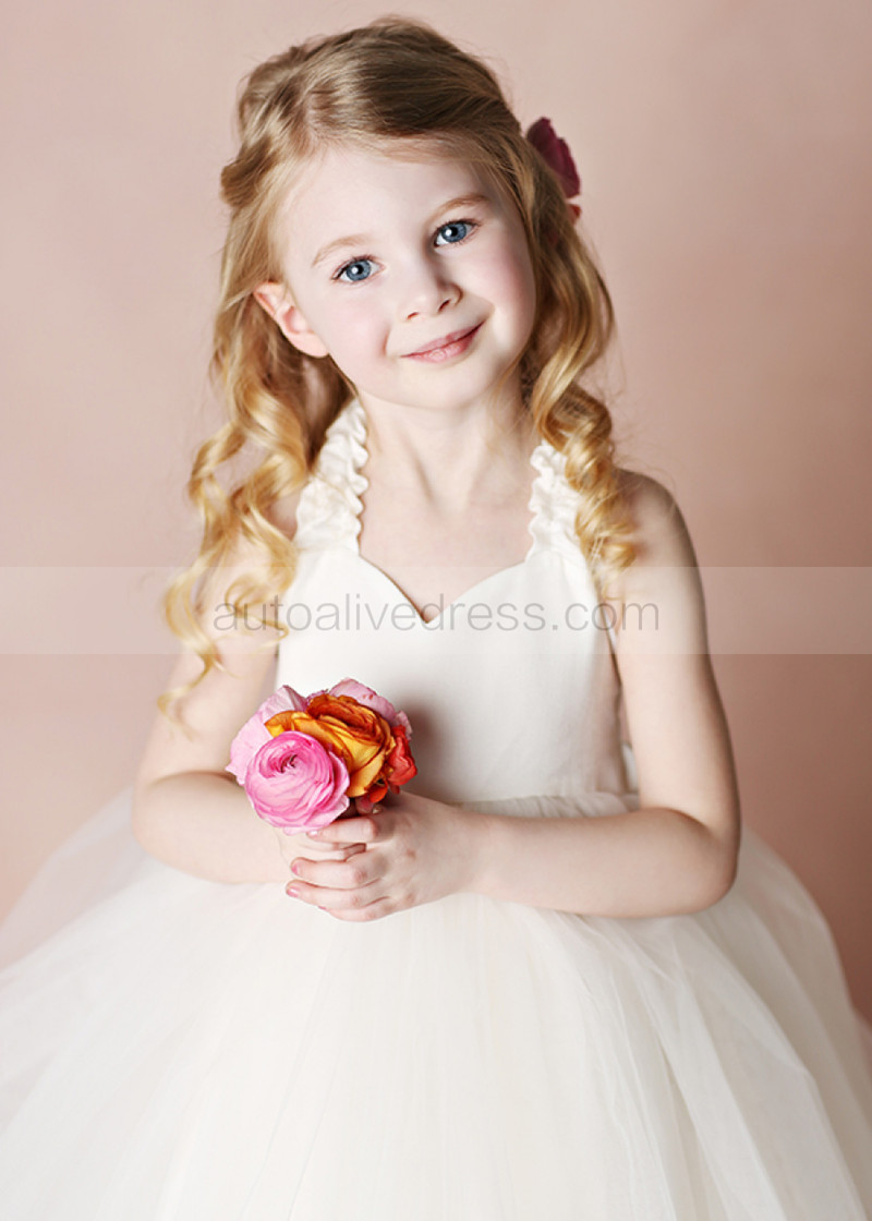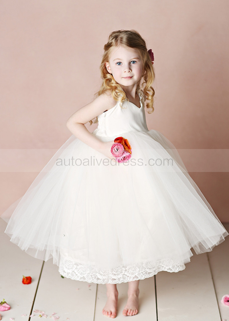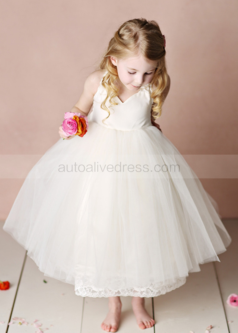 Ivory Satin Tulle Tea Length Cross Back Simple Flower Girl Dress