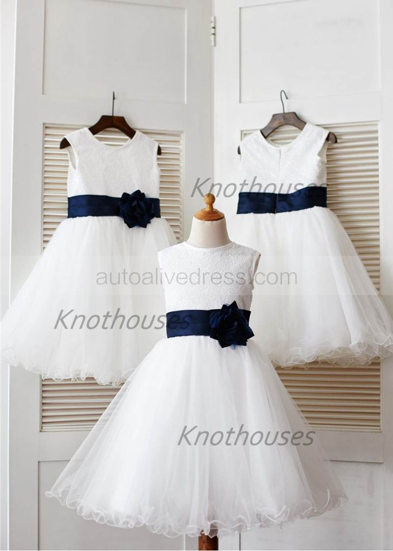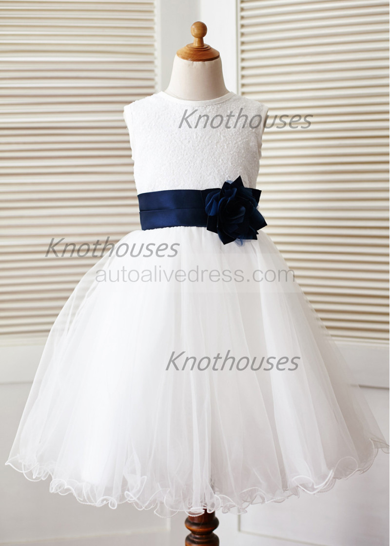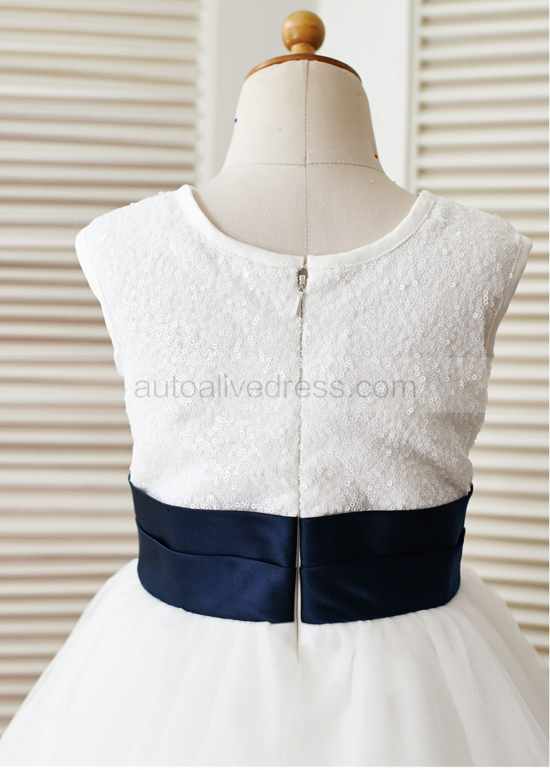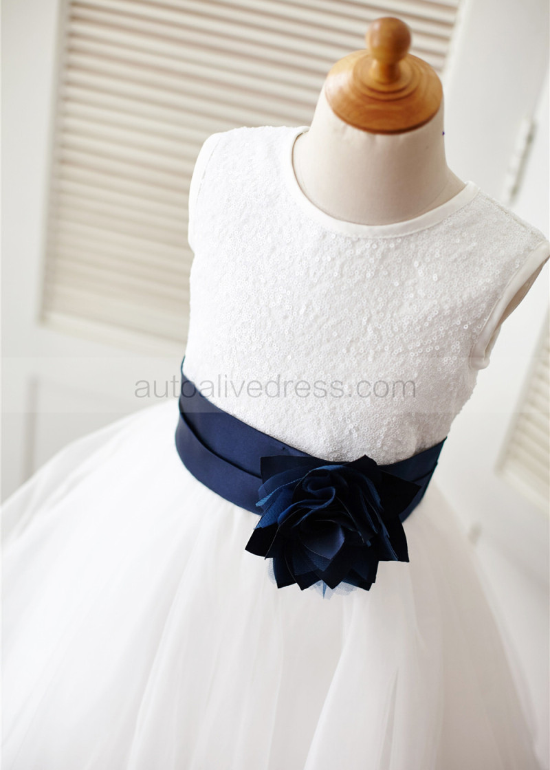 Shown Color | Ivory Sequin/Tulle With Navy Blue Sash/Flower |
