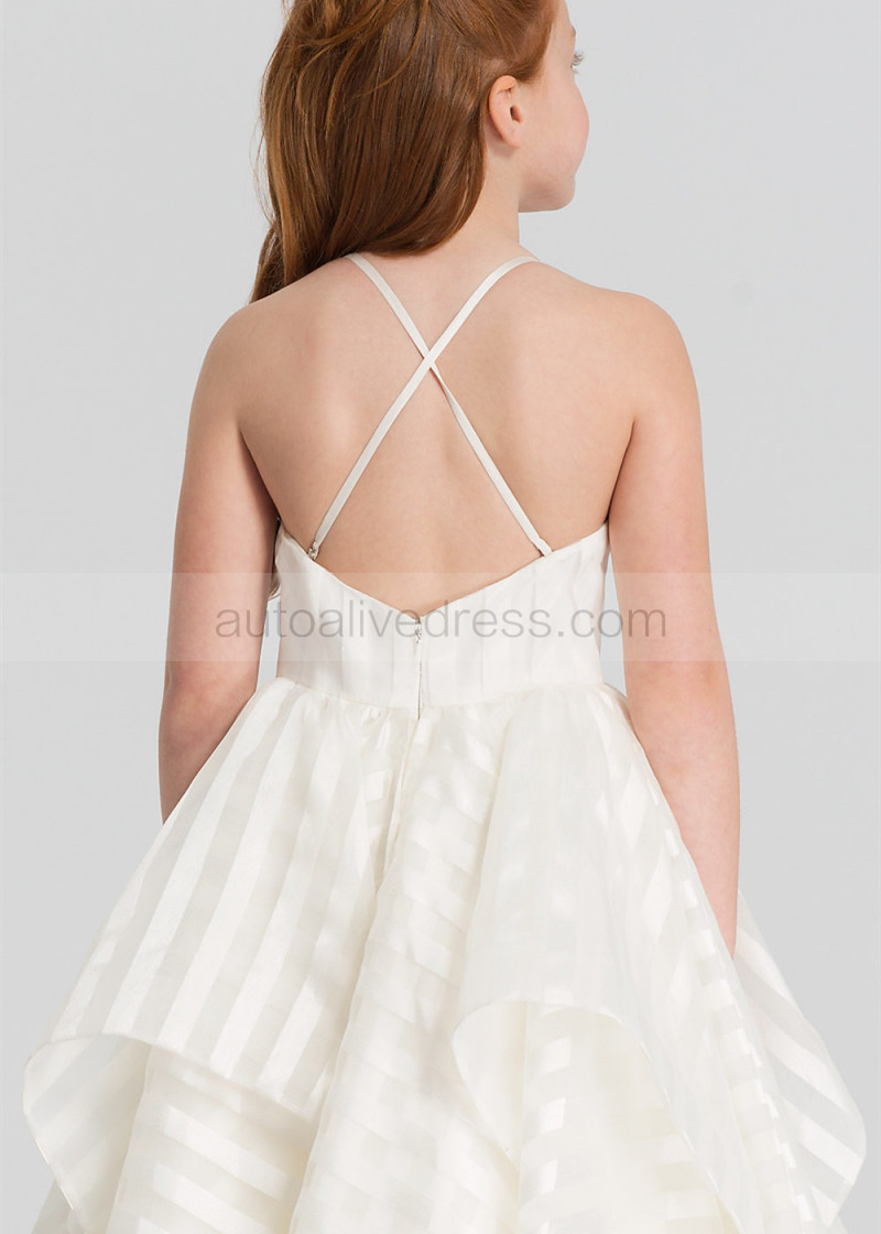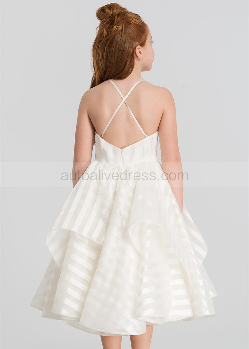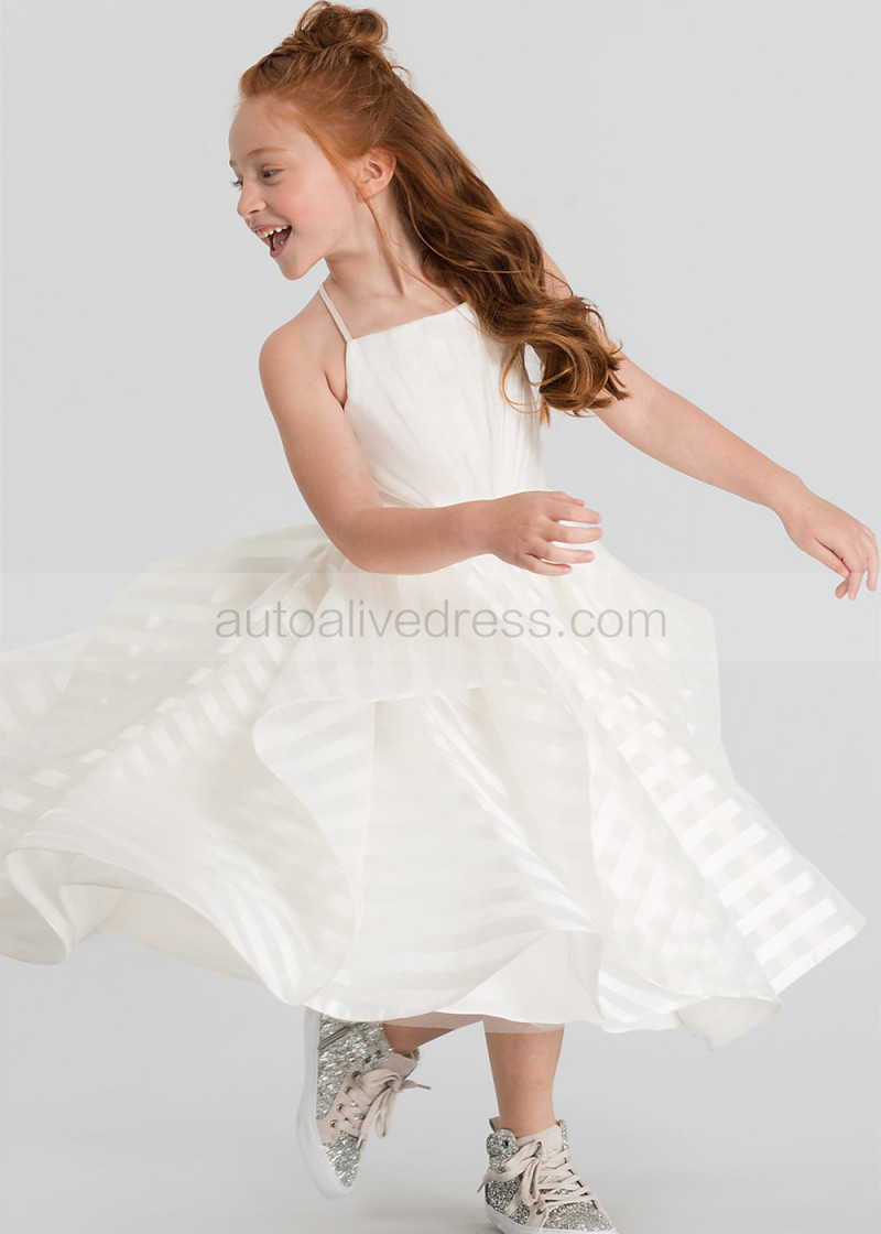 Ivory Striped Organza Tea Length Flower Girl Dress