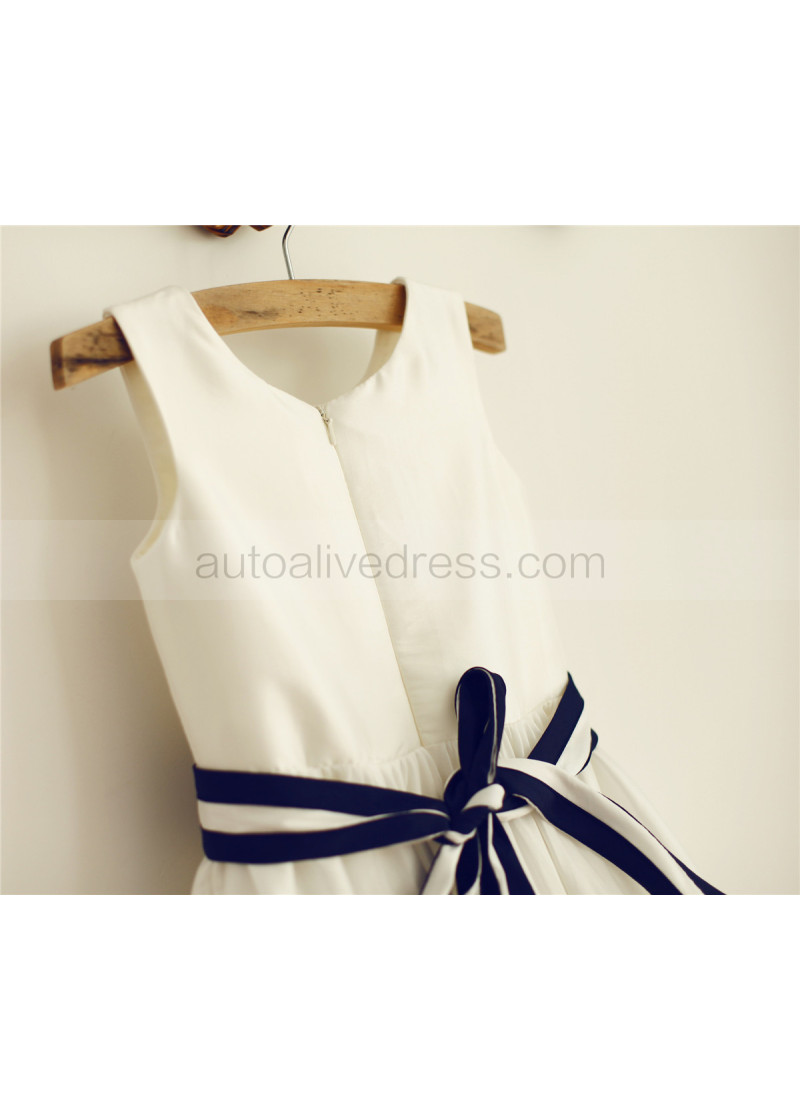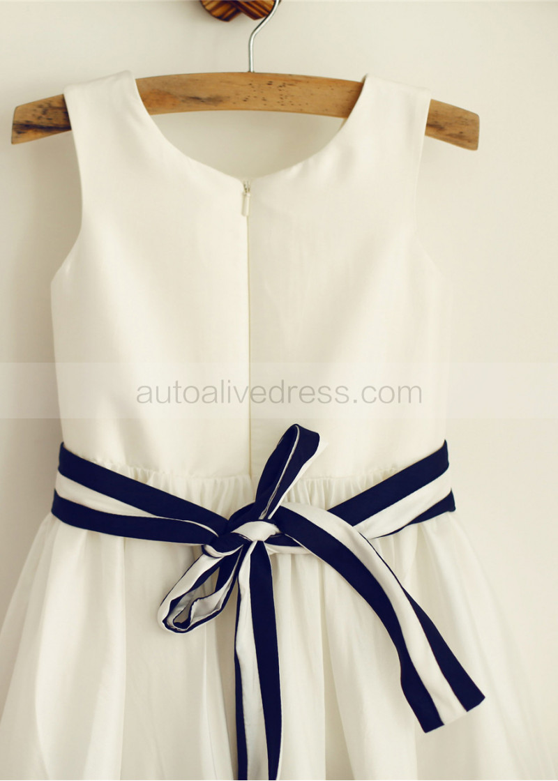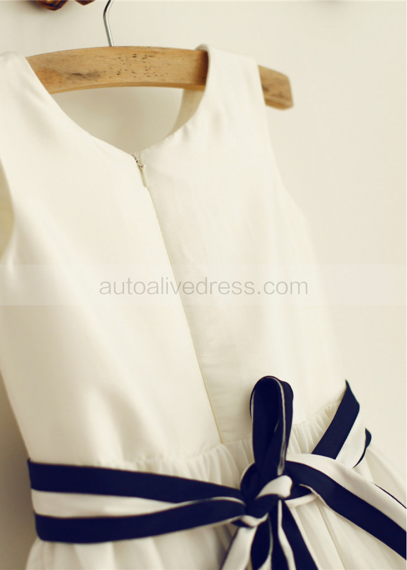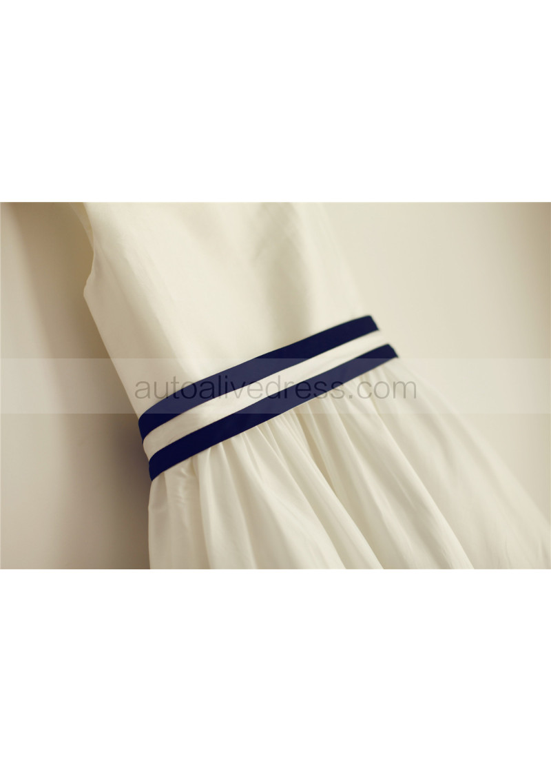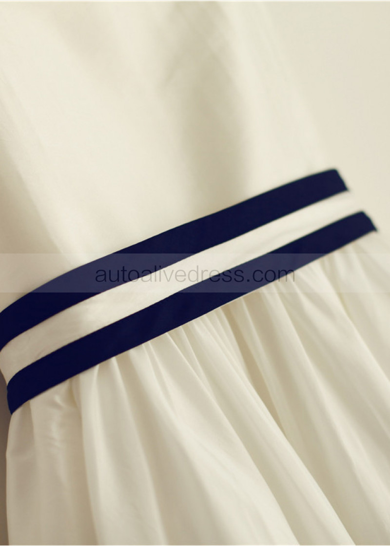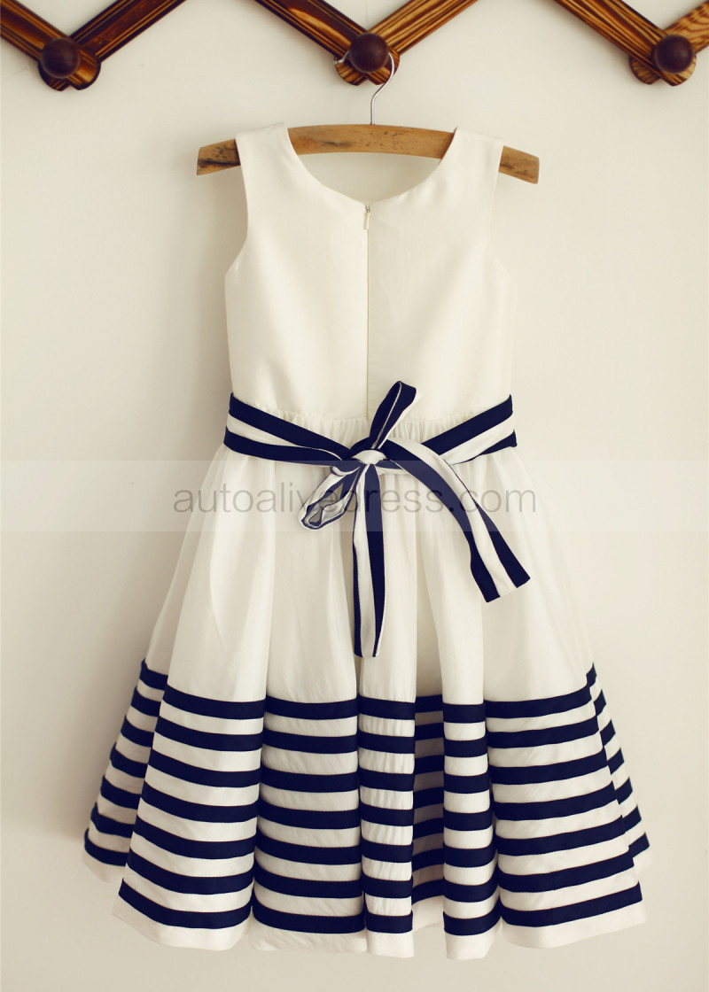 Ivory Taffeta Navy Blue Stripes Flower Girl Dress With Stripe Sash
