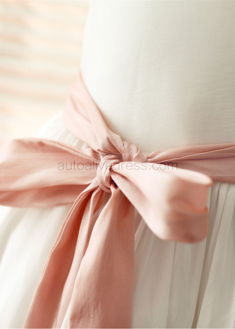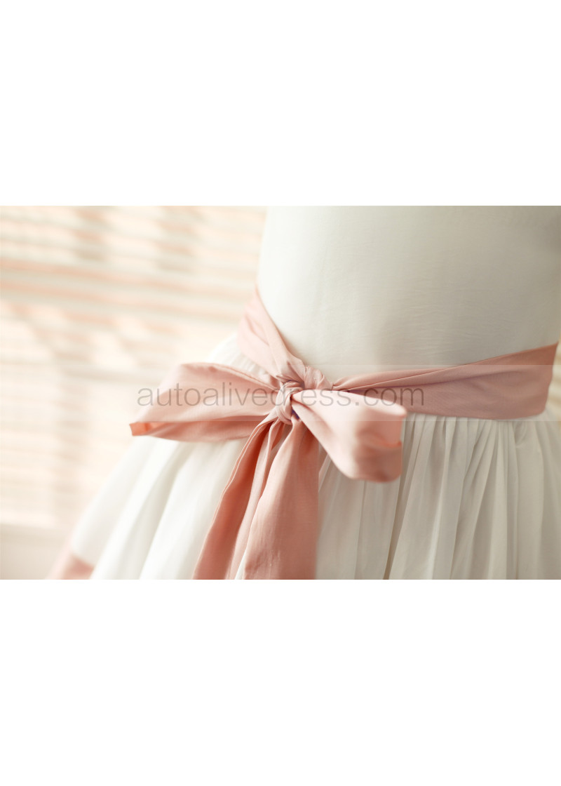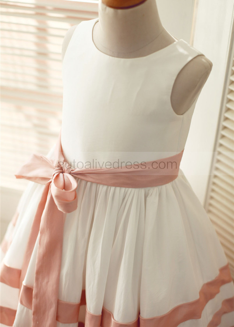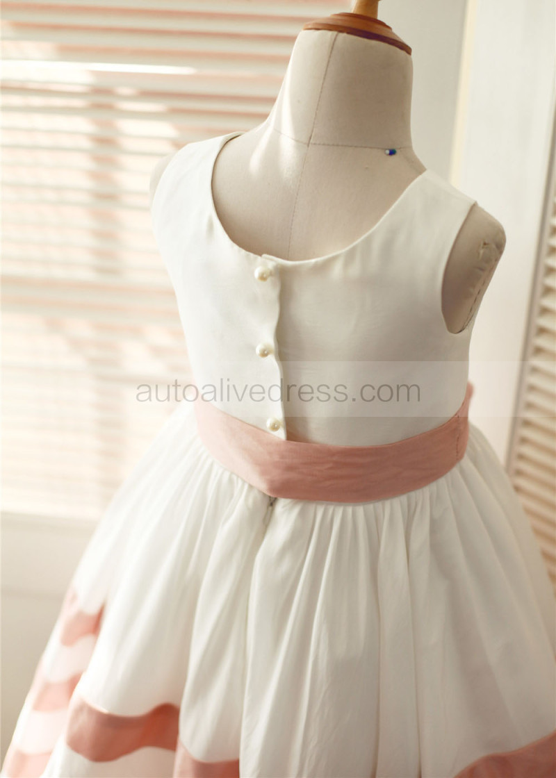 Ivory Taffeta Pink Stripes Knee Length Flower Girl Dress