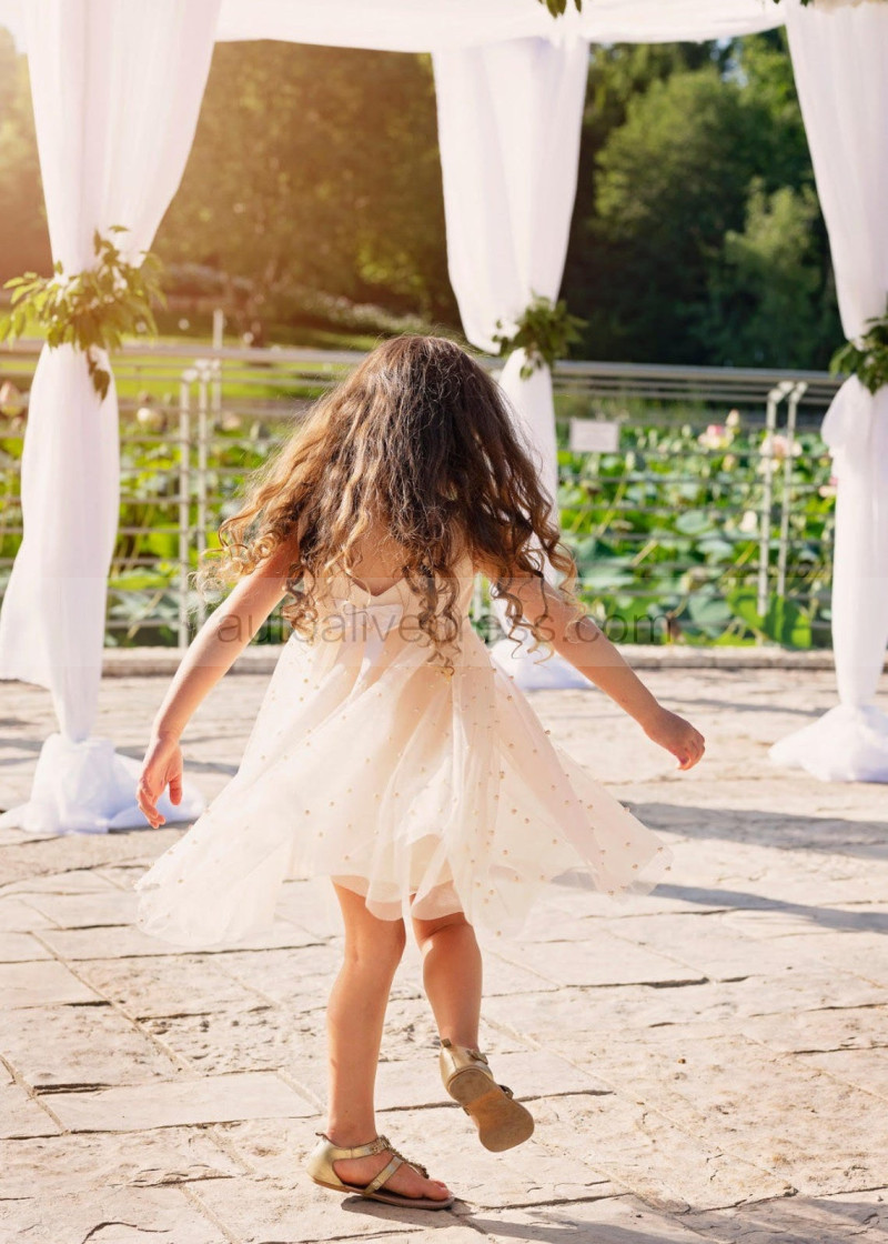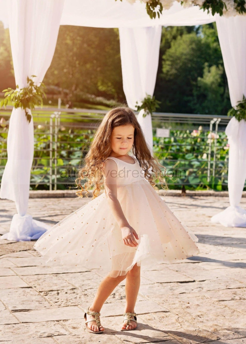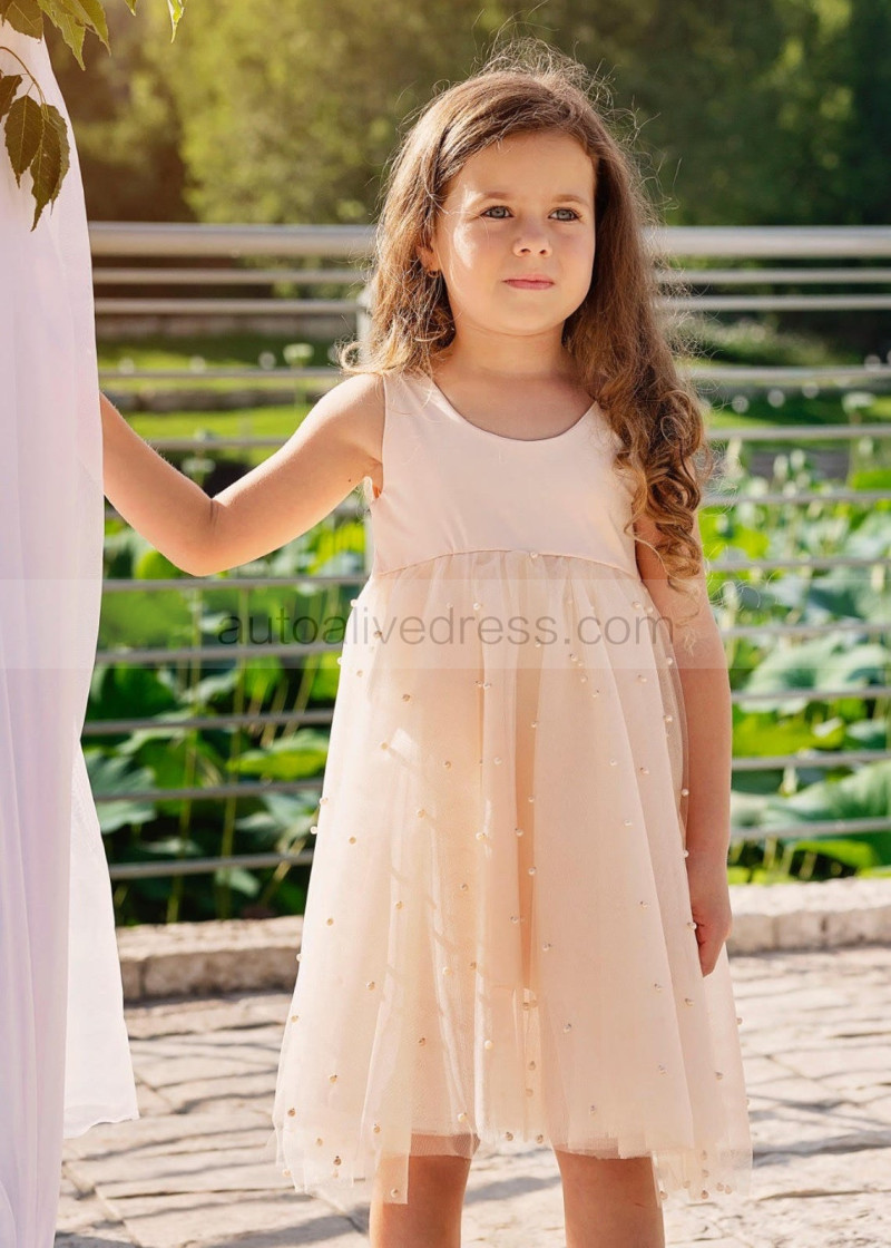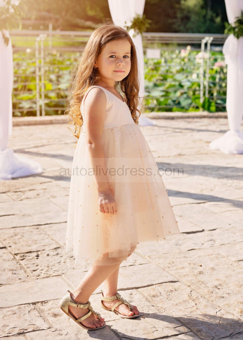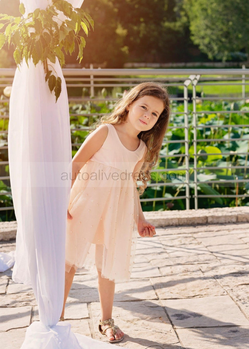 Light Peach Tulle Pearls V Back Short Flower Girl Dress