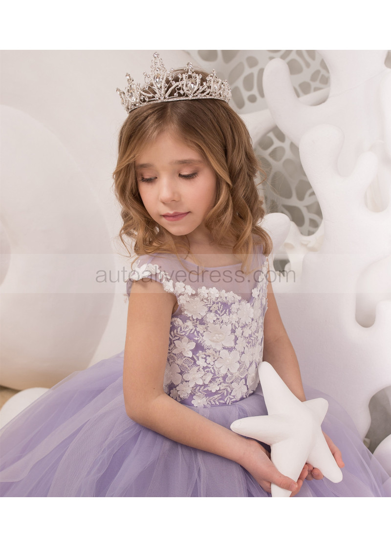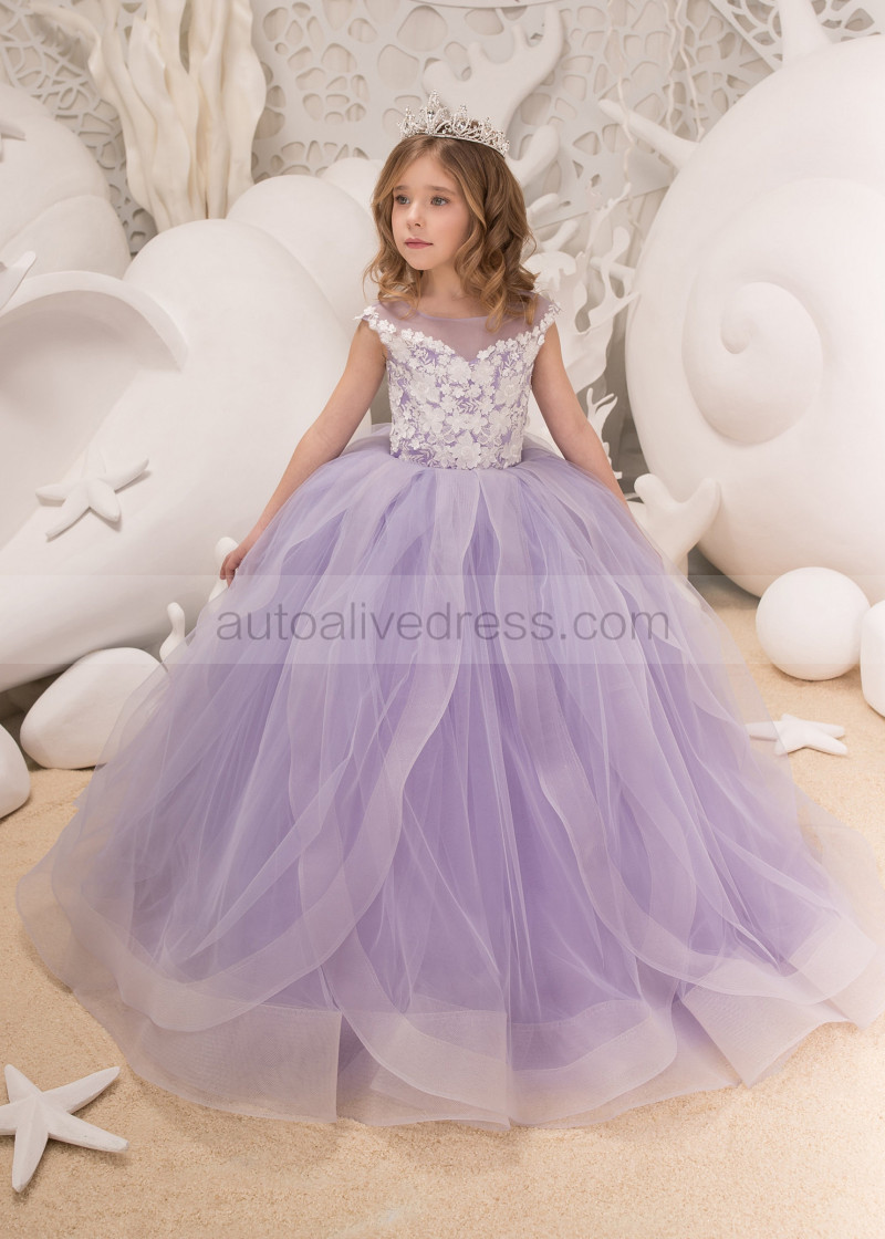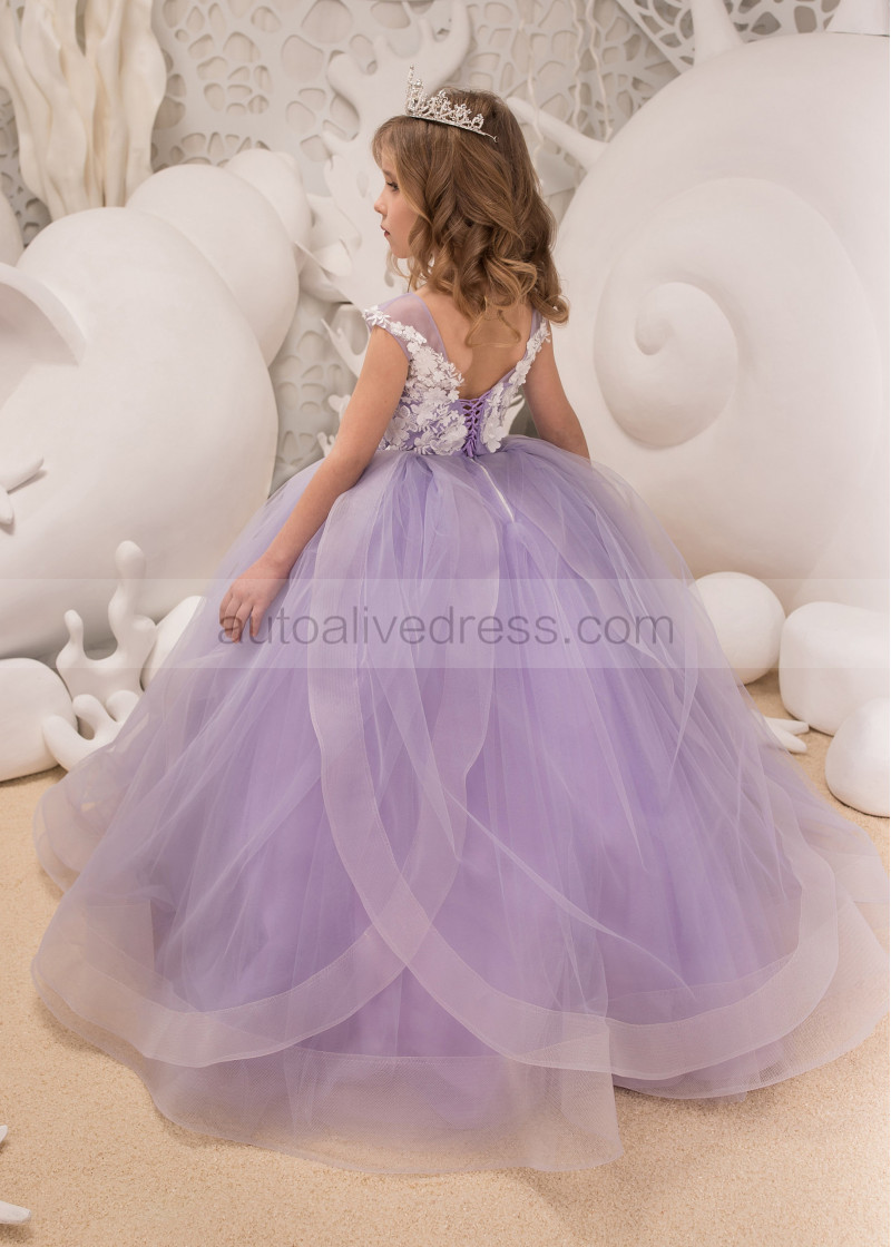 Lilac Lace Applique Tulle Corset Back Long Flower Girl Dress