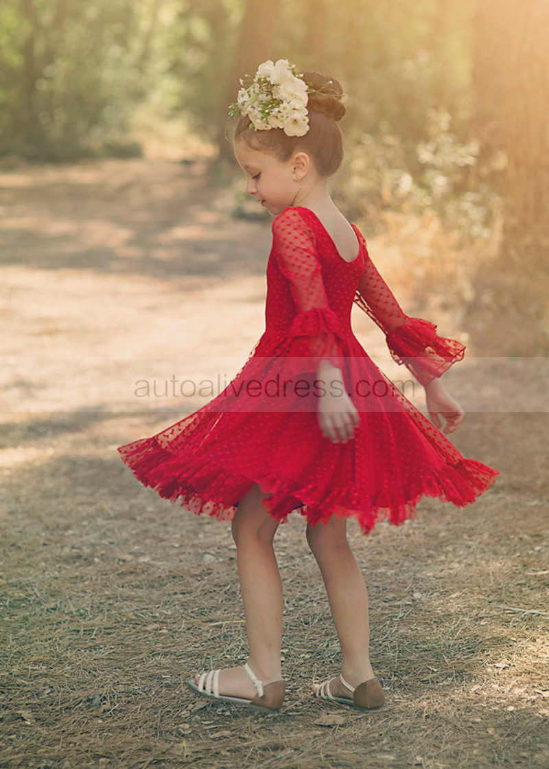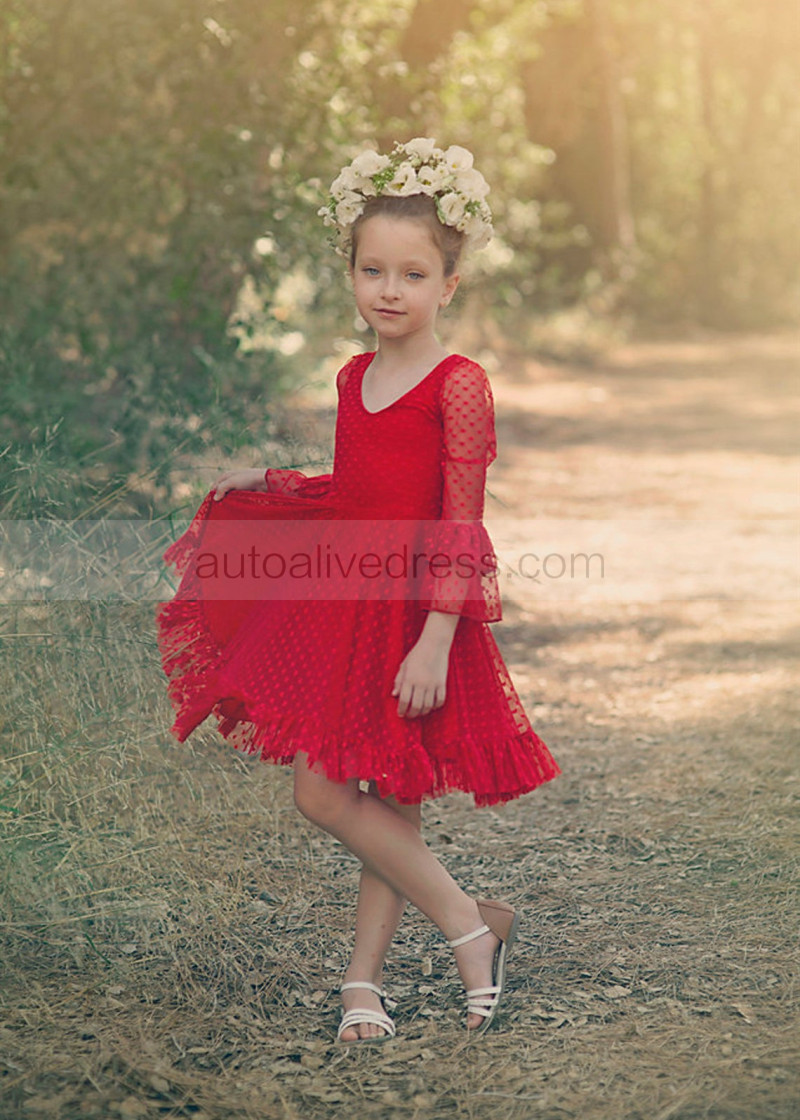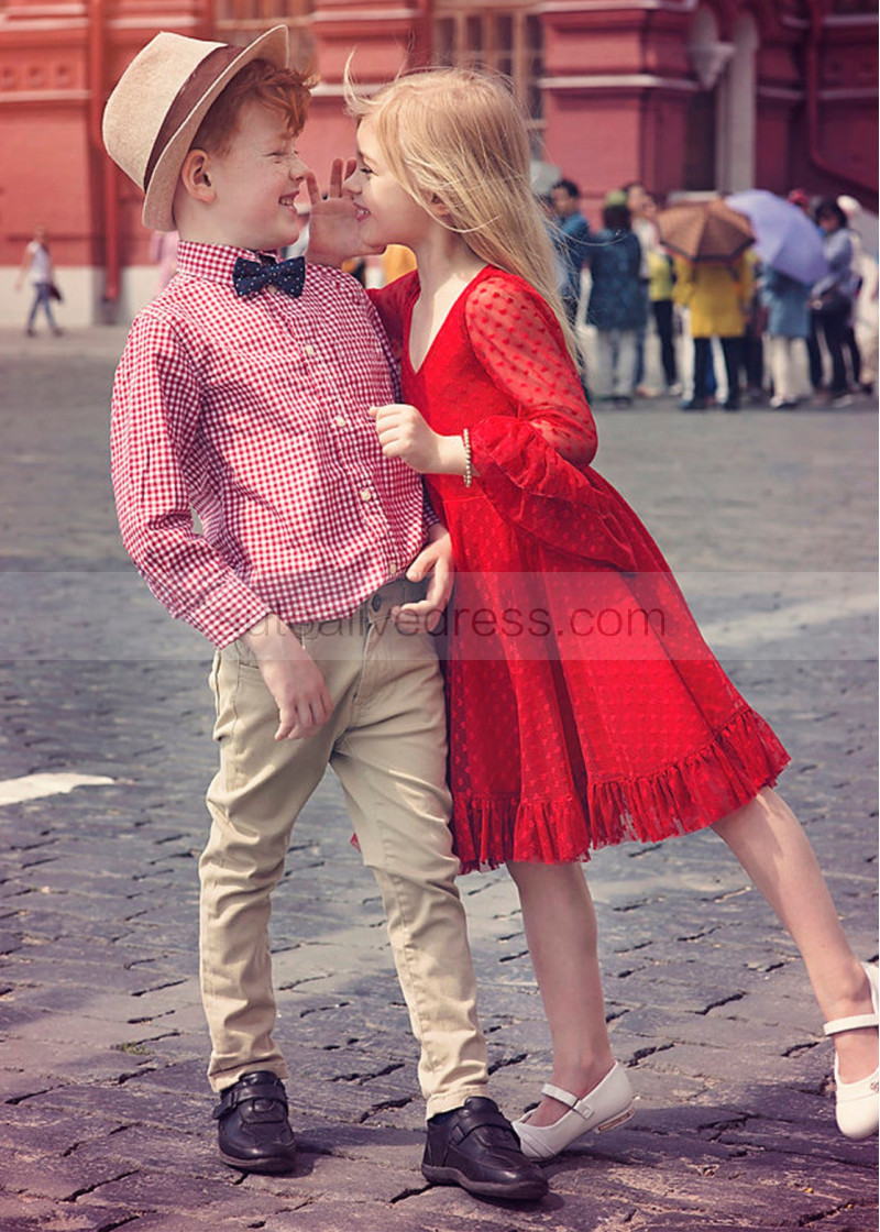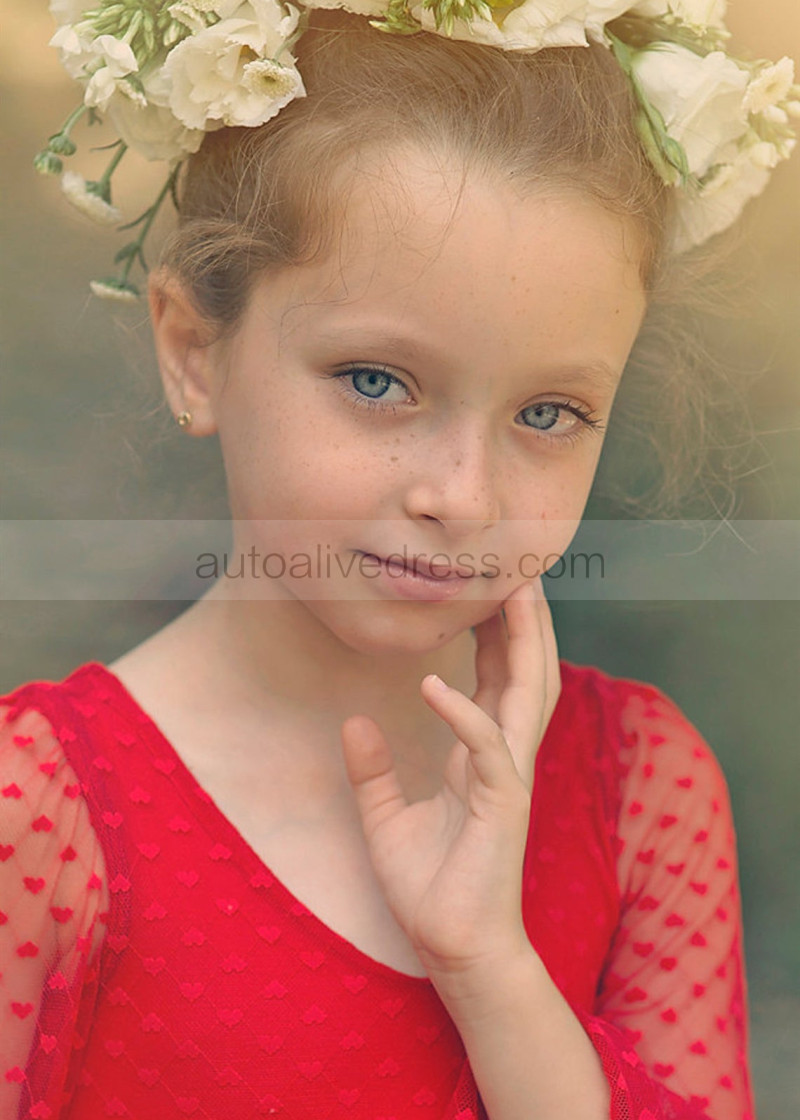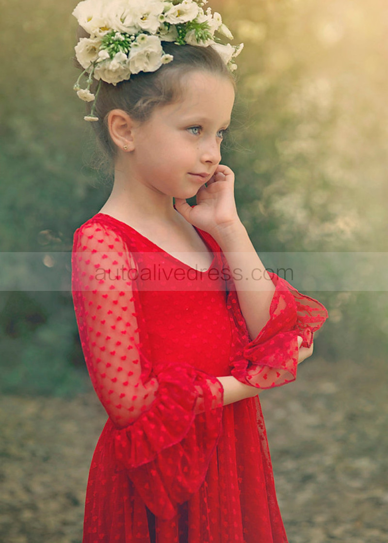 Long Bell Sleeves Red Heart Print Lace Cute Flower Girl Dress