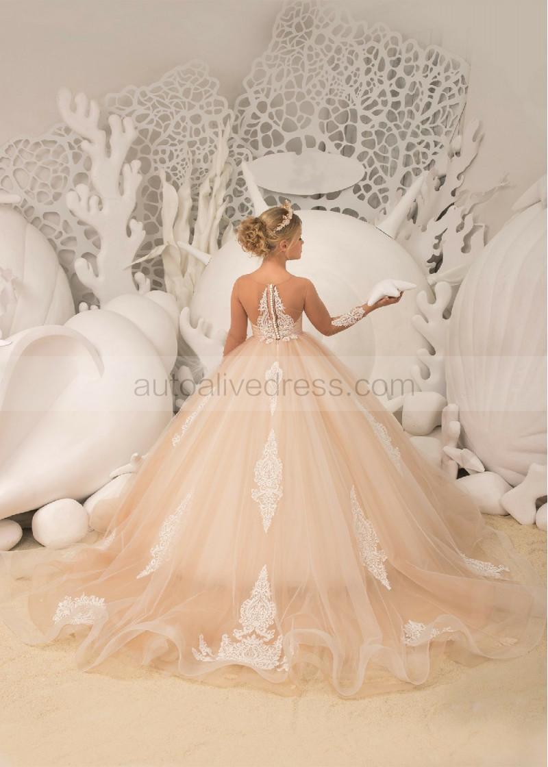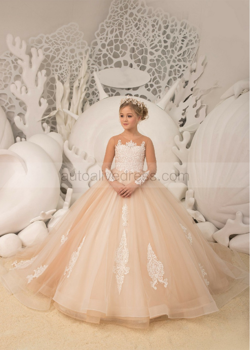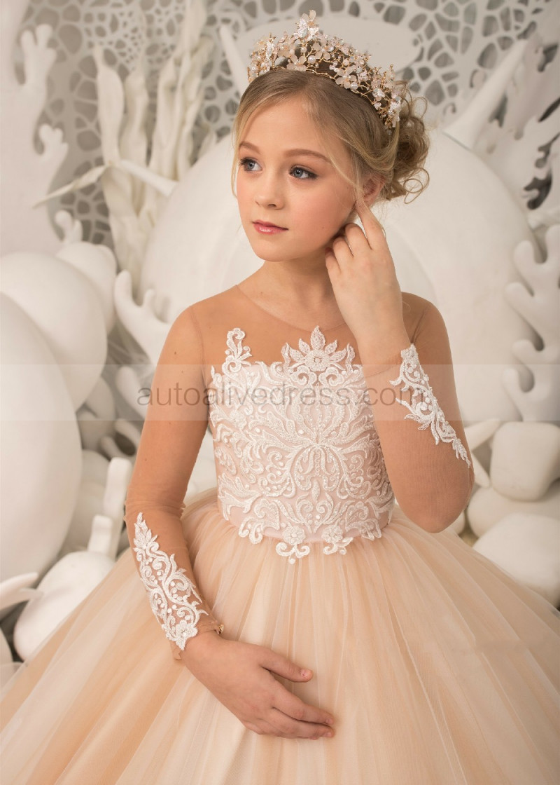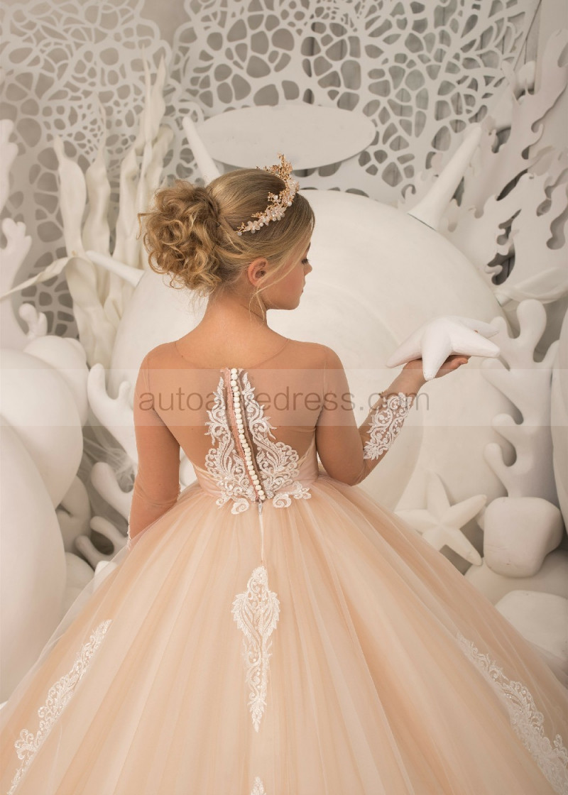 Long Sleeve Champagne Lace Tulle Floor Length Buttons Back Flower Girl Dress