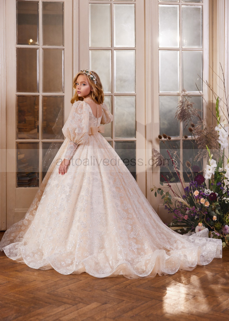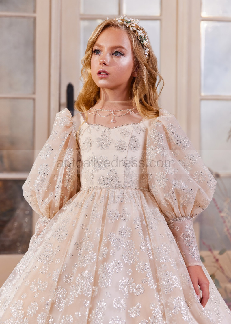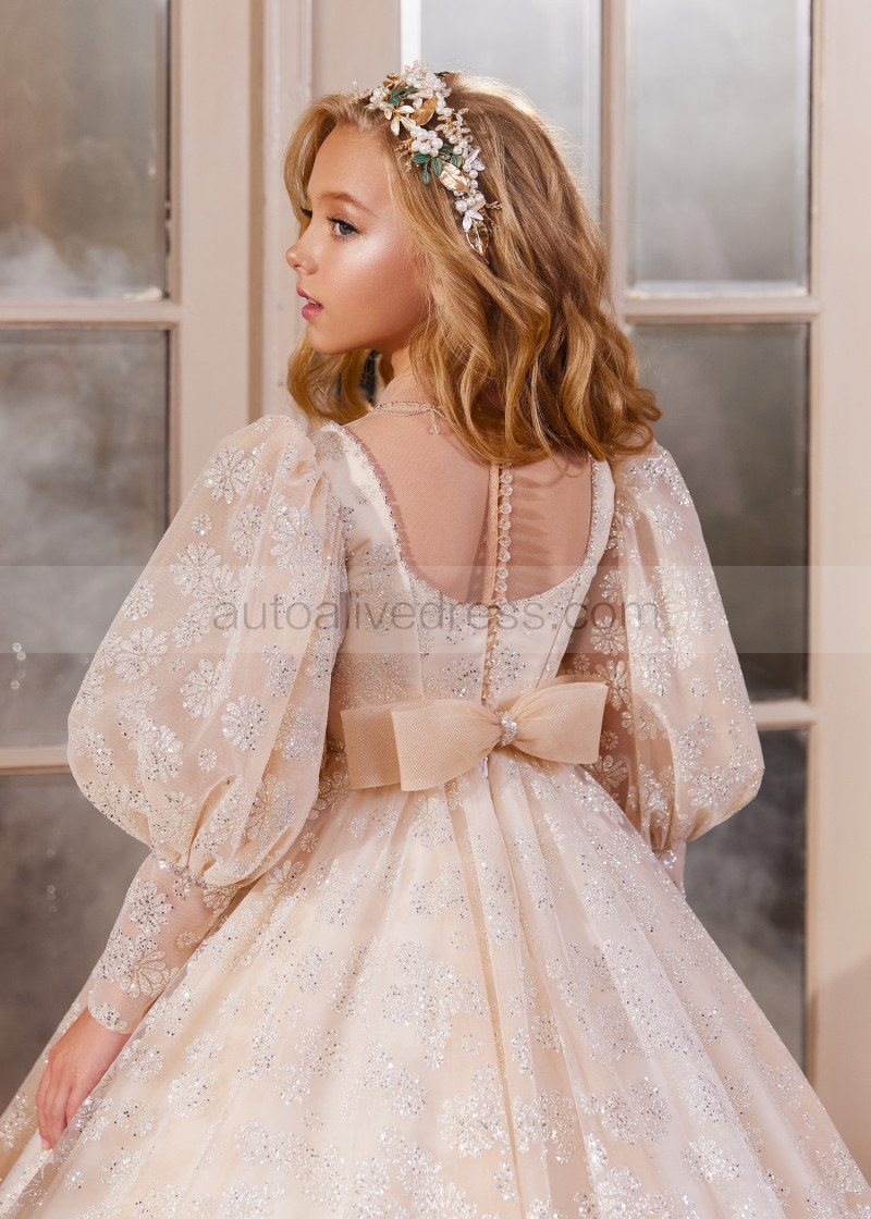 Long Sleeves Beaded Champagne Lace Tulle Flower Girl Dress