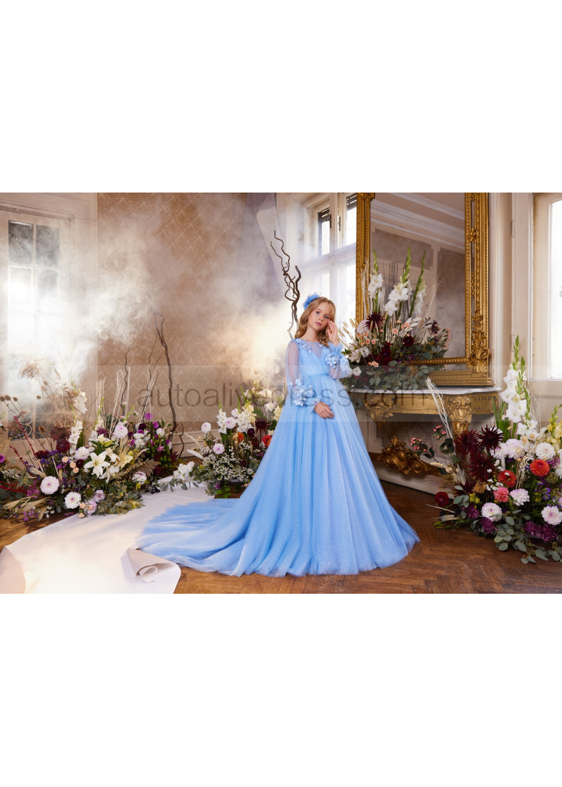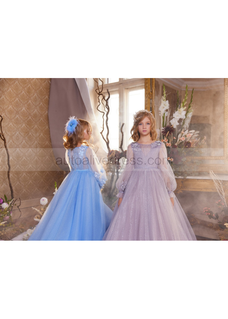 Long Sleeves Beaded Lace Glitter Tulle Flower Girl Dress