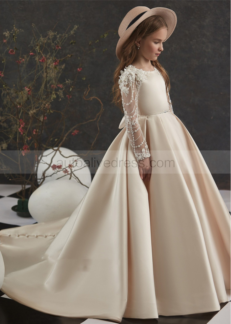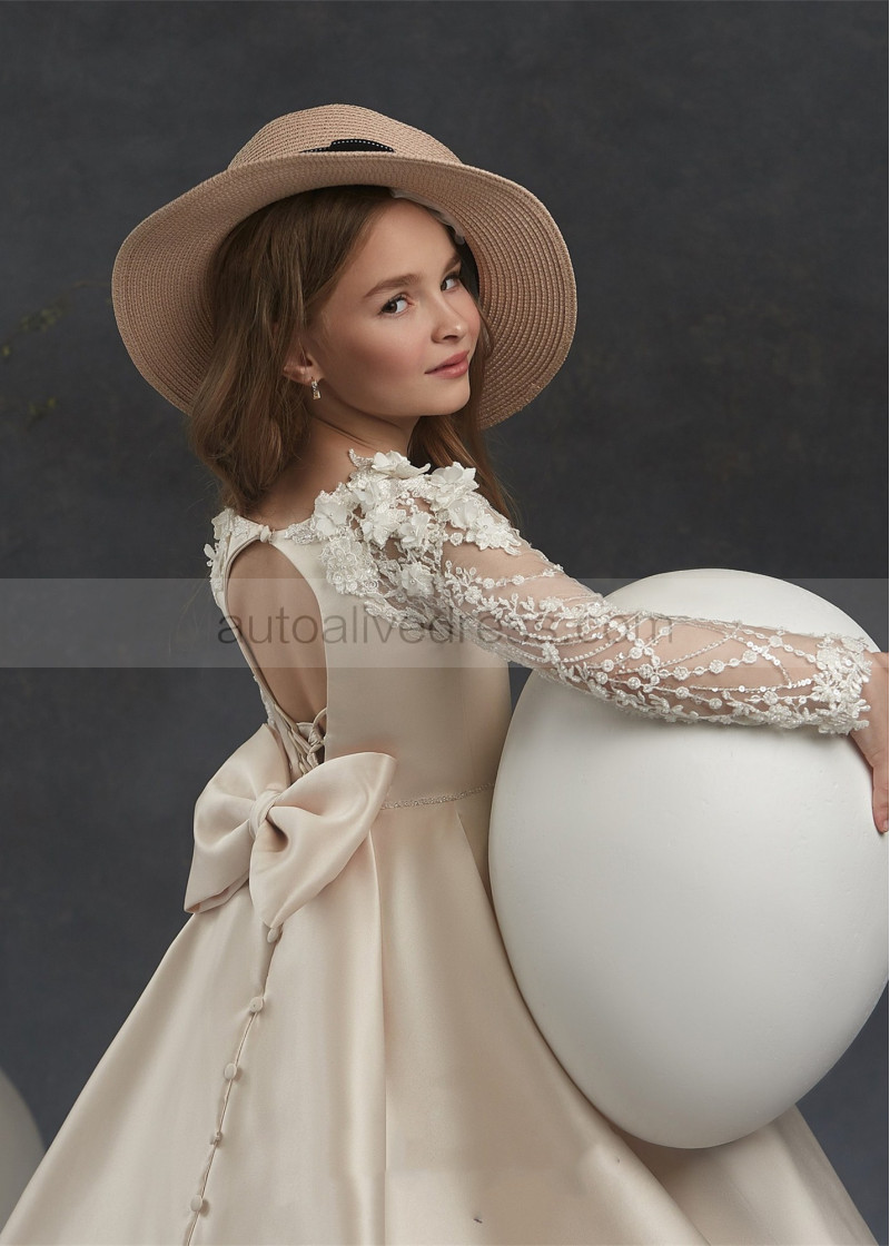Long Sleeves Beaded Lace Satin Keyhole Back Flower Girl Dress