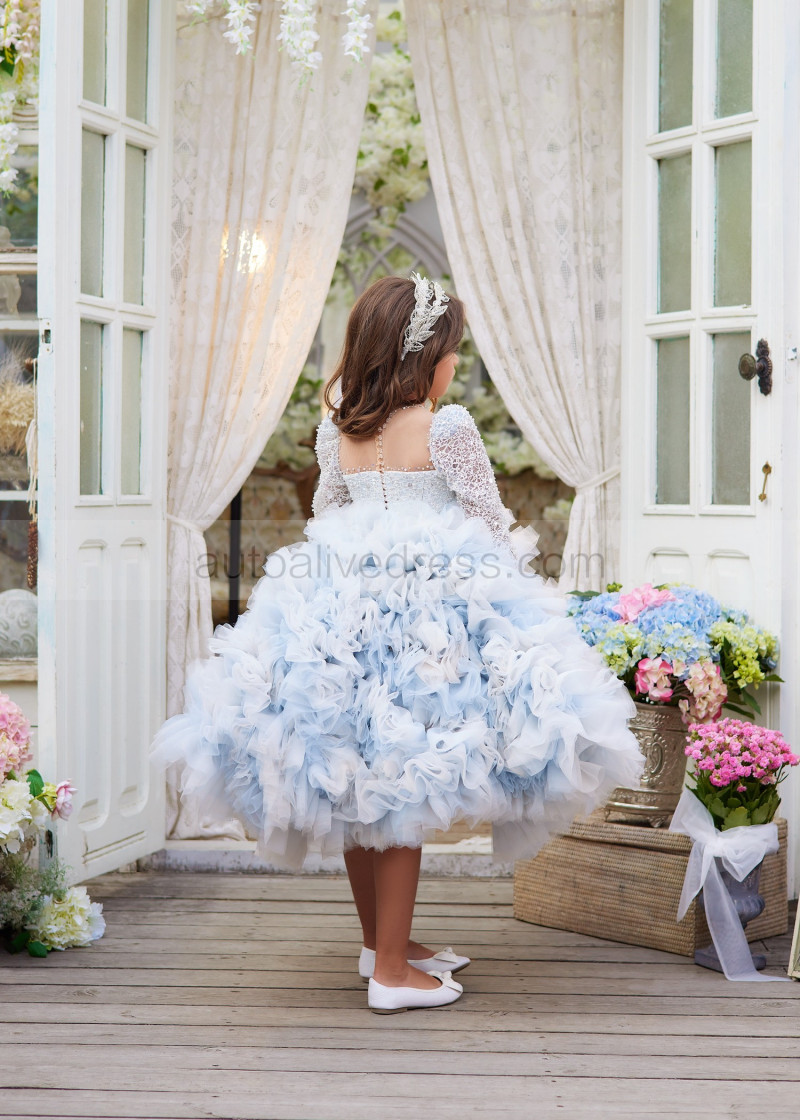 Long Sleeves Blue Sparkling Lace Tulle Ruffled Flower Girl Dress