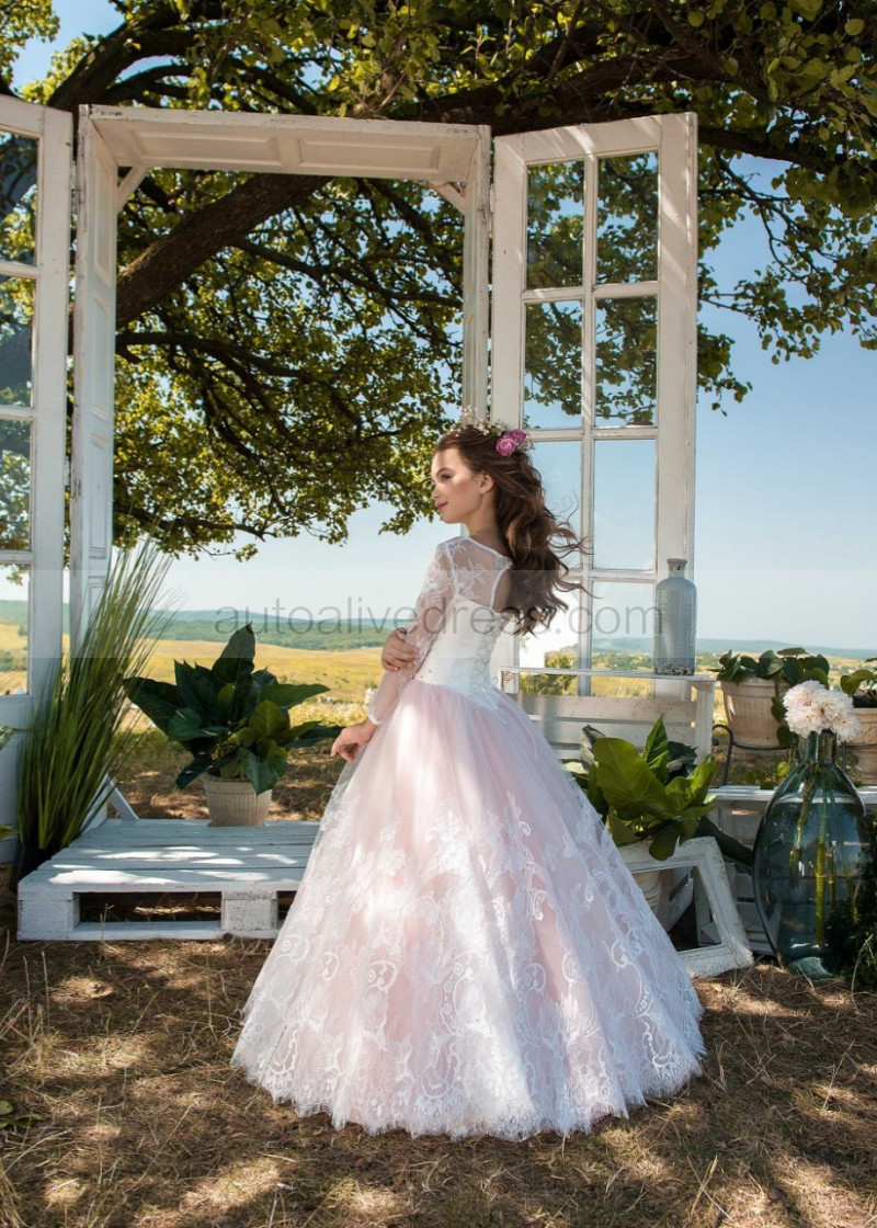 Long Sleeves Ivory Lace Pink Tulle Romantic Spring Flower Girl Dress