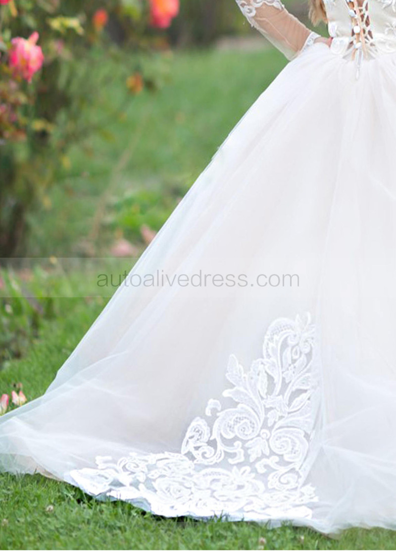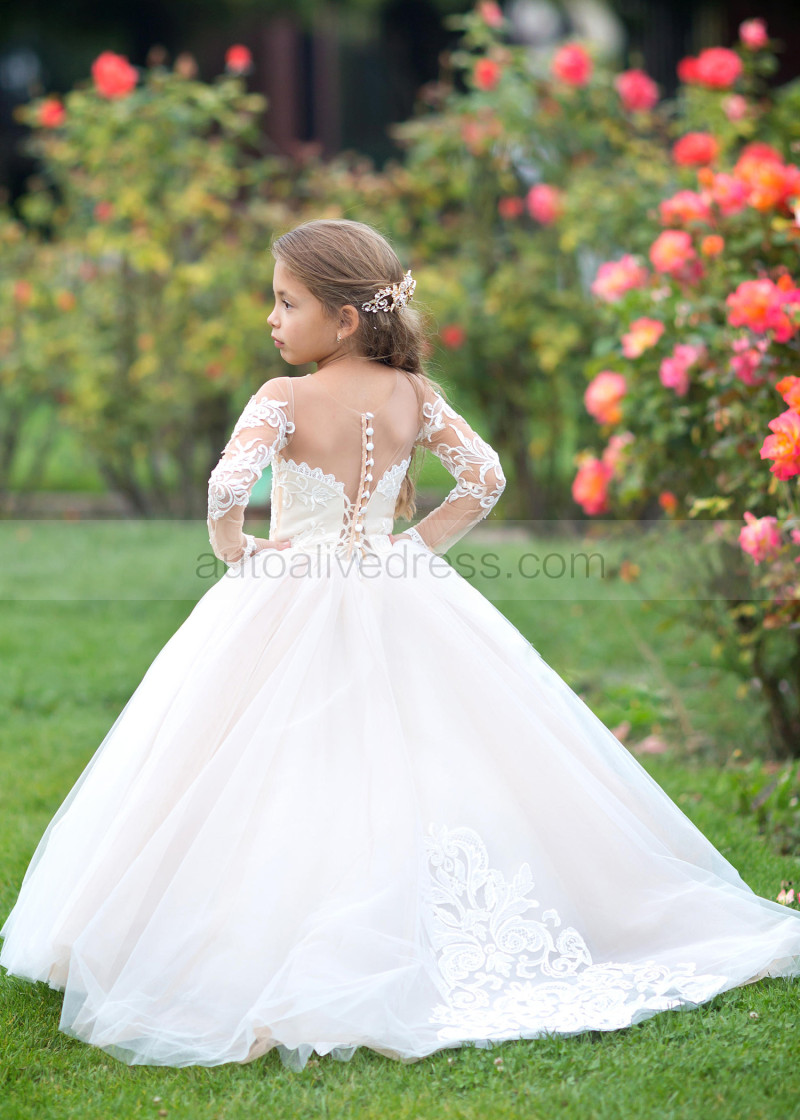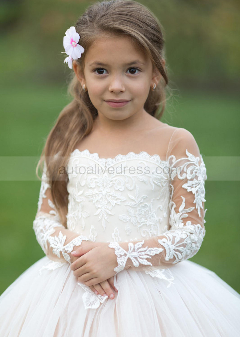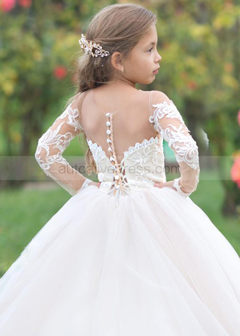 Long Sleeves Ivory Lace Tulle Illusion Neck Floor Length Flower Girl Dress