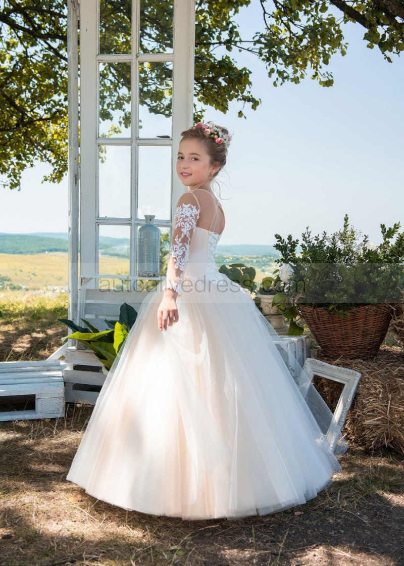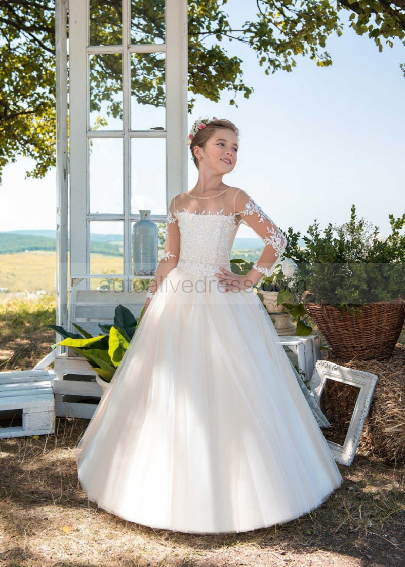 Long Sleeves Lace Tulle Keyhole Back Fairytale Flower Girl Dress