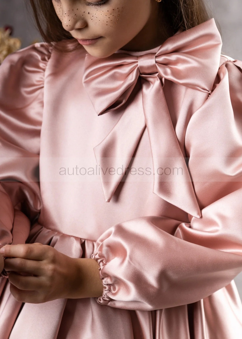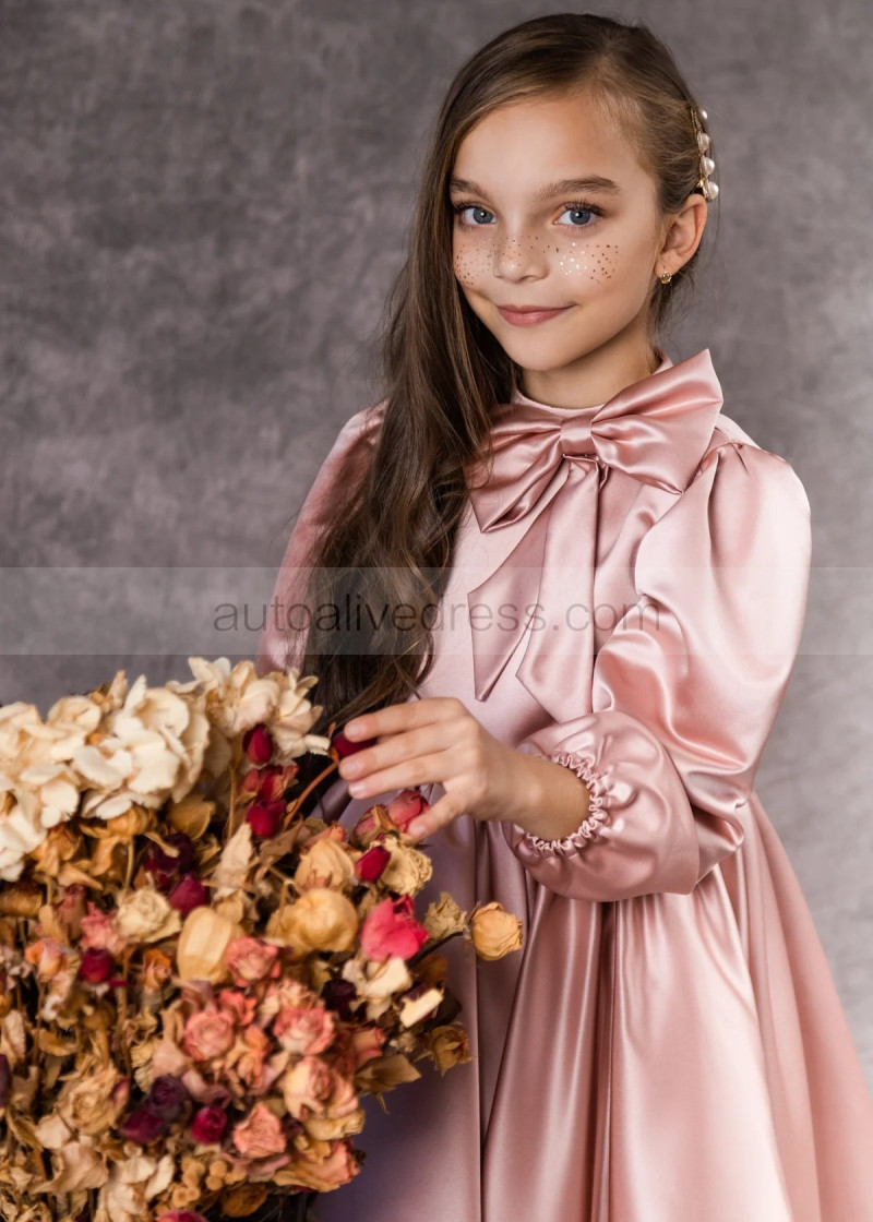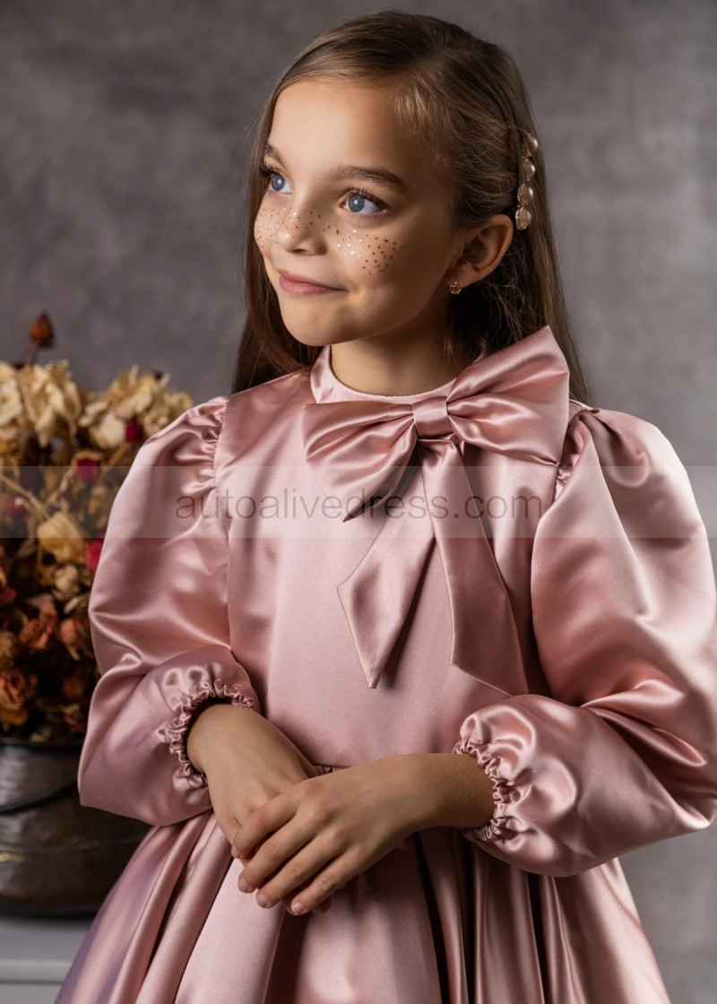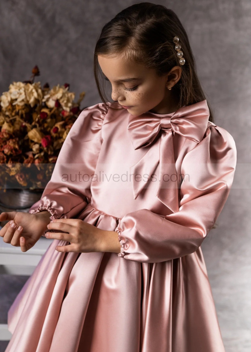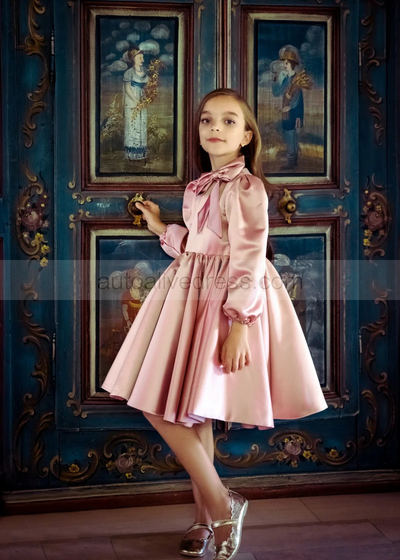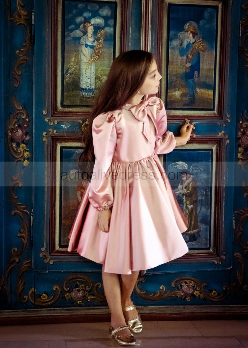 Long Sleeves Pink Satin Short Flower Girl Dress