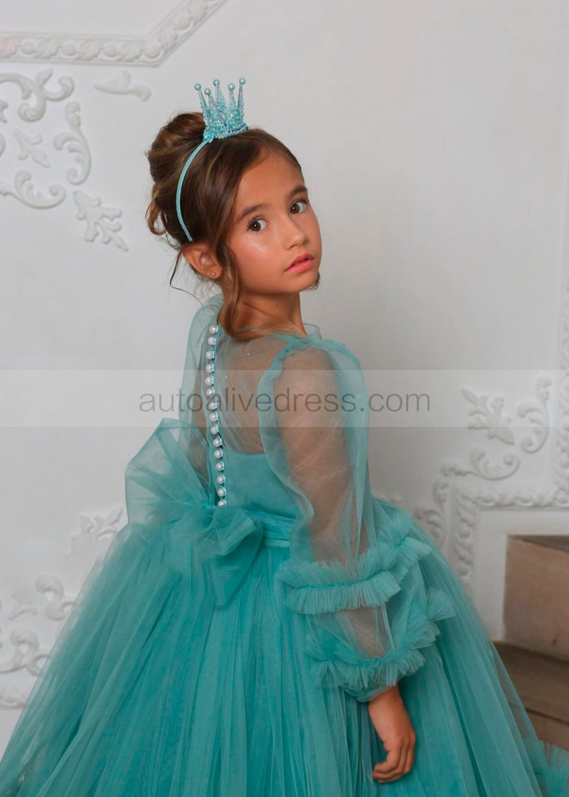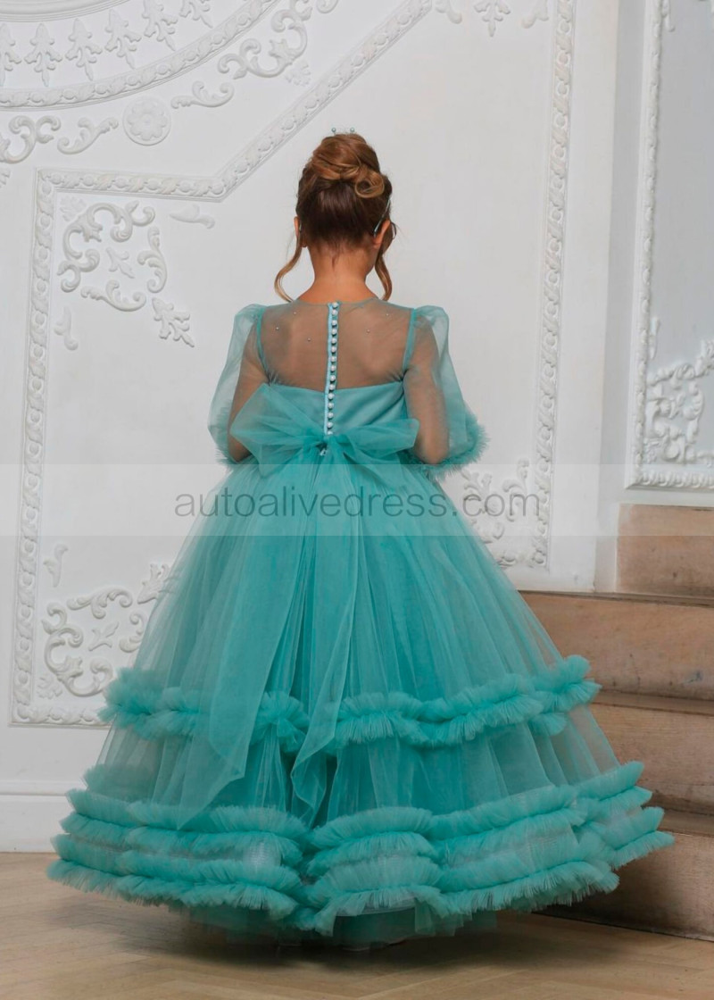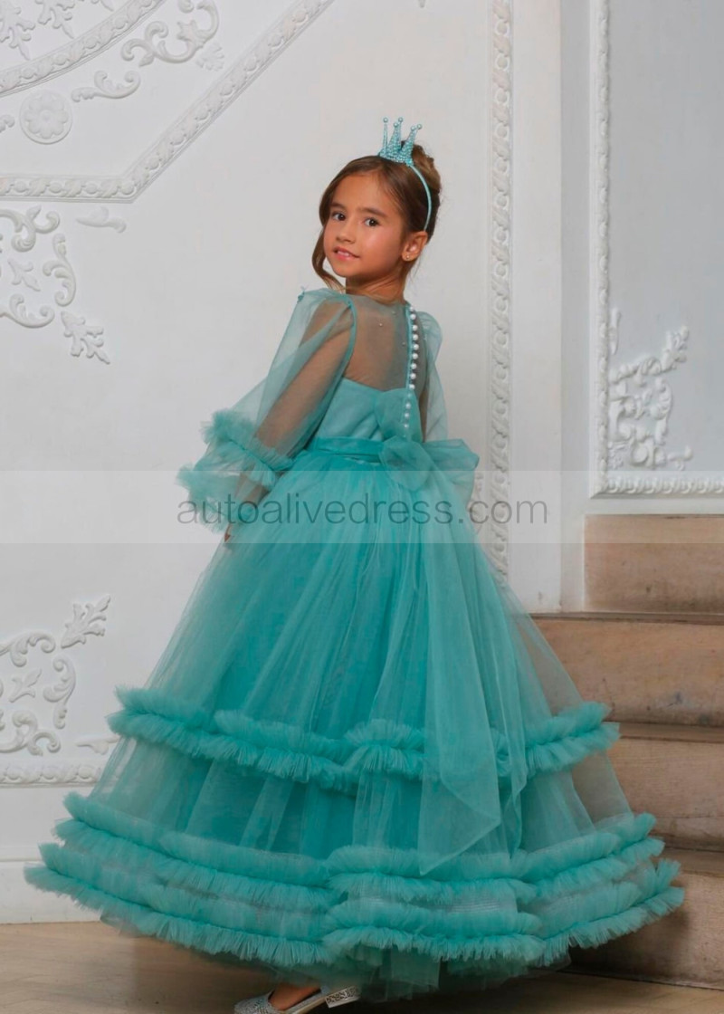 Long Sleeves Turquoise Tulle Ankle Length Flower Girl Dress