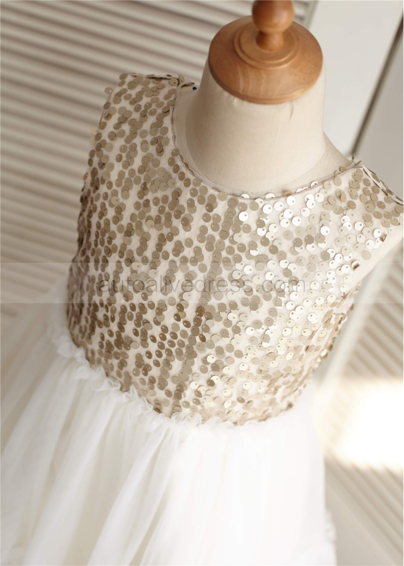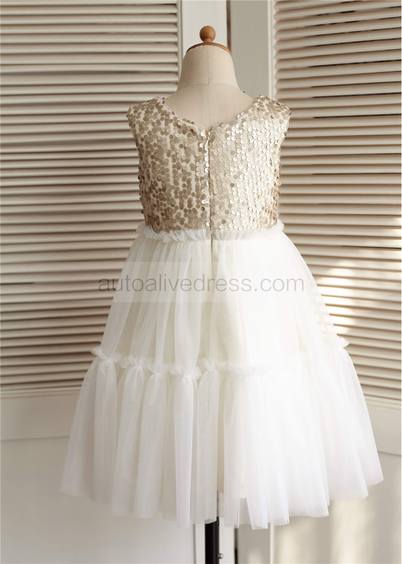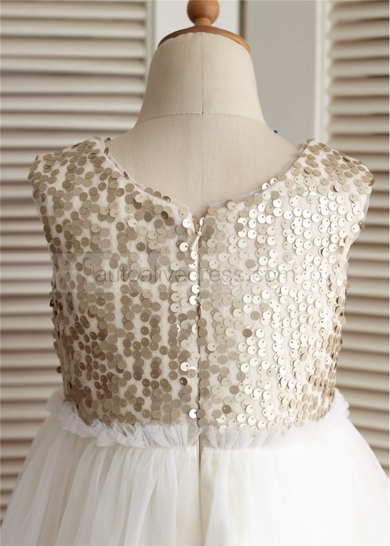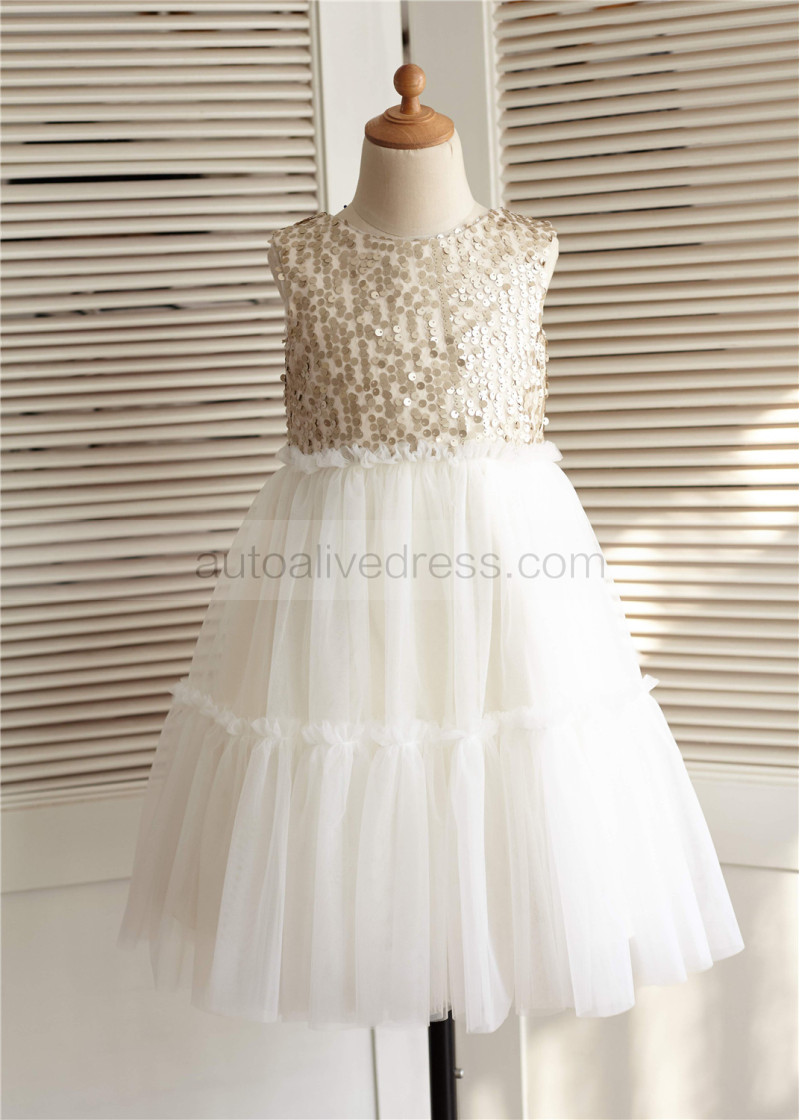 Matte Sequin Ivory Tulle Knee Length Ruffled Flower Girl Dress