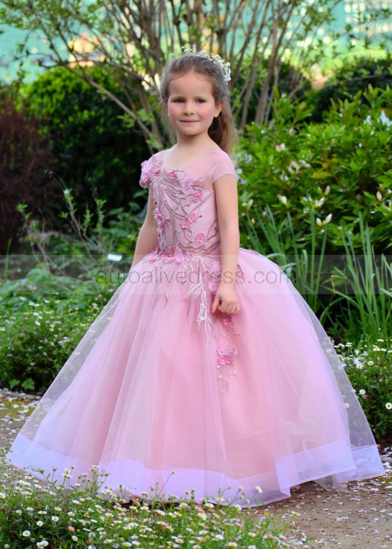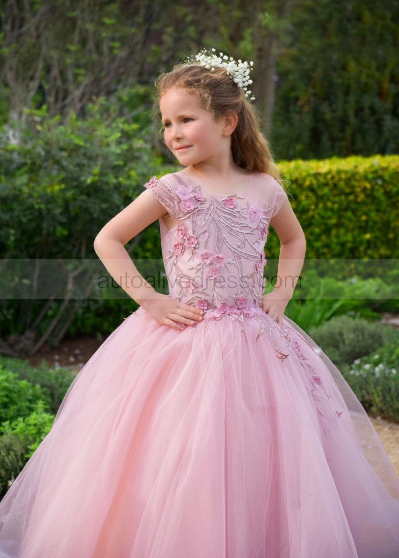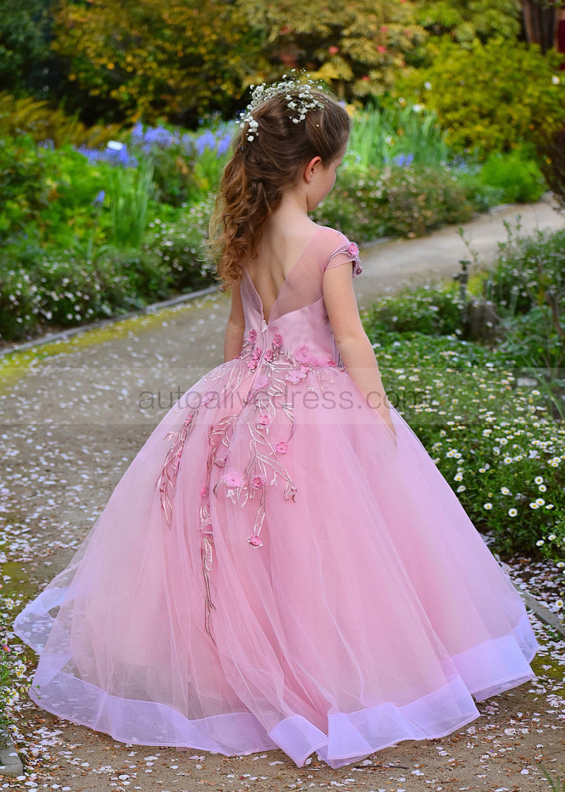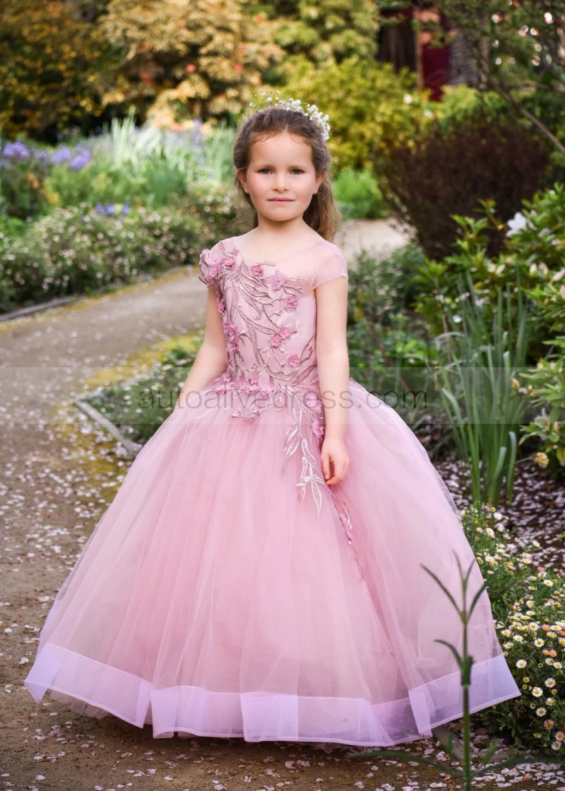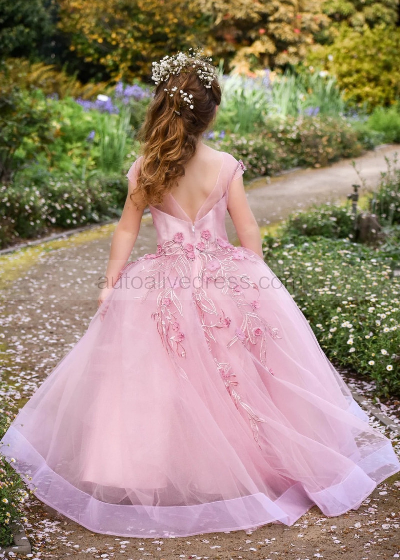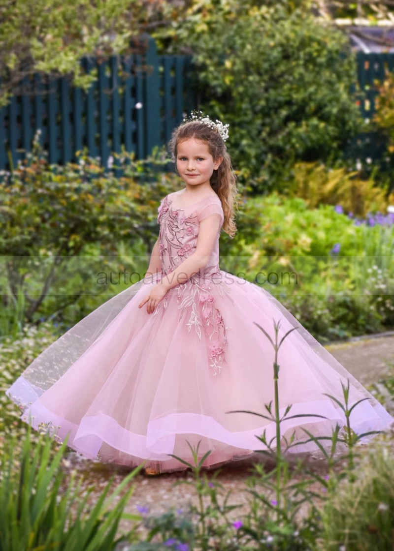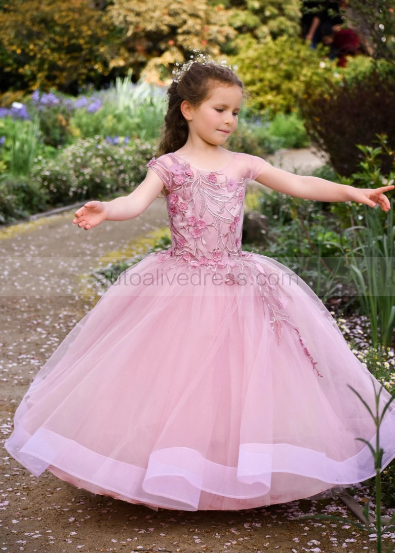Mauve Lace Tulle V Back Floor Length Flower Girl Dress