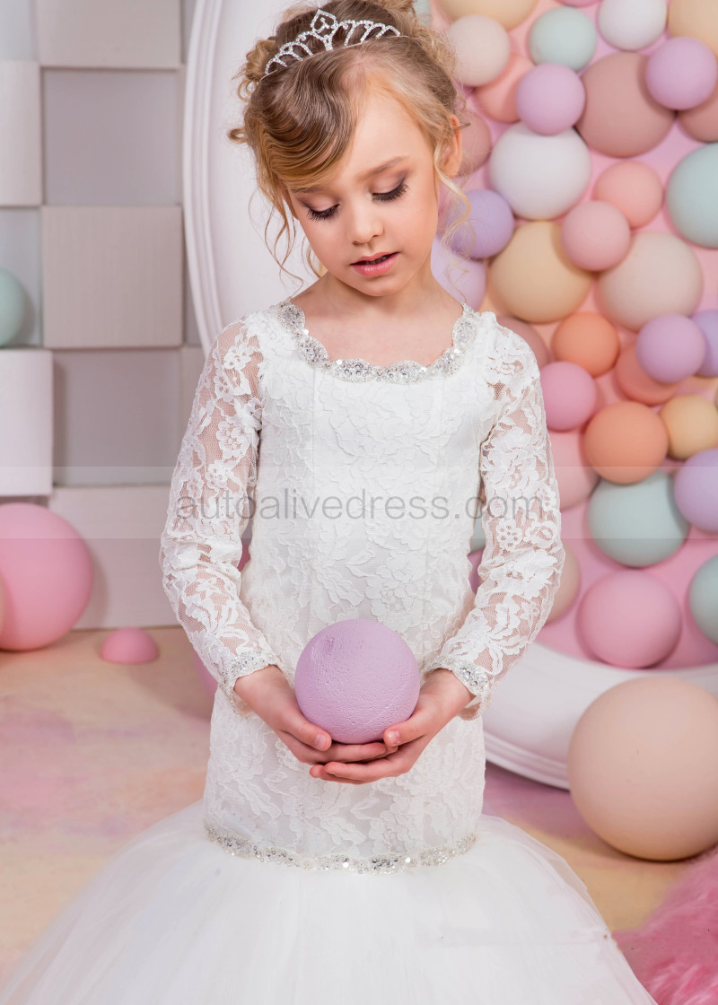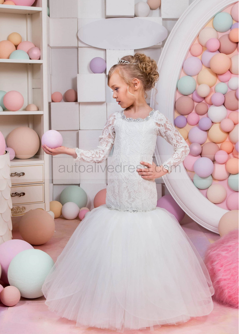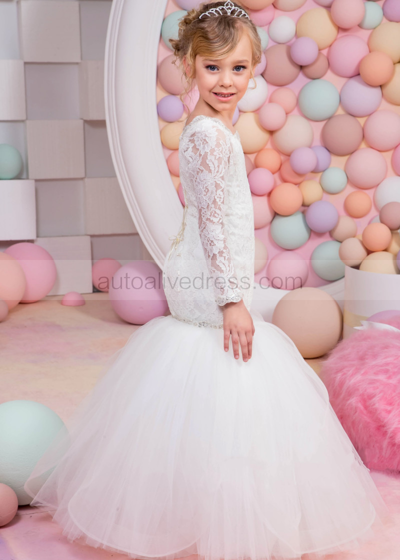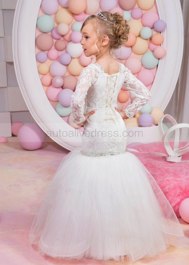 Mermaid Ivory Lace Tulle Floor Length Beaded Flower Girl Dress