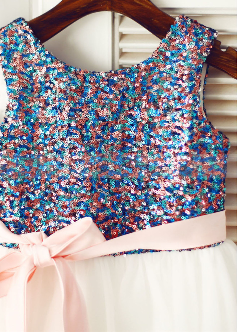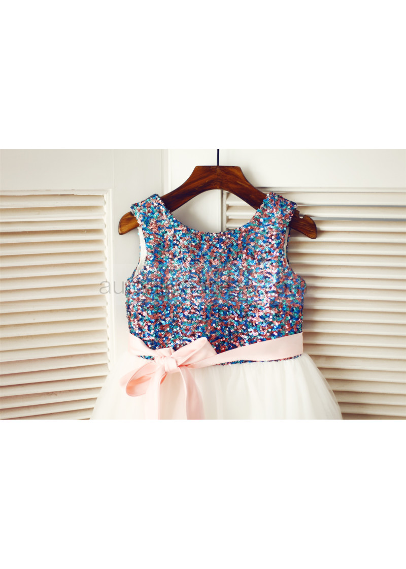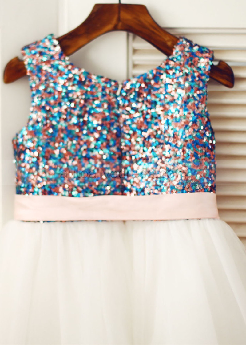 Multicolor Sequin Ivory Tulle Sparkly Flower Girl Dress