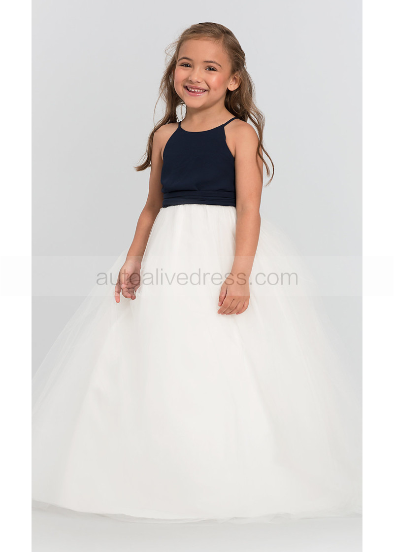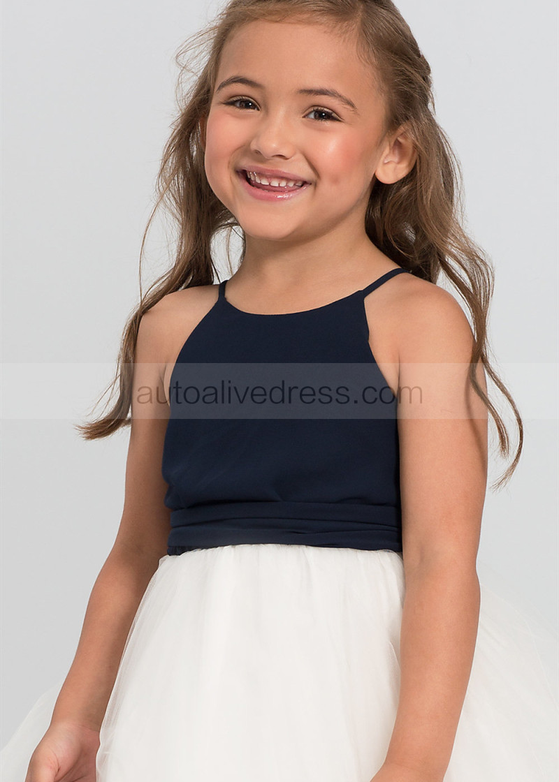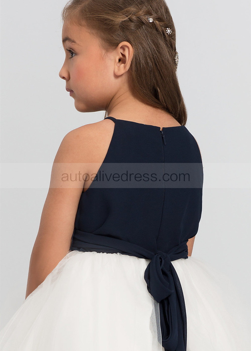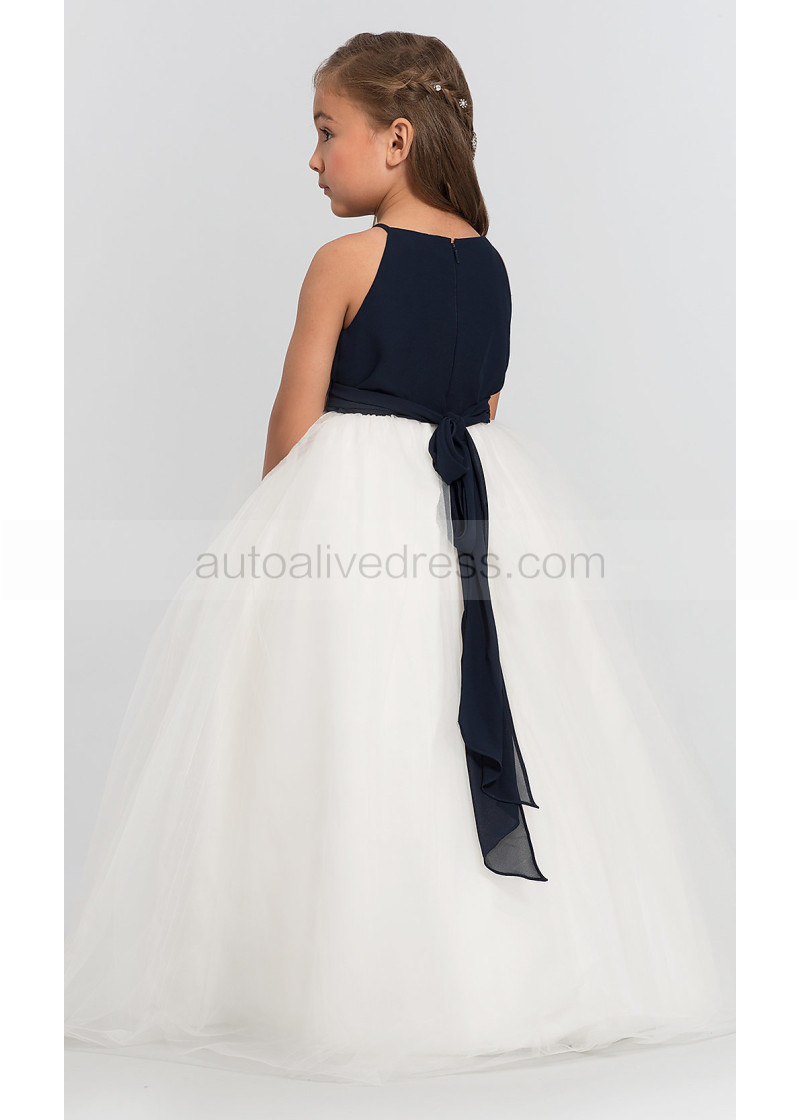 Navy Blue Chiffon Ivory Tulle Long Flower Girl Dress
