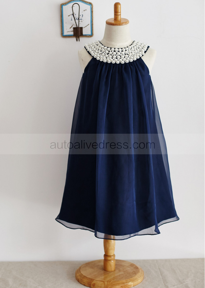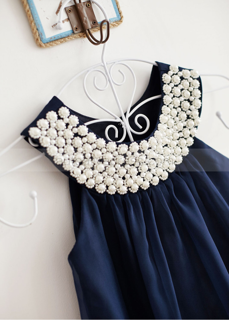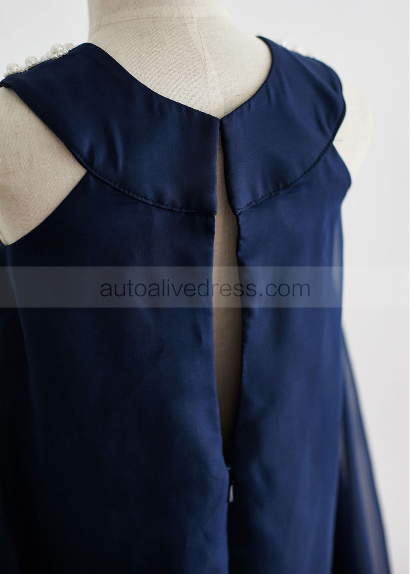 Navy Blue Chiffon Pearls Embellished Slit Back Short Flower Girl Dress