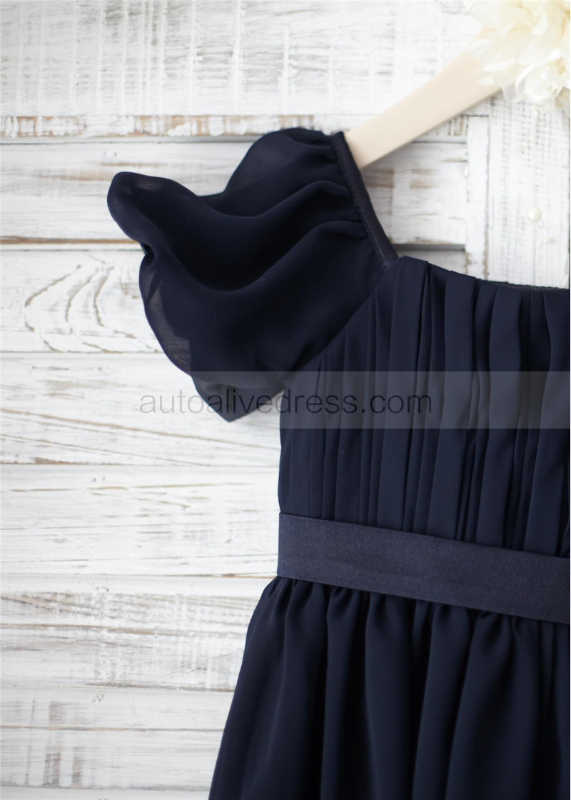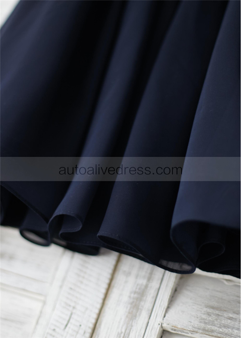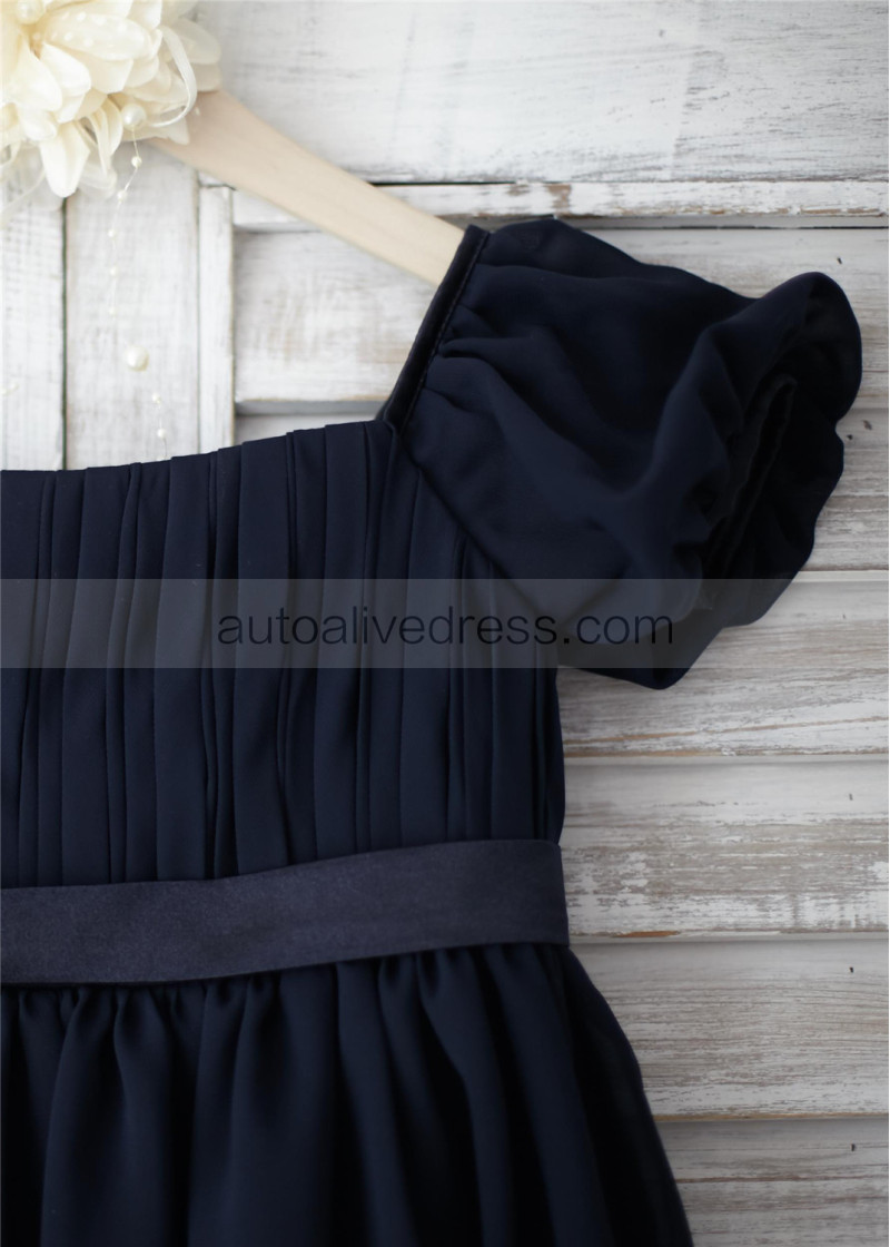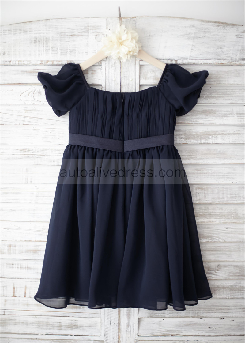 Navy Blue Chiffon Puff Sleeves Knee Length Flower Girl Dress