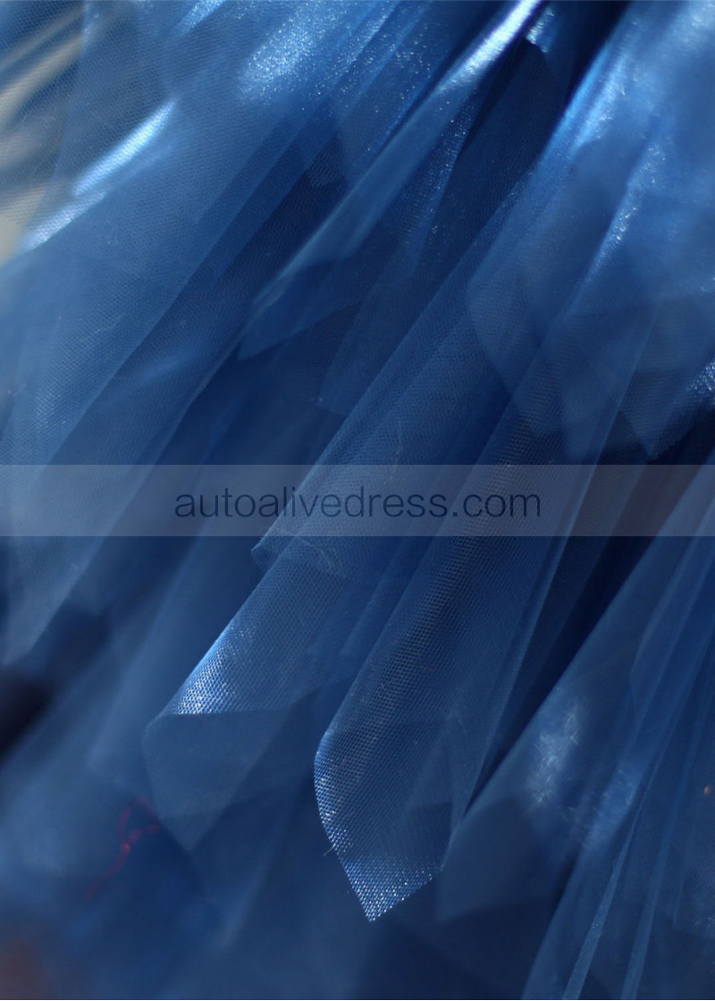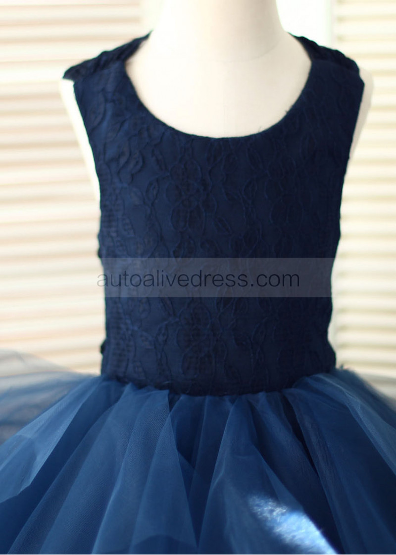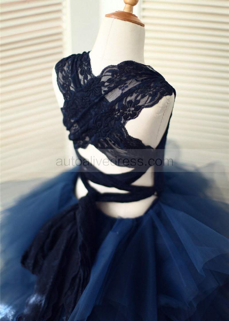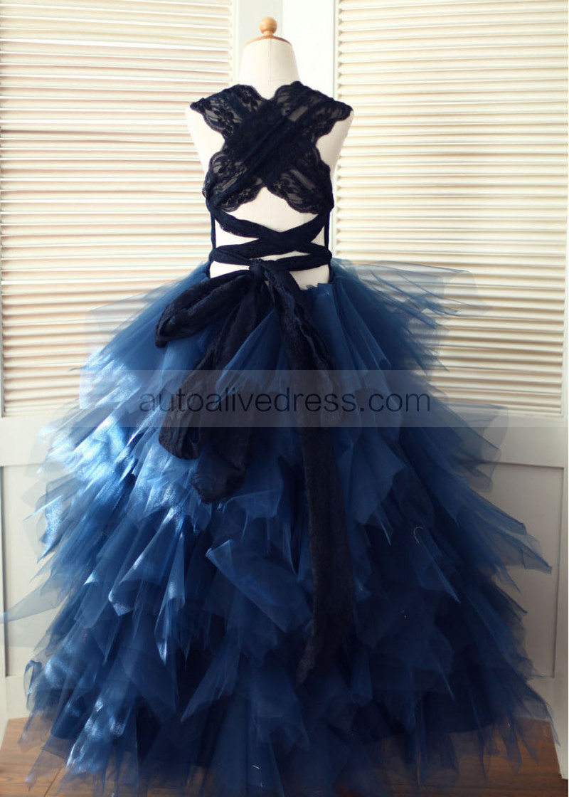 Navy Blue Lace Ruffle Tulle Ankle Length Flower Girl Dress
