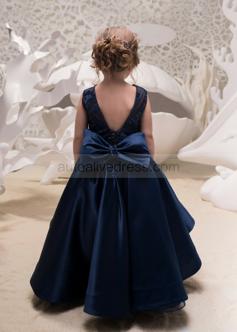 Navy Blue Lace Satin High Low Classic Flower Girl Dress
