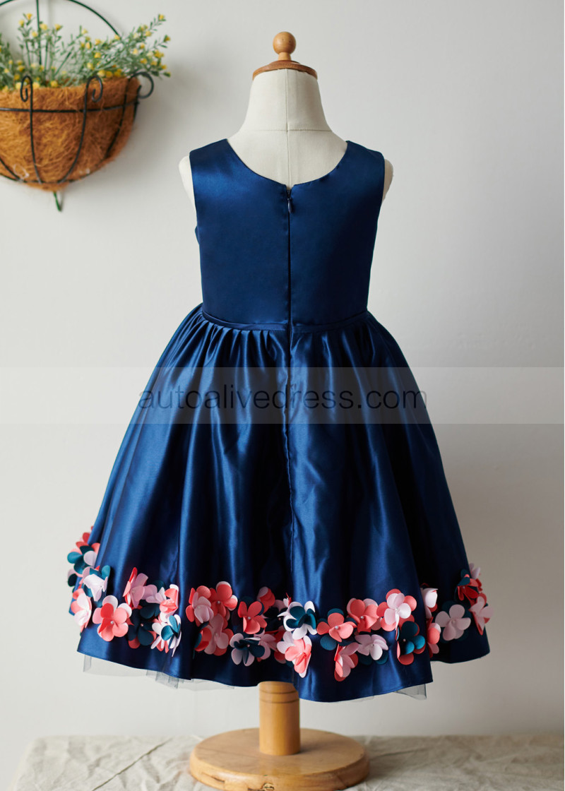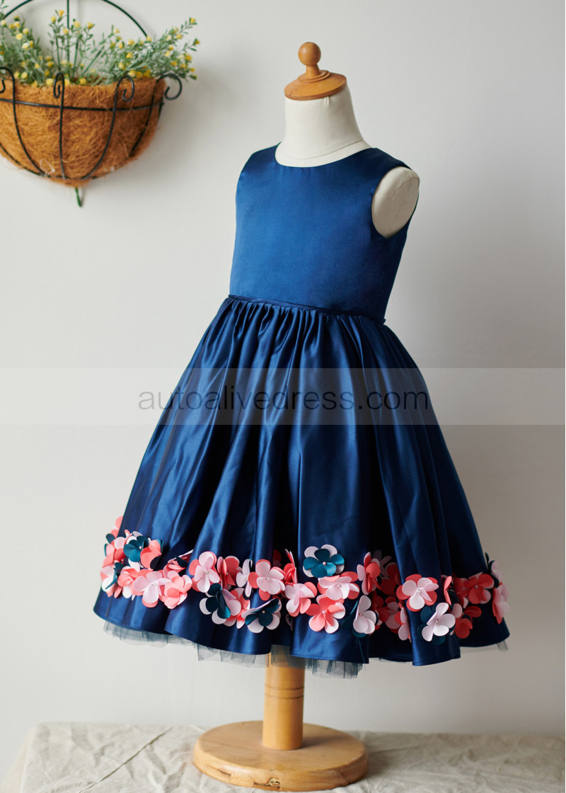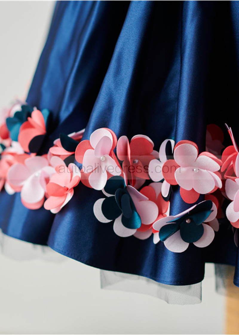 Navy Blue Satin Knee Length Flower Girl Dress With Handmade Flowers