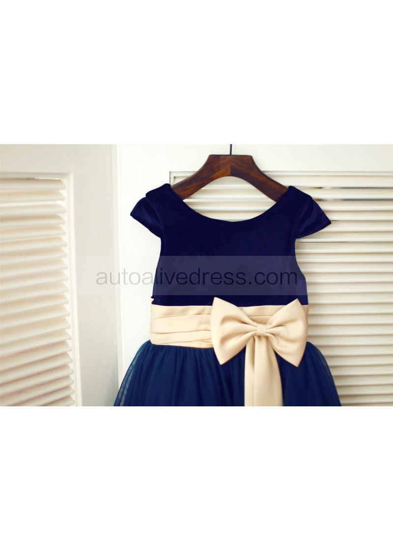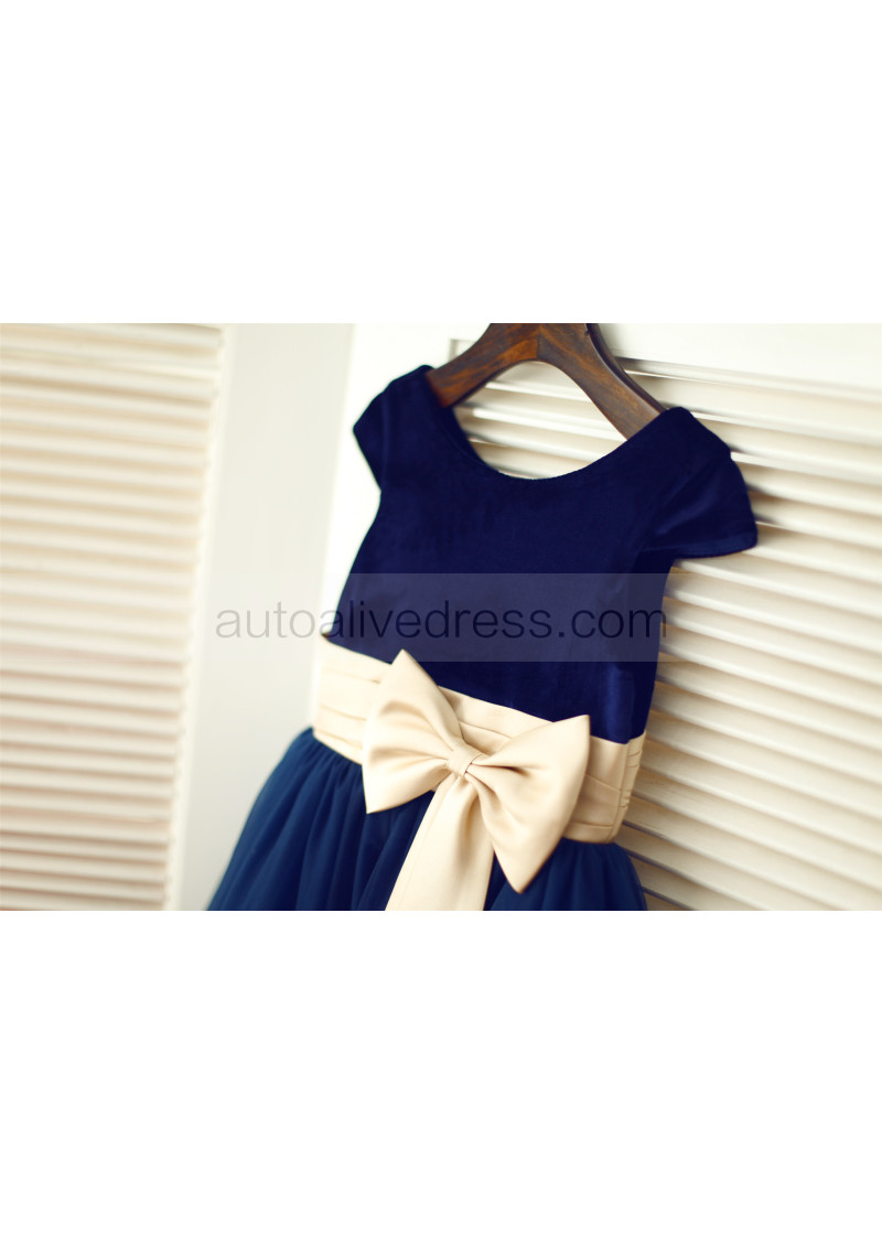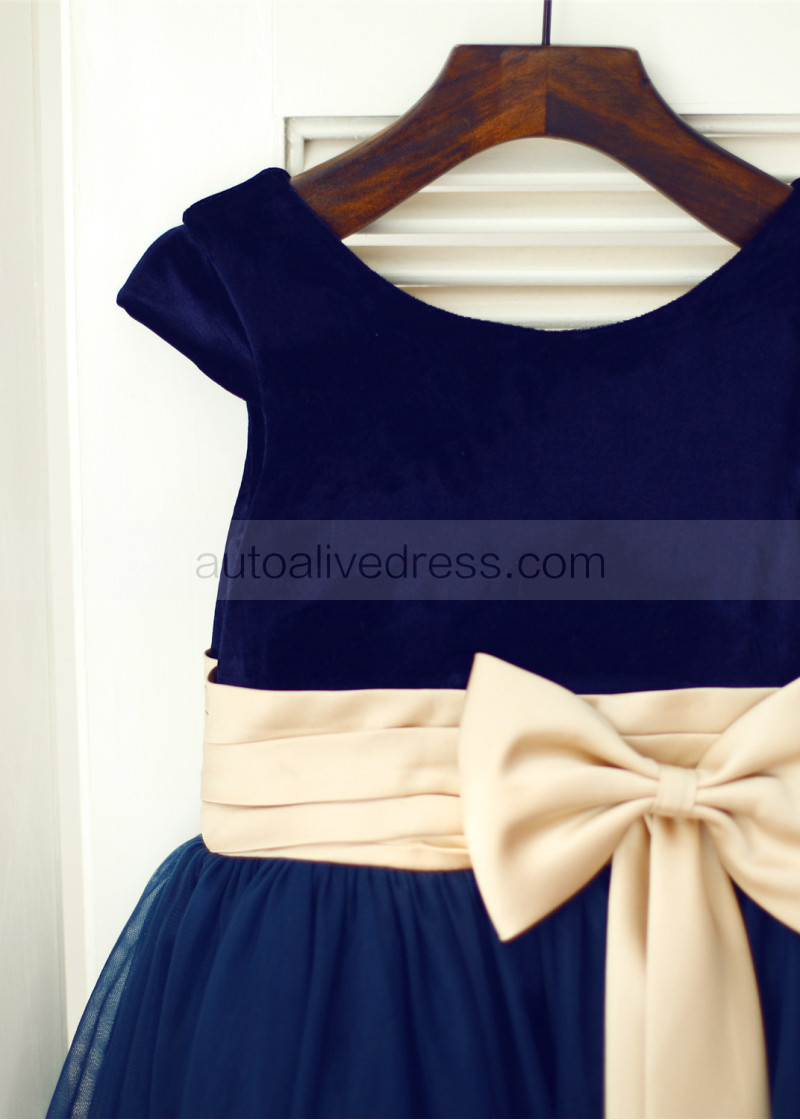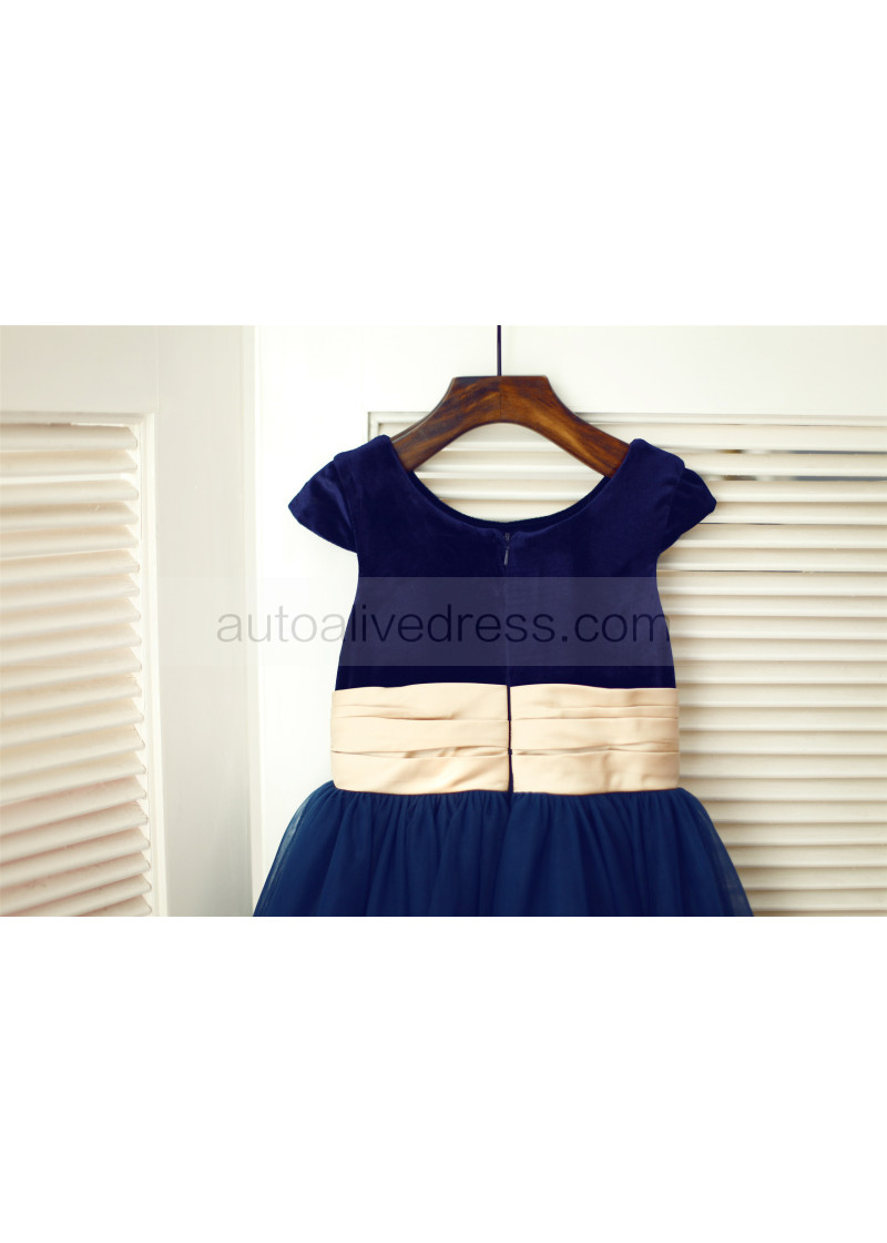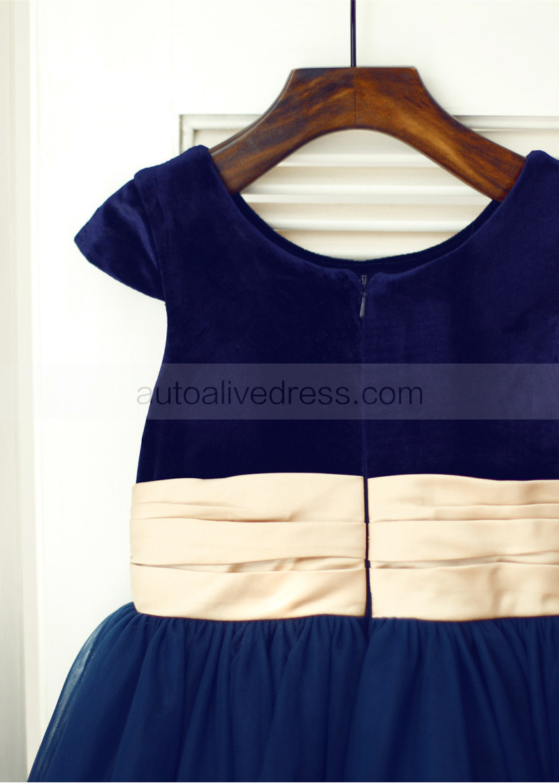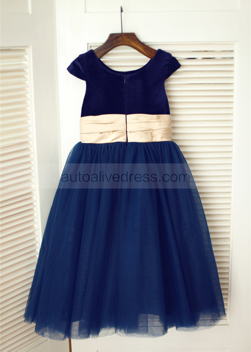Navy Blue Velvet Tulle Tea Length Flower Girl Dress