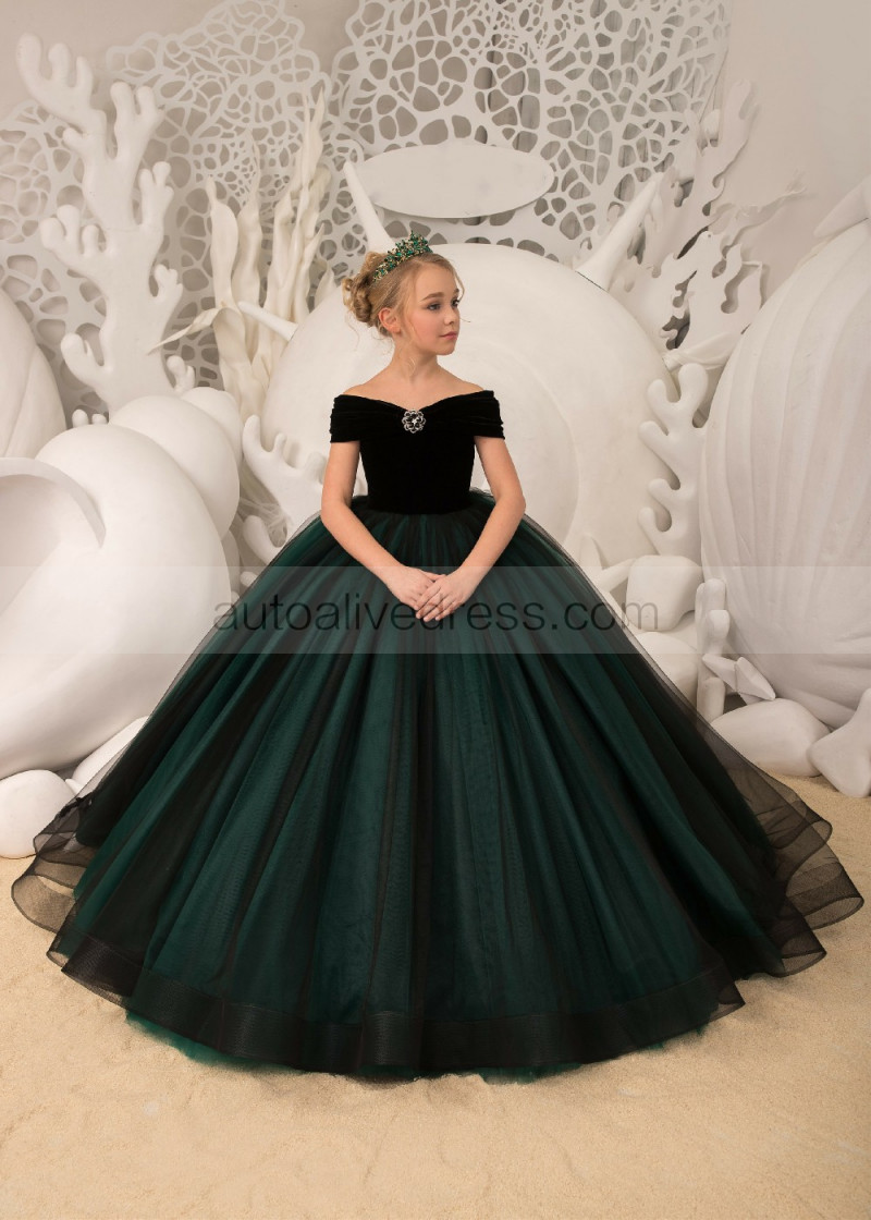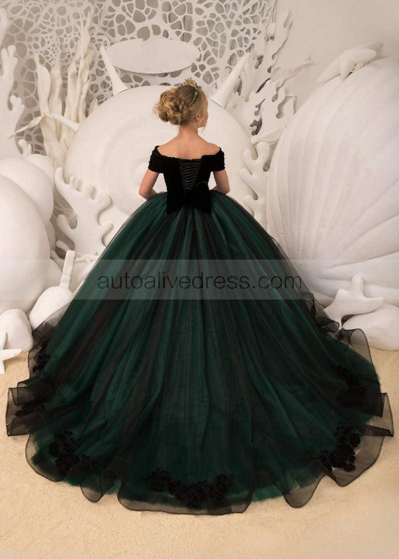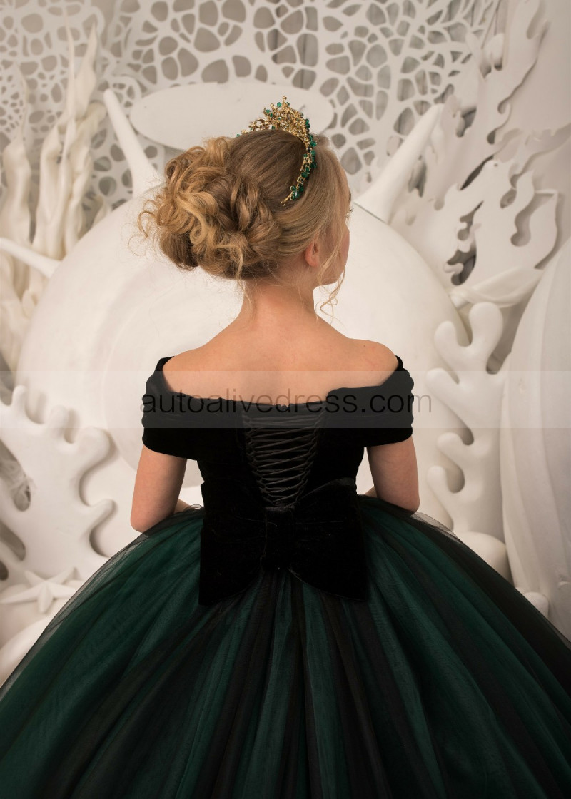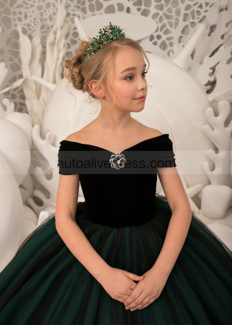Off Shoulder Black And Green Velvet Tulle Formal Flower Girl Dress