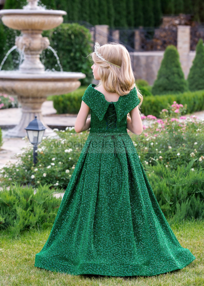 Off Shoulder Green Sequin Floor Length Flower Girl Dress