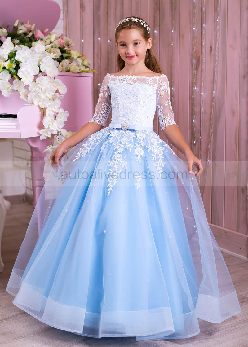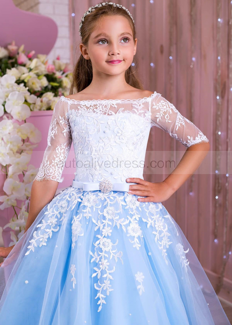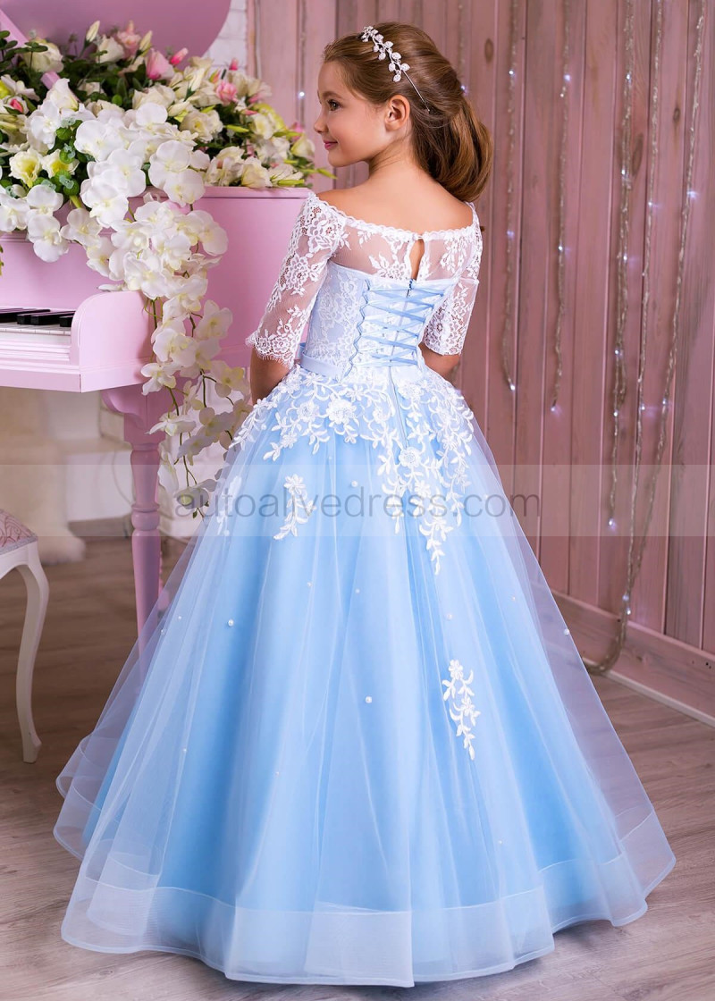 Off Shoulder White Lace Blue Tulle Pearls Embellished Flower Girl Dress